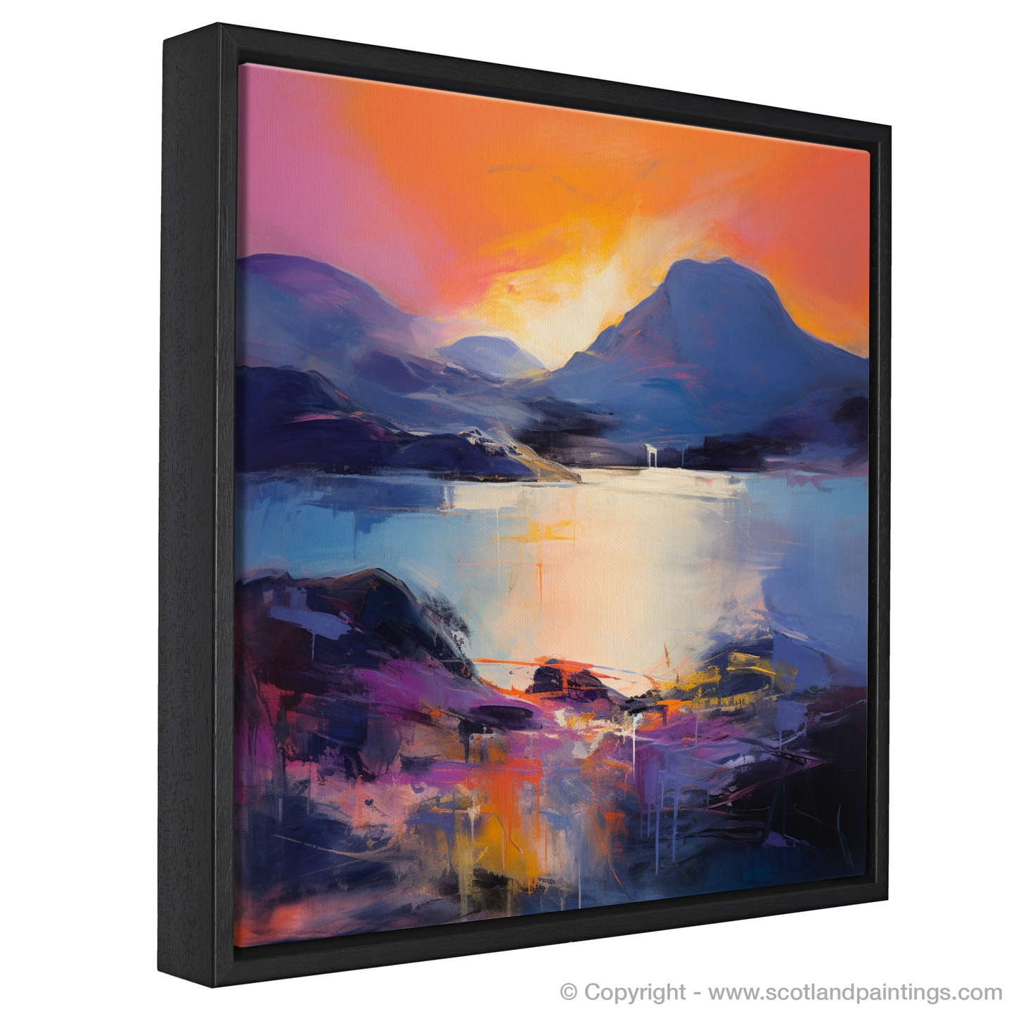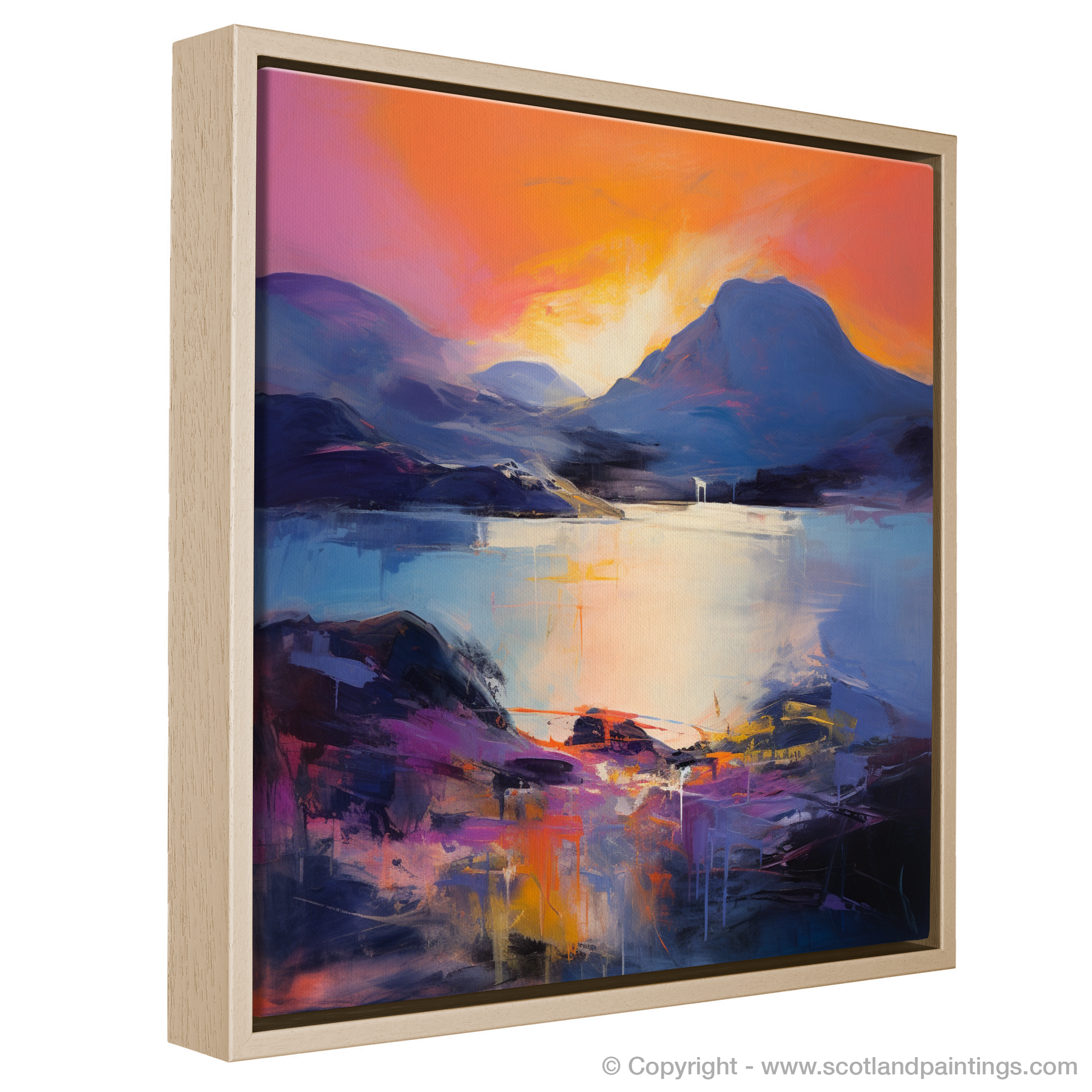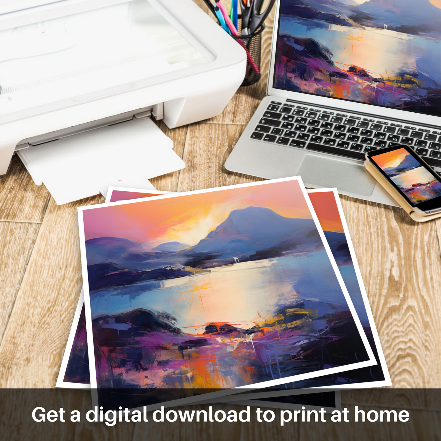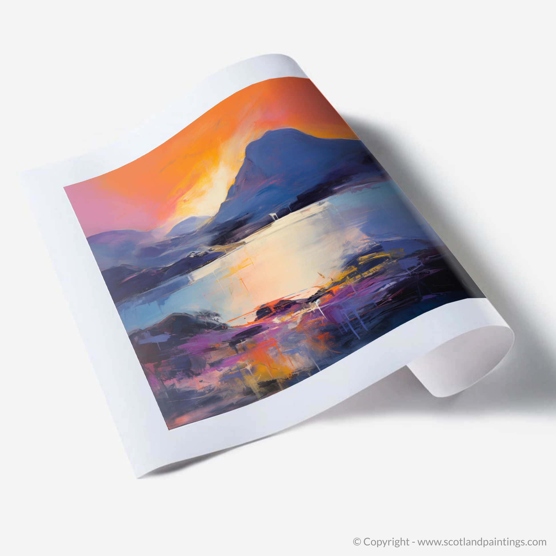 This print is not just a visual spectacle but an emotional journey. Each sweep of the brush carries the weight of the twilight air, while the abstract forms conjure the movement of the dying day's light as it retreats behind the silhouetted mountains. The convergence of warm and cool tones captures the ephemeral beauty of the cove, creating a piece that is as turbulent as it is poised, echoing the untamed heart of the Scottish Highlands.