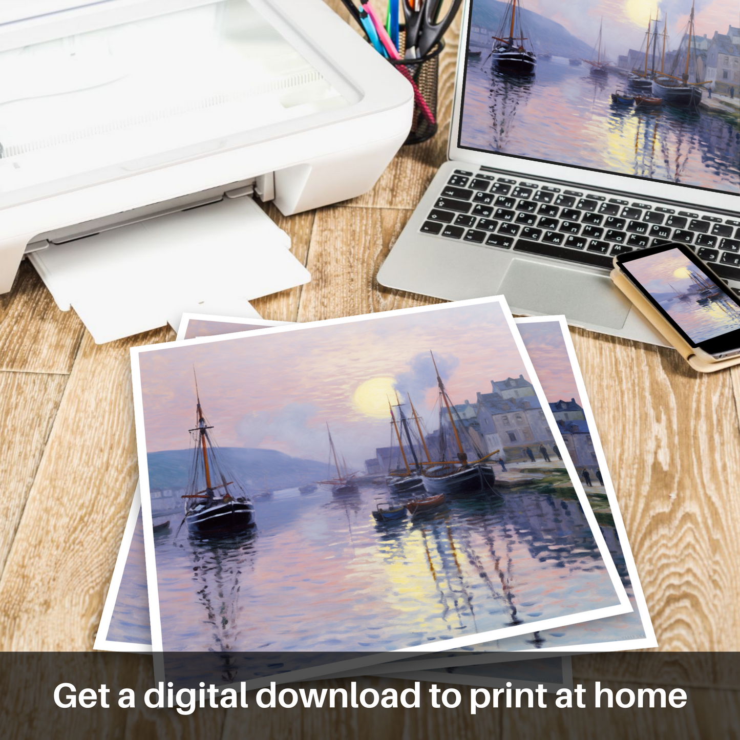 As the sun dips below the horizon, casting a warm glow over Millport Harbour, this enchanting print captures the serene beauty of the Scottish coast at the close of day. Immerse yourself in the soothing tones of dusk, where the sky meets the sea in a symphony of lavender, peach, and gentle blues. The impressionistic brushstrokes lend a dreamlike quality, softly blending hues to reflect the tranquil waters and the radiance of the setting sun.