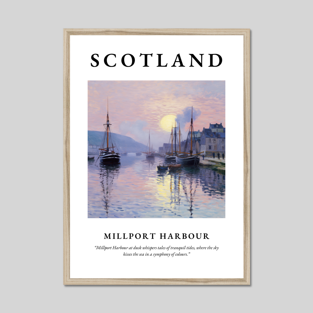 The poster is available in your choice of black, white, or natural wood-effect frames, allowing you to personalise it to suit your decor. At the top, "SCOTLAND" is boldly displayed, embodying the spirit of this enchanting land. Below, the painting captures the peaceful serenity of Millport Harbour at dusk, as the sky and sea merge in a symphony of pastels. Each brushstroke evokes the tranquil tides that gently lap against the moored boats, whispering tales of a day well spent. Beneath the painting, the poetic quote adds depth and emotion, resonating with those who hold a connection to this magical place.