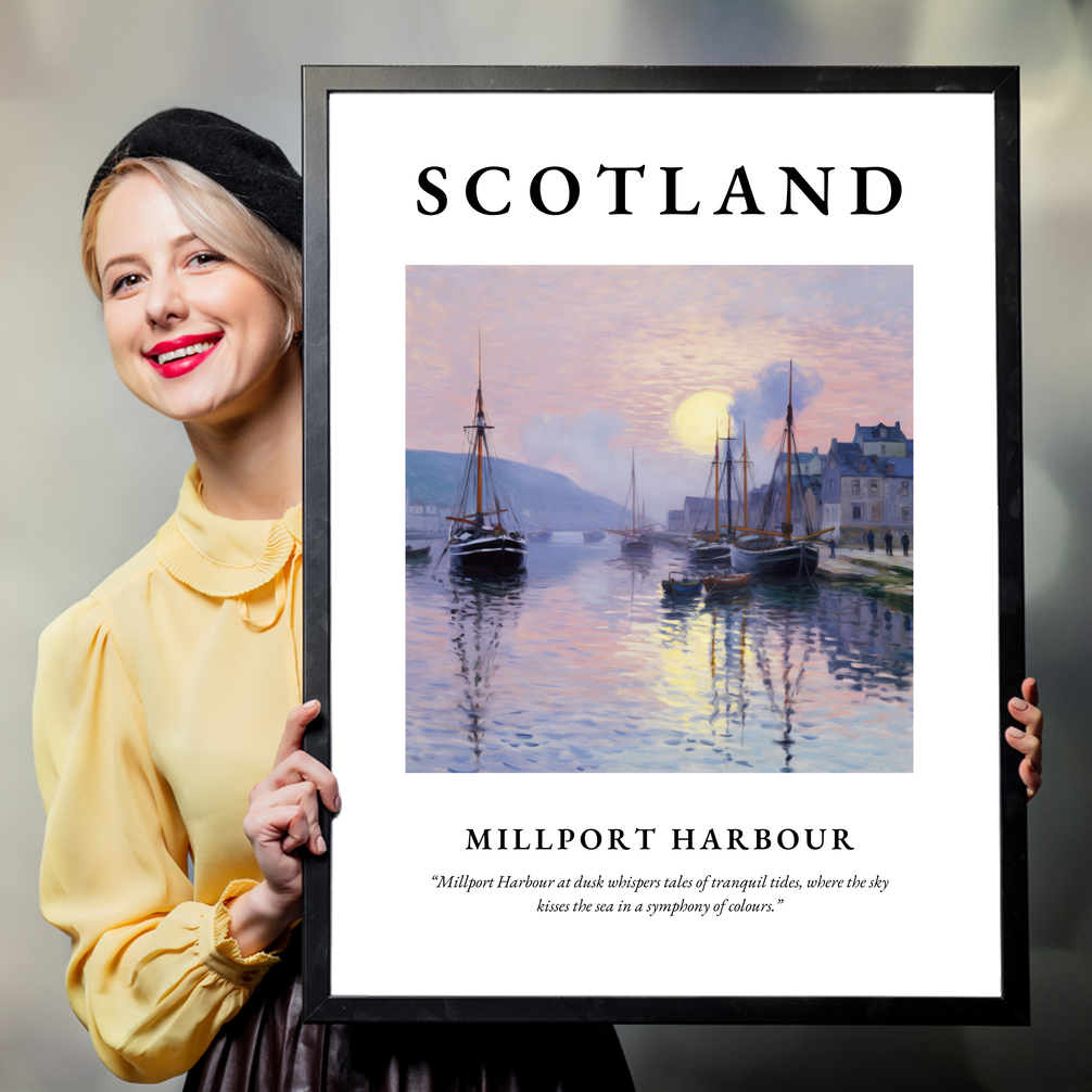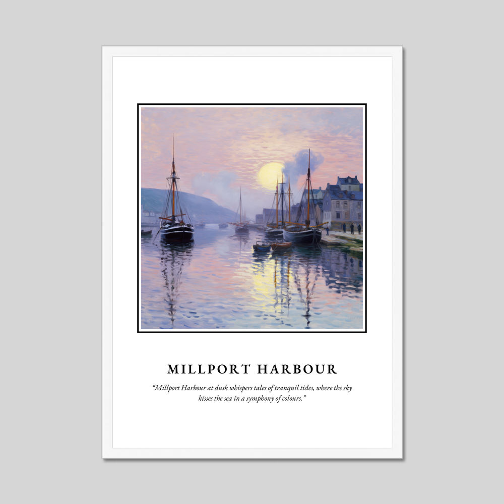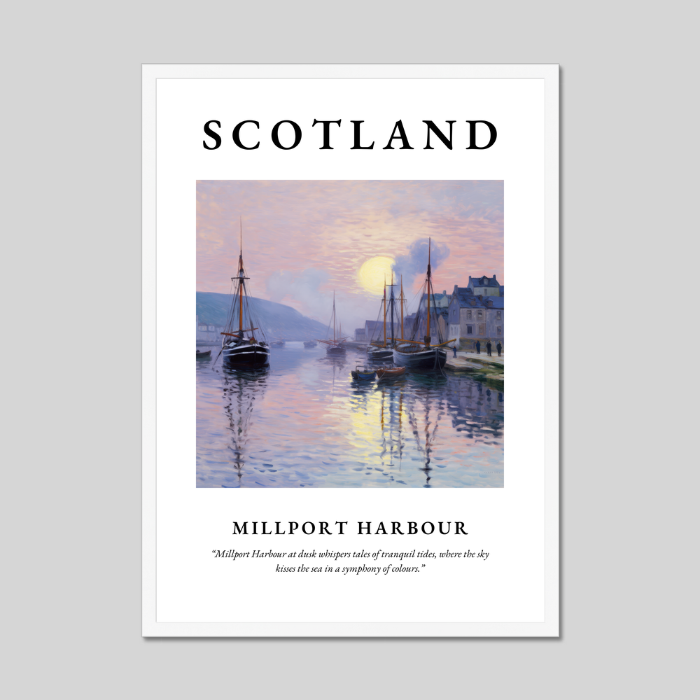 Millport Harbour, situated on the Isle of Cumbrae, is a hidden gem in Scotland’s architectural and natural landscape. Known for its picturesque views and tranquil atmosphere, it has long been a cherished destination for visitors seeking solace and beauty by the sea. In our poster, the impressionistic rendering of the harbour at dusk perfectly reflects Millport's enchanting ambiance, where the ever-changing light paints the sky with soft hues, echoing the artwork’s harmonious palette.