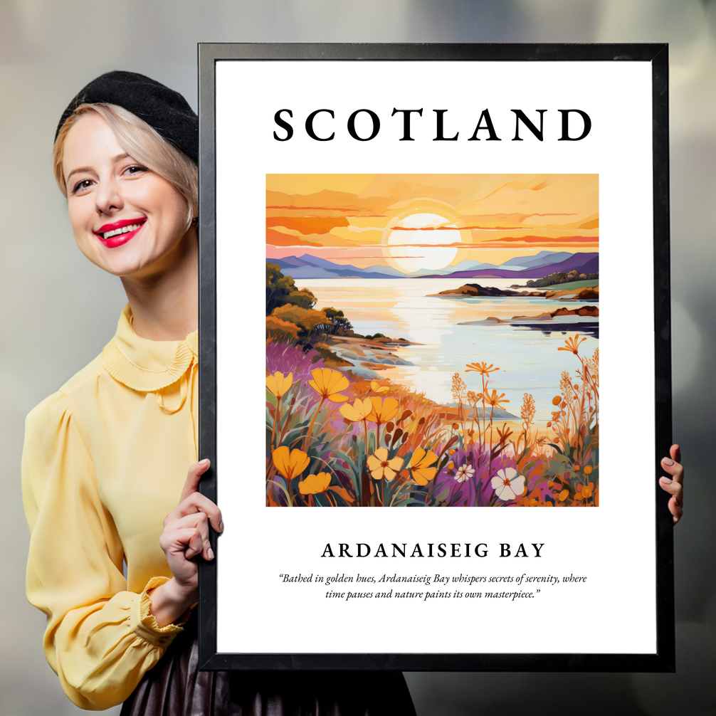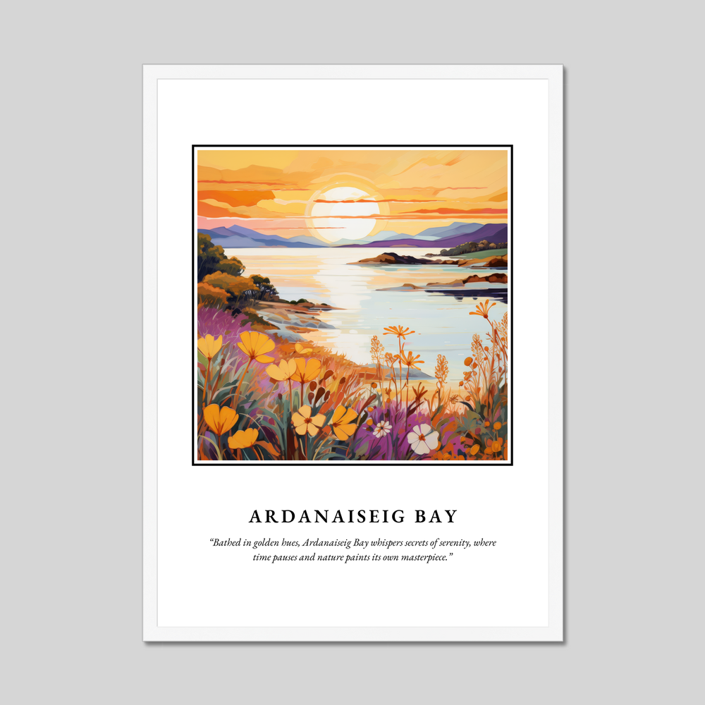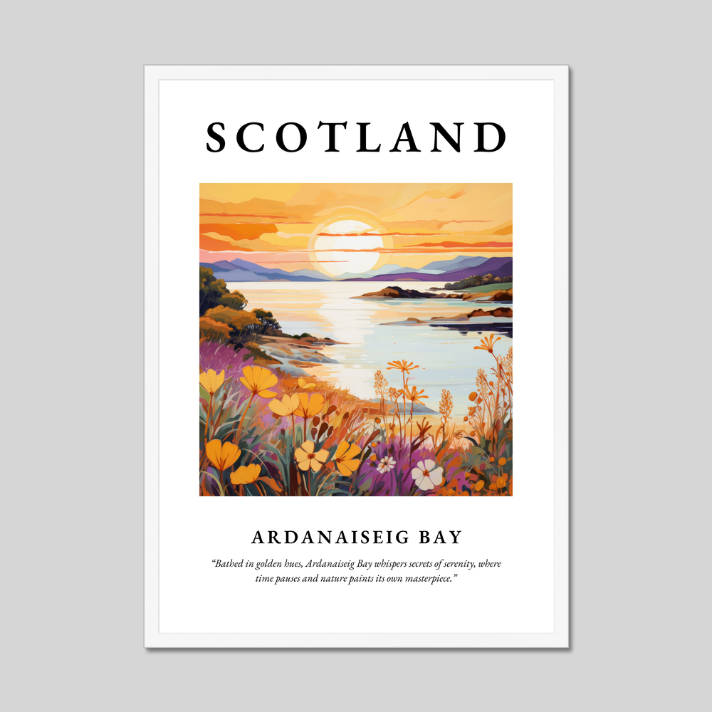 The piece begins with the bold declaration of “SCOTLAND” at the top, capturing the allure of the Scottish landscapes. The heart of this print is a breathtaking painting done in the Naive Art style, portraying Ardanaiseig Bay bathed in the soft glow of the setting sun. The reflective waters and the vivid array of wildflowers in the foreground invite viewers to lose themselves in nature’s embrace. Below this magnificent scene, the quote “Bathed in golden hues, Ardanaiseig Bay whispers secrets of serenity, where time pauses and nature paints its own masterpiece” perfectly encapsulates the peaceful allure of this hidden gem.