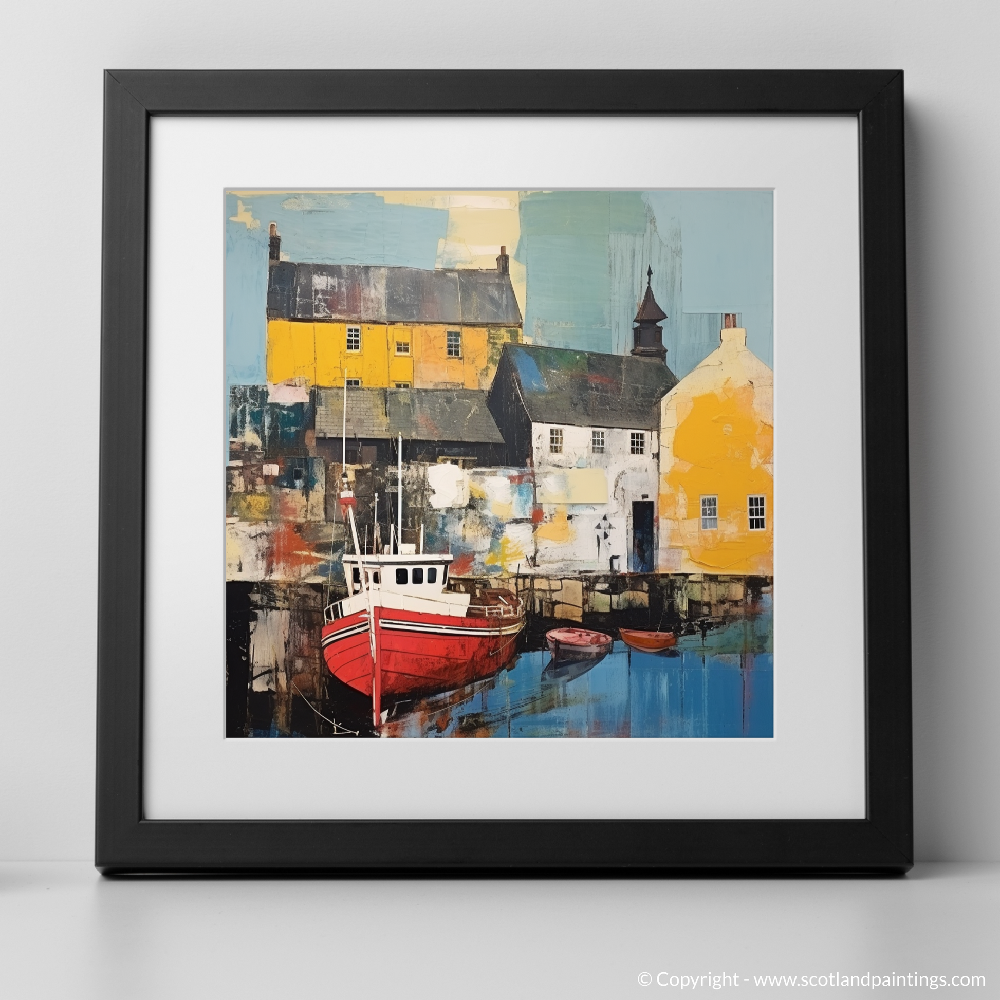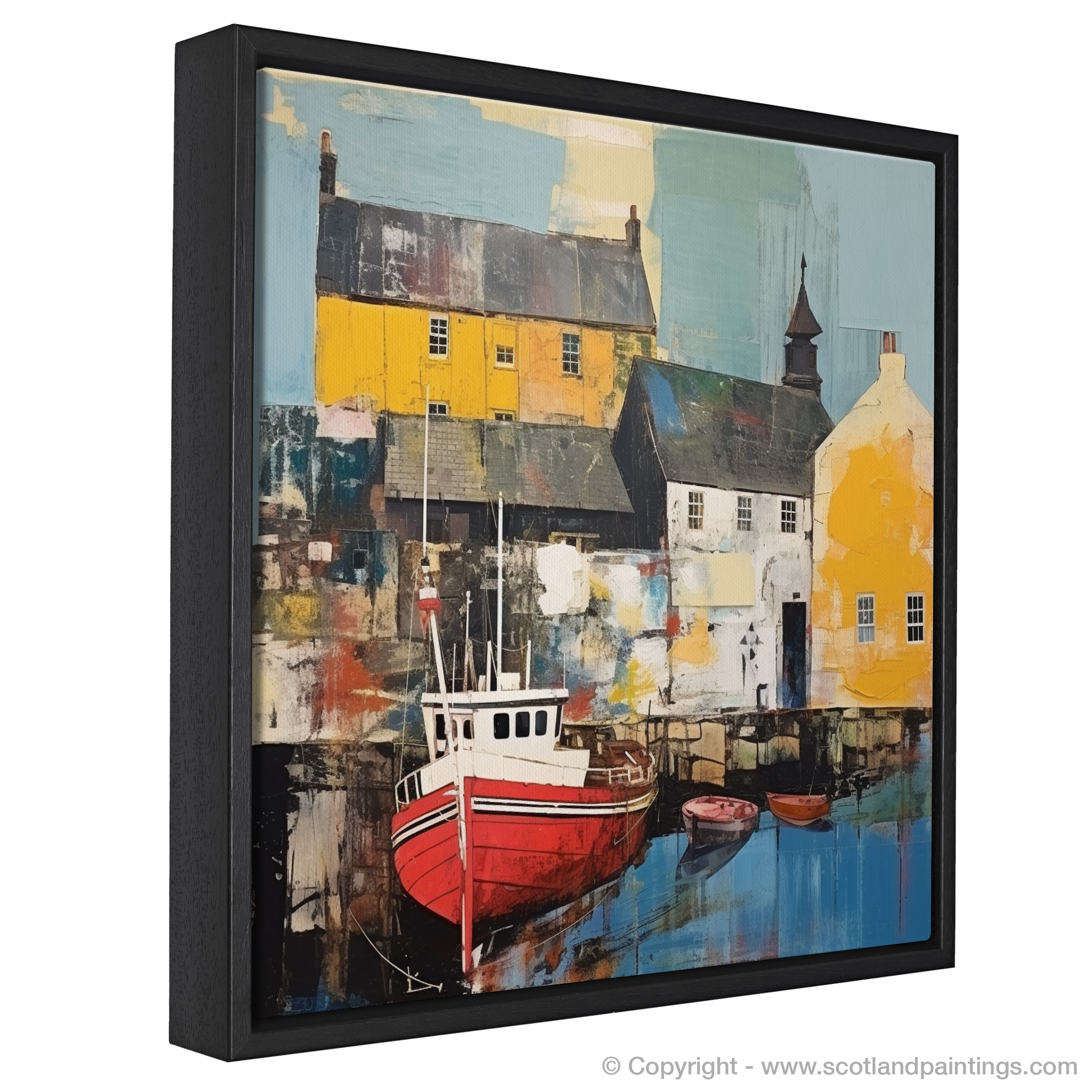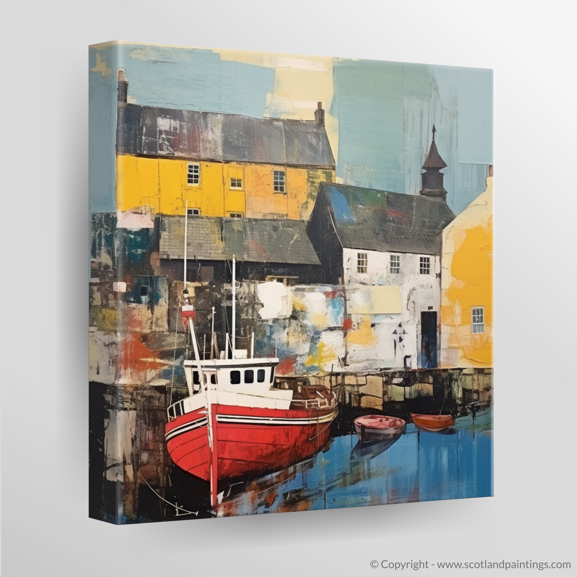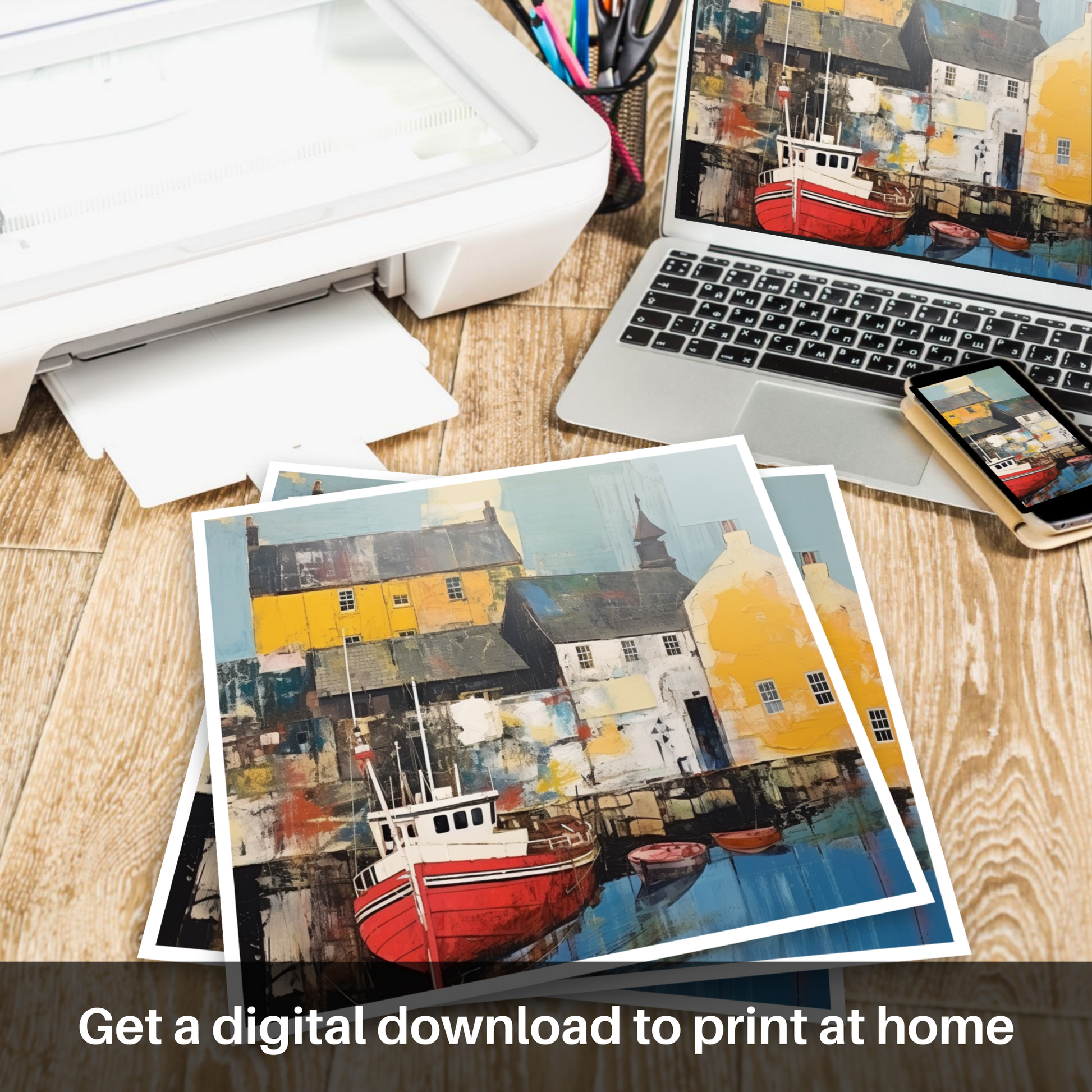 This visually arresting piece features an eclectic mix of texture and colour, with bold hues overlapping and intermixing to form an image that is as tantalising as the town's own rich history. The foreground is dominated by a bold red fishing boat, anchored still in the calm blue waters, reflecting a sense of serene maritime tranquillity. Flanking this centrepiece are smaller vessels, their subdued colours complementing the striking primary boat.