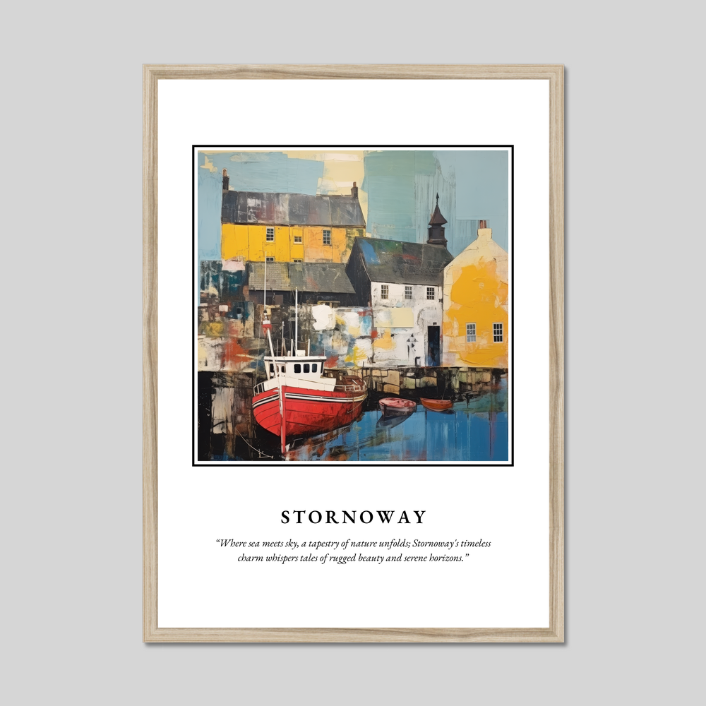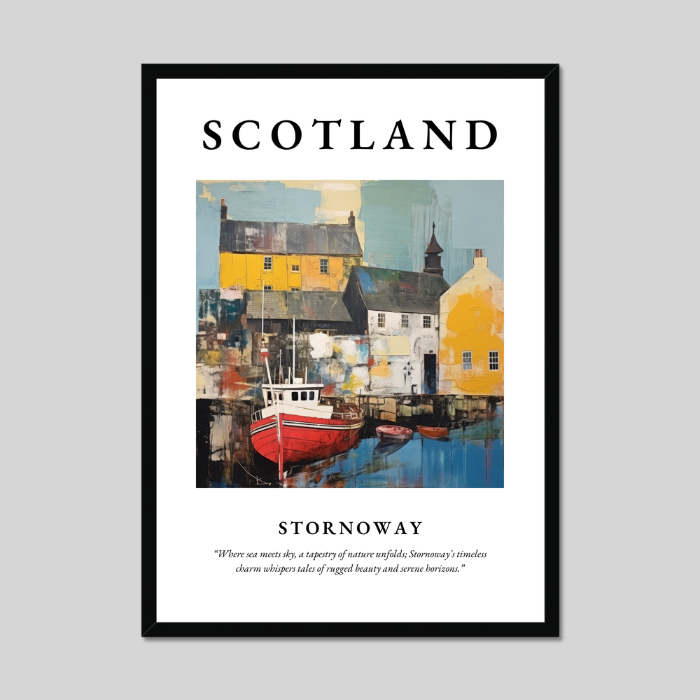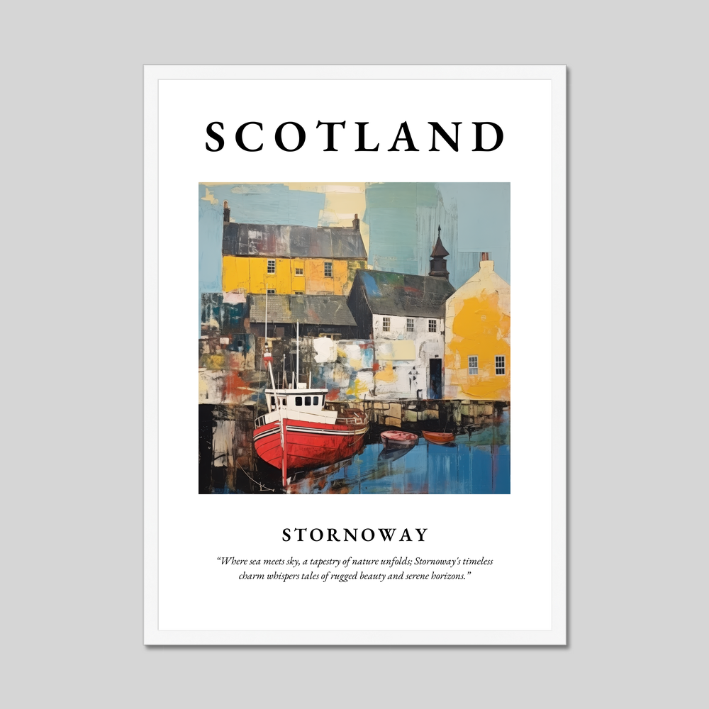 At the top, the word "SCOTLAND" commands attention in bold lettering, setting the stage for the enchanting painting below. The depiction of Stornoway is a vivid celebration of colour and form. Rich blues and striking reds blend harmoniously with warm yellows and subtle earth tones, creating a lively scene that pays homage to the coastal town’s rugged beauty. Below, the poetic line “Where sea meets sky, a tapestry of nature unfolds; Stornoway's timeless charm whispers tales of rugged beauty and serene horizons.” adds a touch of lyrical elegance, inviting viewers to lose themselves in the tranquil yet vibrant tableau.