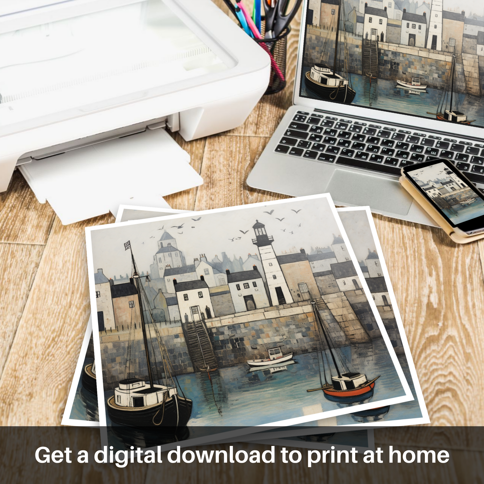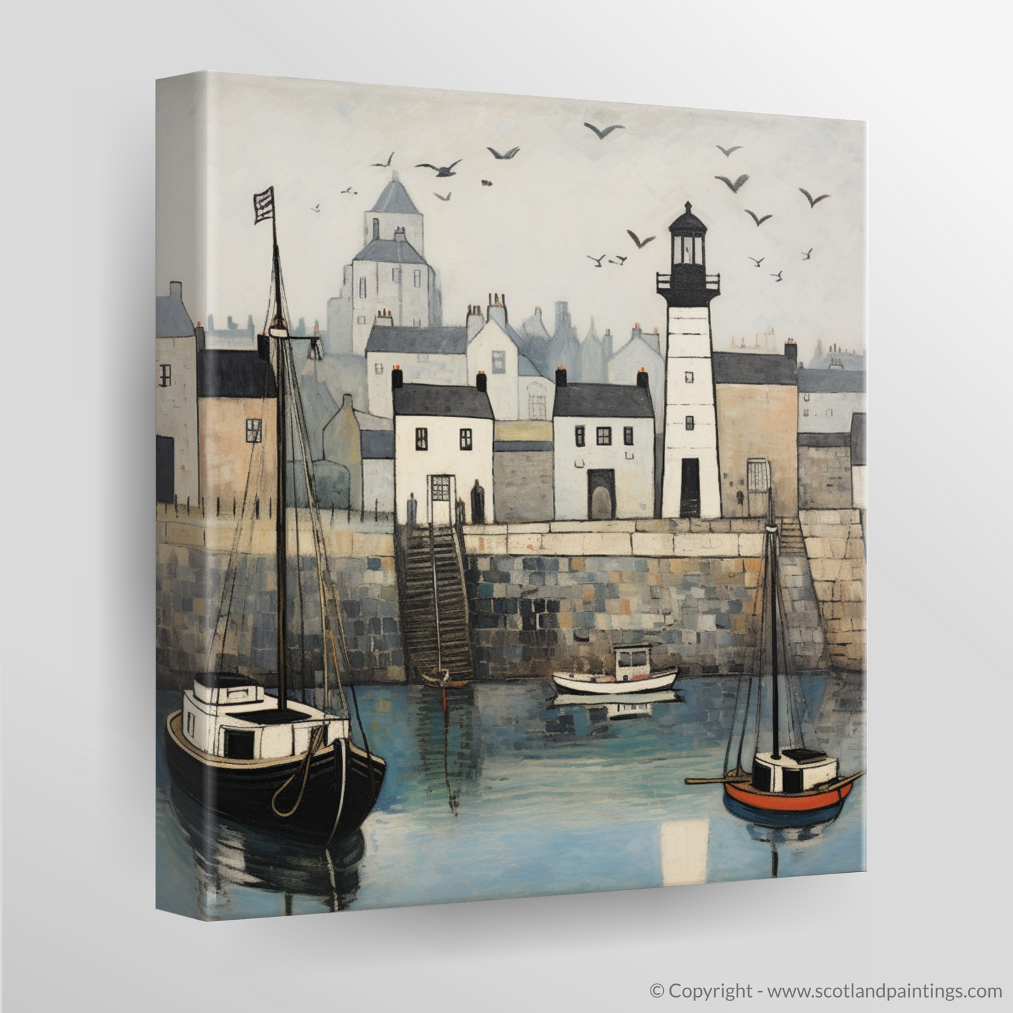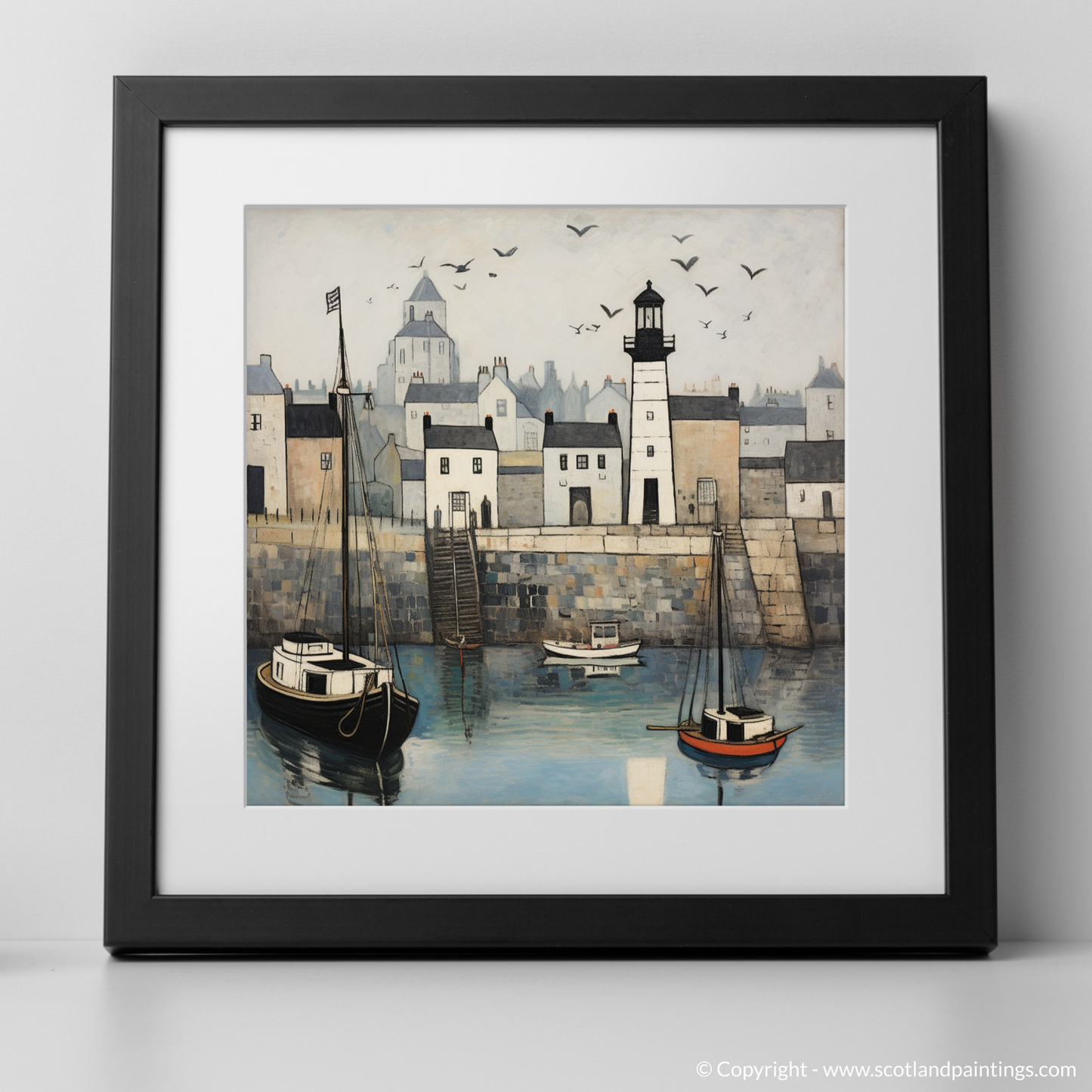 A focal point of this picturesque setting is the timeless lighthouse sitting solidly upon the harbour wall. Its monochrome form stands out, anchoring the composition, while also guiding the eyes to the flight of seagulls that swirl playfully above. These birds add a dynamic movement to the piece, complementing the stillness of the boats below.