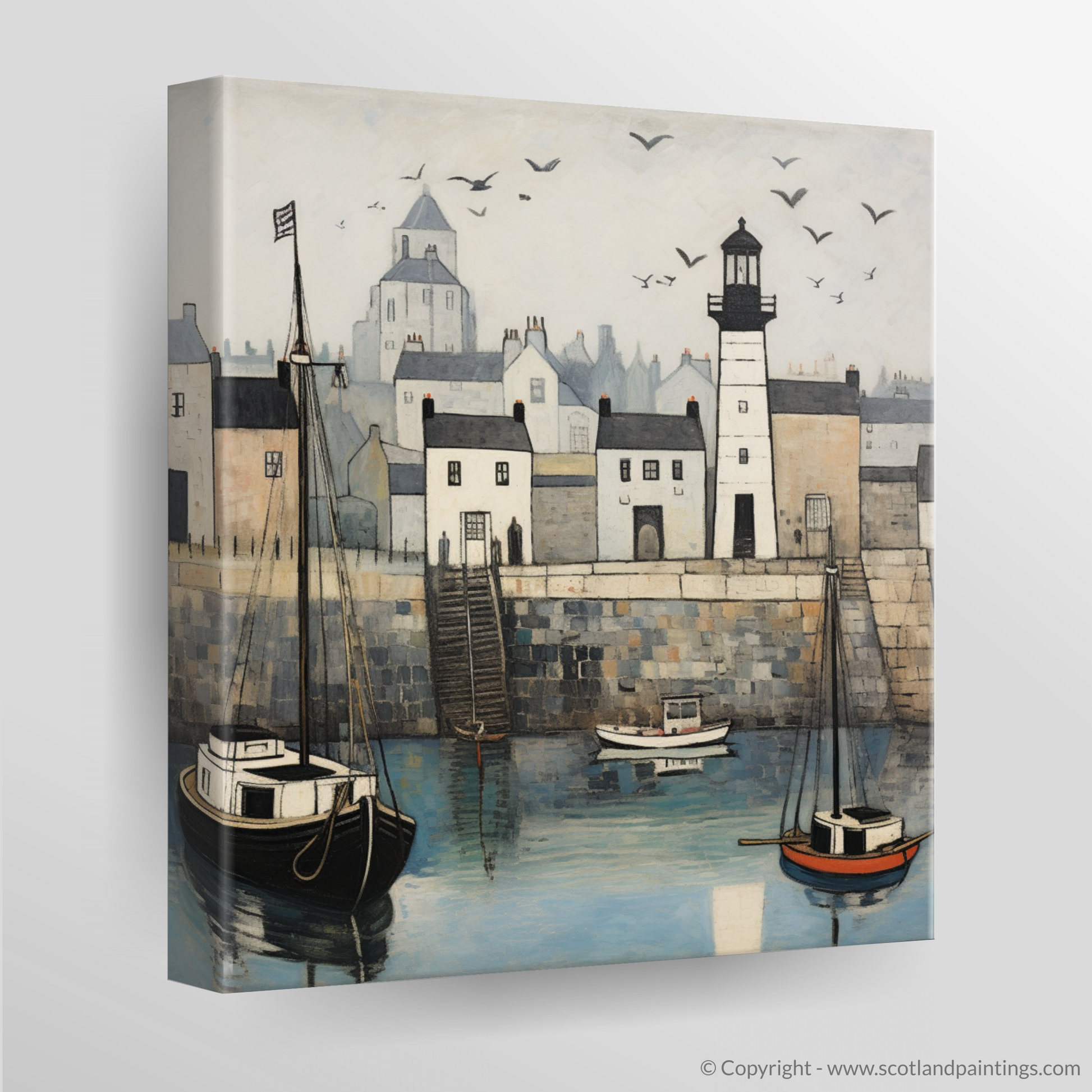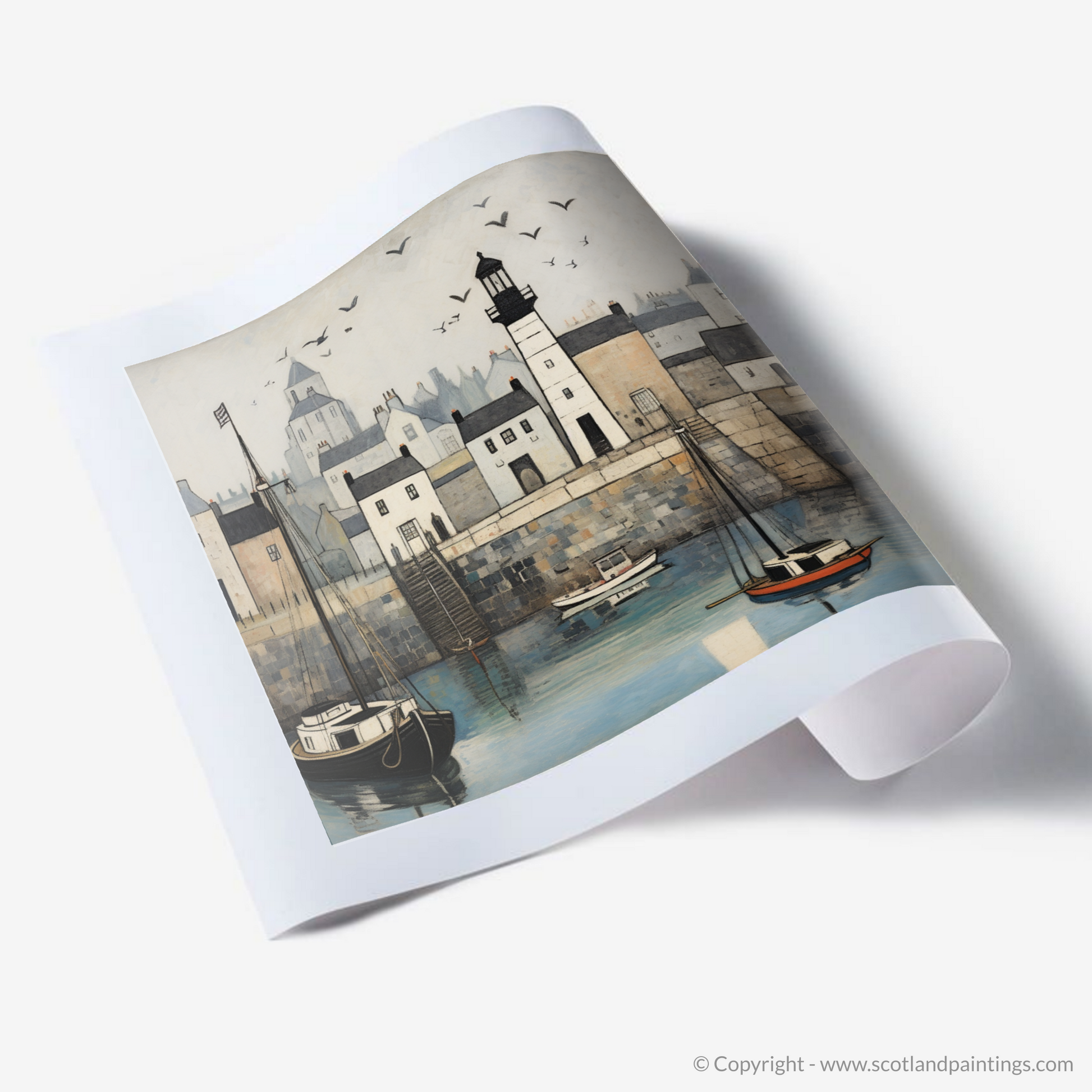 Behind, the quaint stone houses nestle closely together, their varied shapes and sizes adding interest and depth. The soft, pastel hues of these dwellings contrast with the more pronounced outlines of the architecture, presenting an alluring puzzle of shadows and light that captures the distinctive atmosphere of a Scottish harbour town.