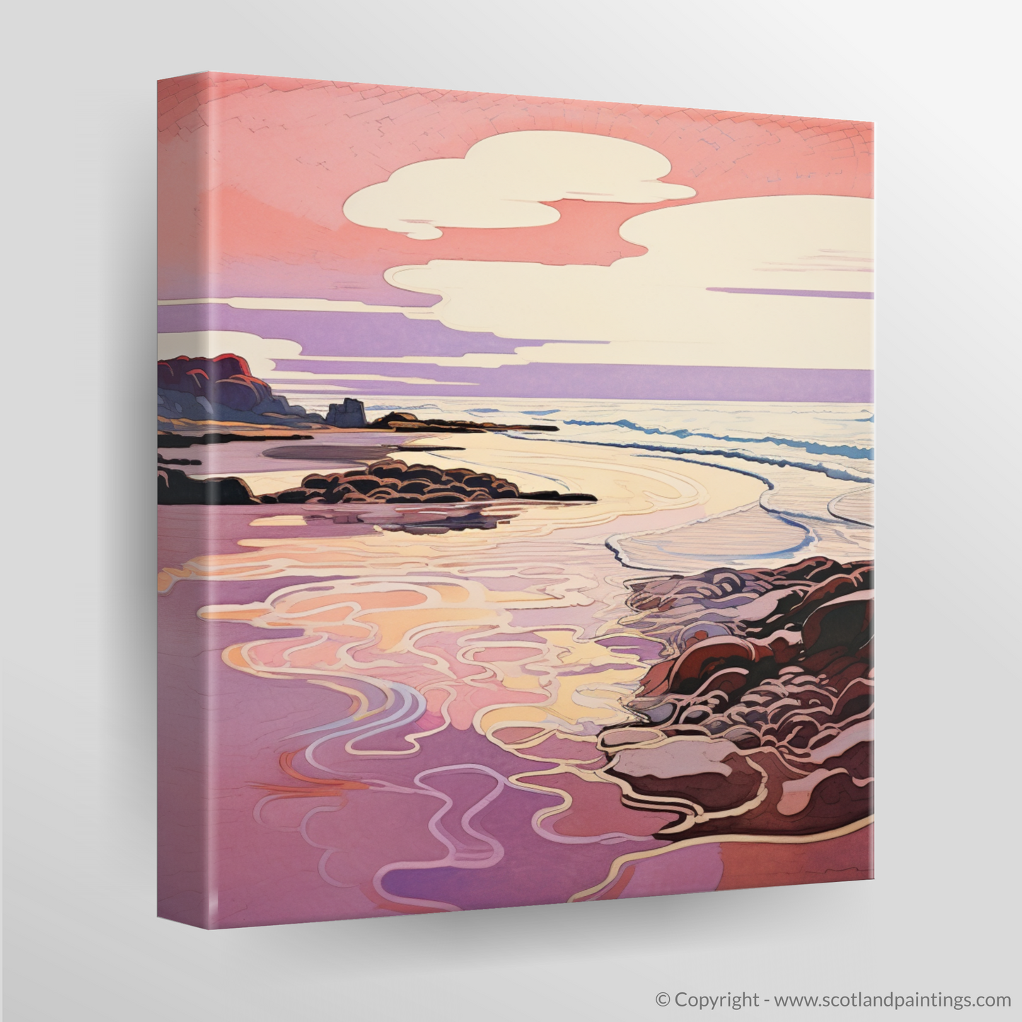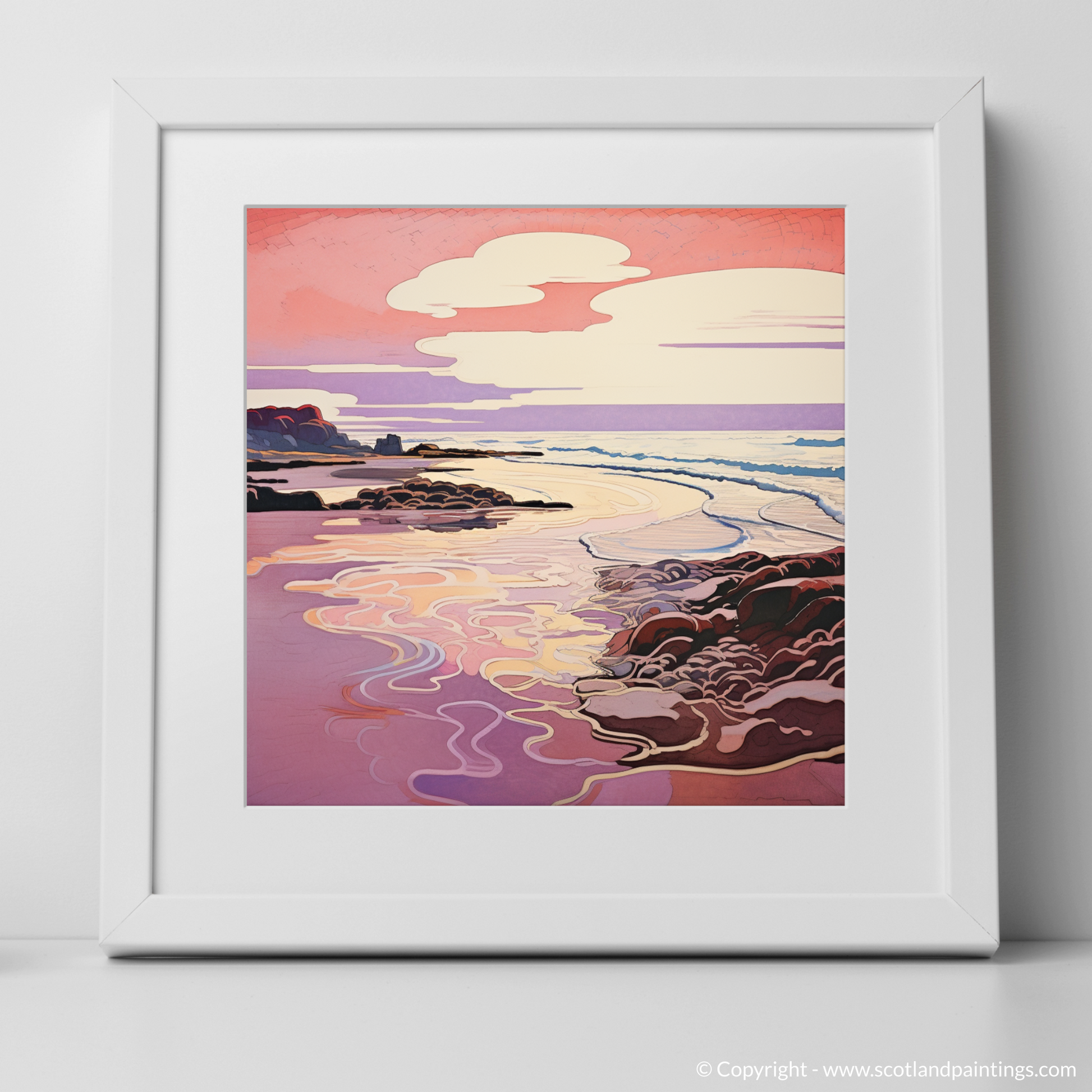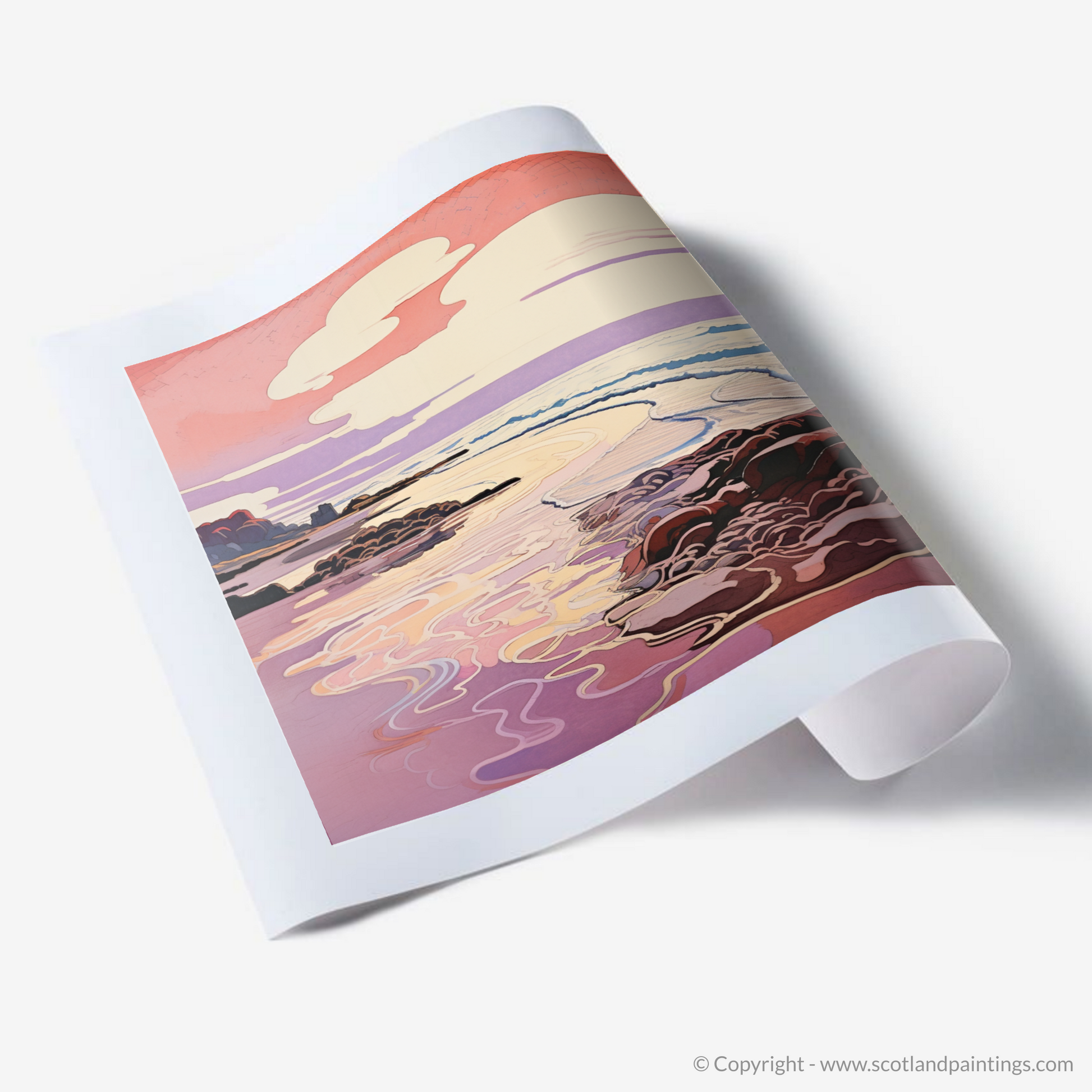 Nestled within our 'Scottish Beaches' collection, this print offers an escape to a corner of Scotland famed for its picturesque sunset views. It is more than just a piece of art; it is an invitation to gaze into a world where nature's grace is enhanced by the fluidity of Art Nouveau elegance, making it a perfect addition to any space seeking a touch of tranquillity and aesthetic refinement.