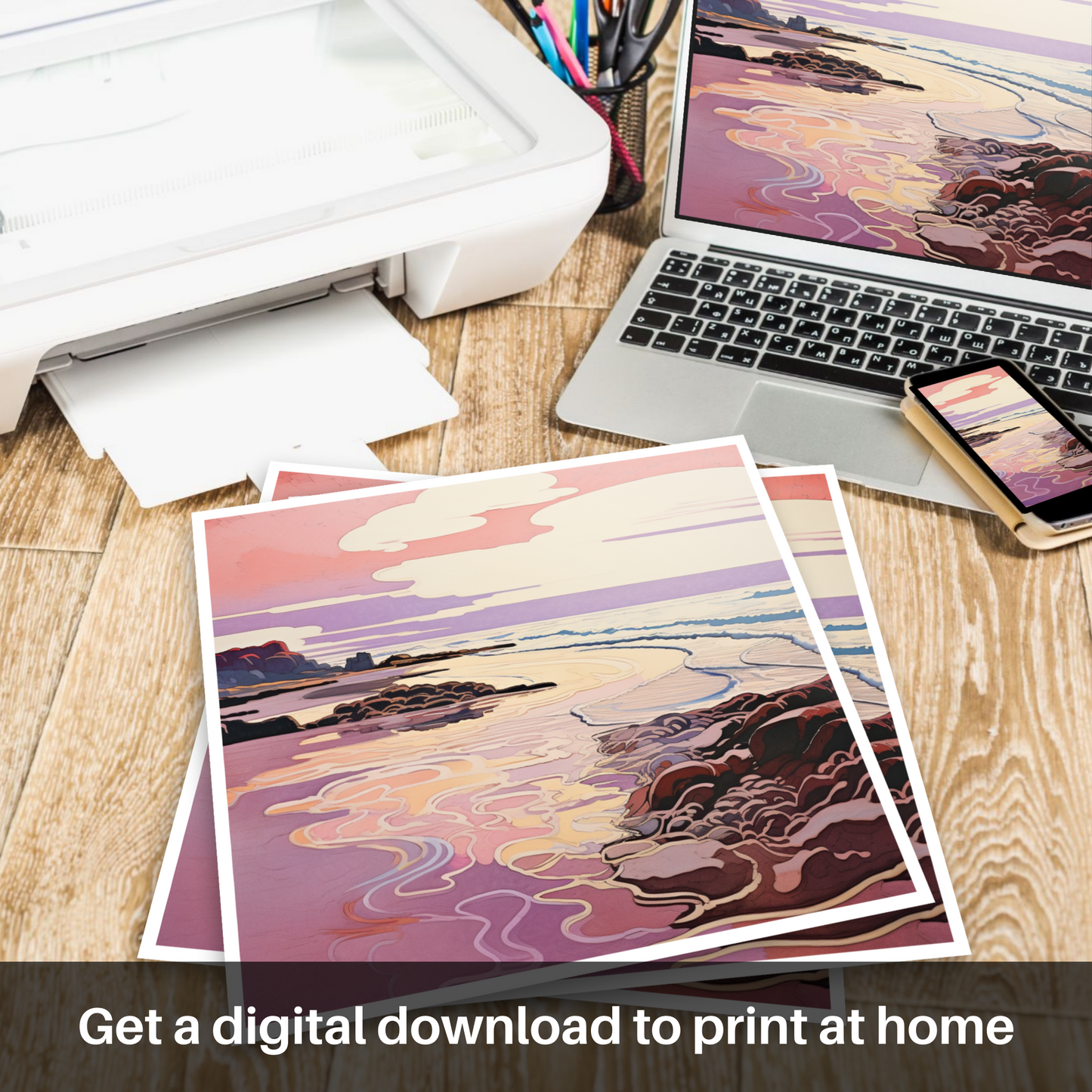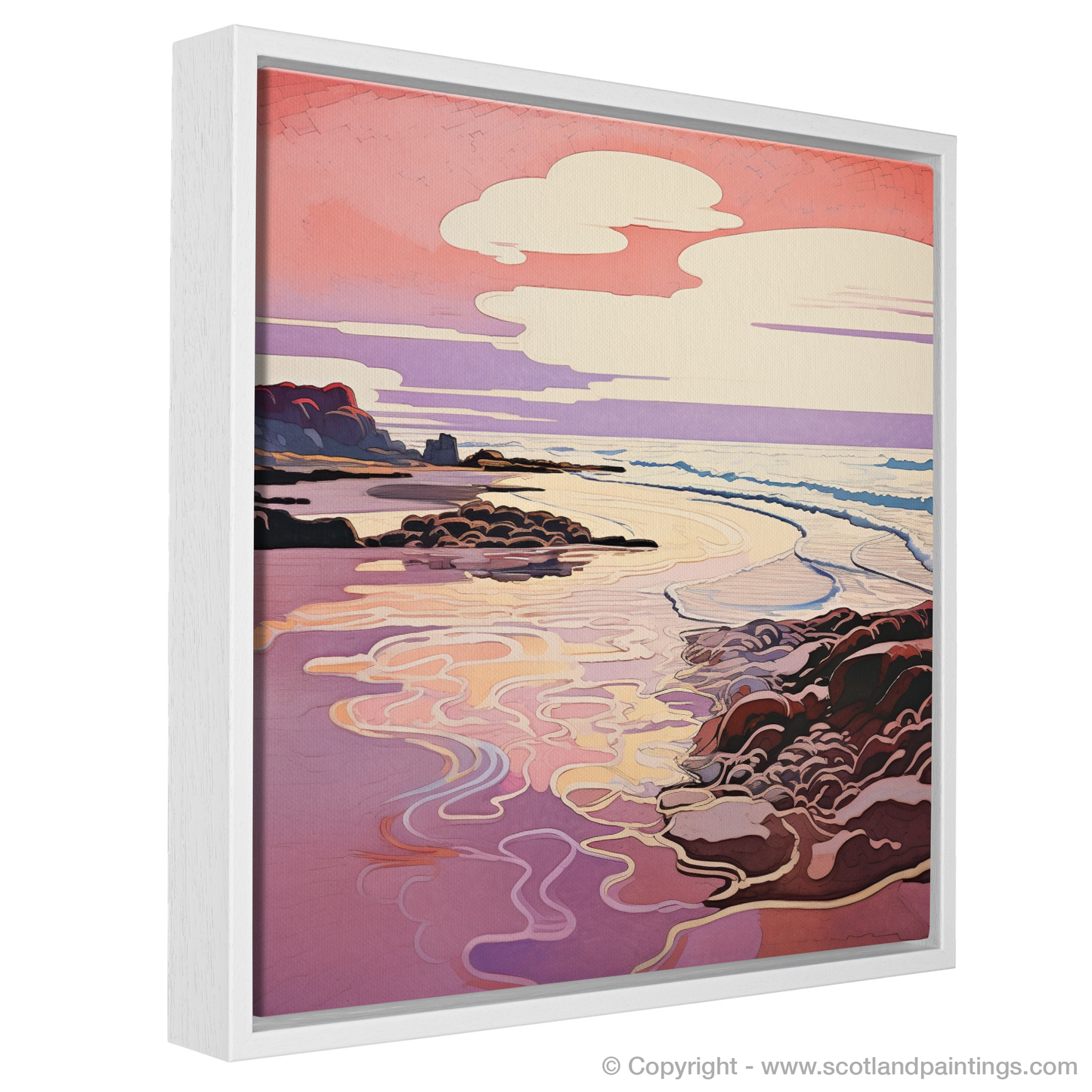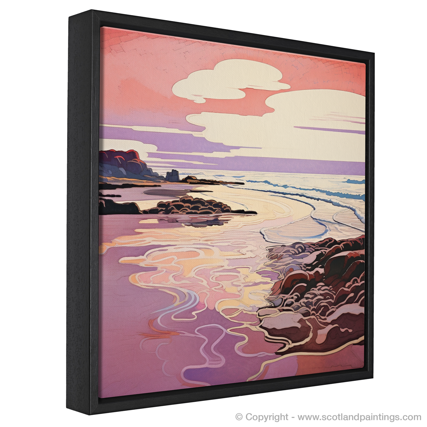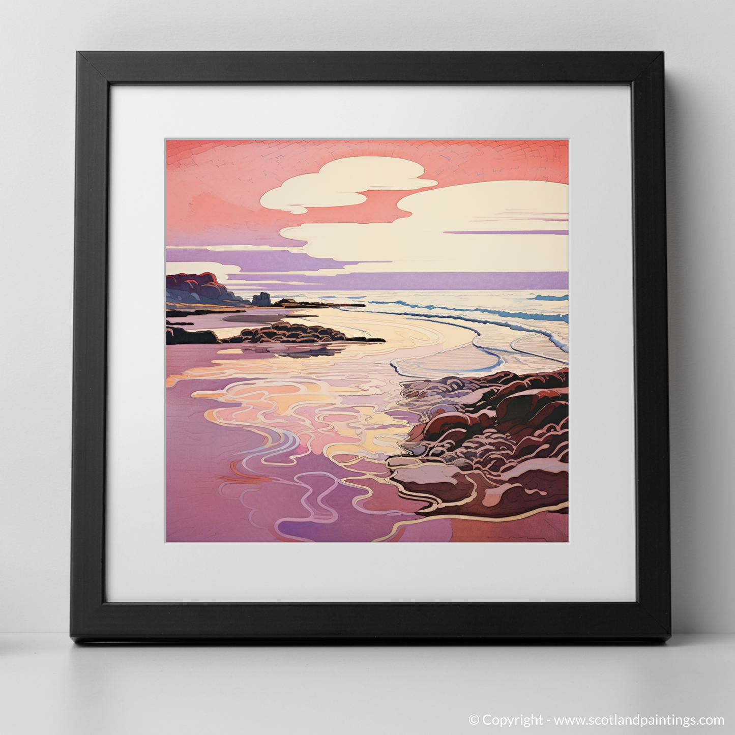 Nestled within our 'Scottish Beaches' collection, this print offers an escape to a corner of Scotland famed for its picturesque sunset views. It is more than just a piece of art; it is an invitation to gaze into a world where nature's grace is enhanced by the fluidity of Art Nouveau elegance, making it a perfect addition to any space seeking a touch of tranquillity and aesthetic refinement.