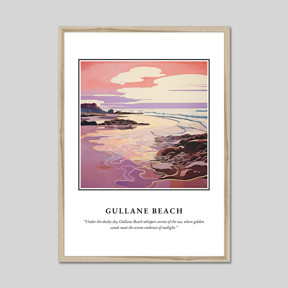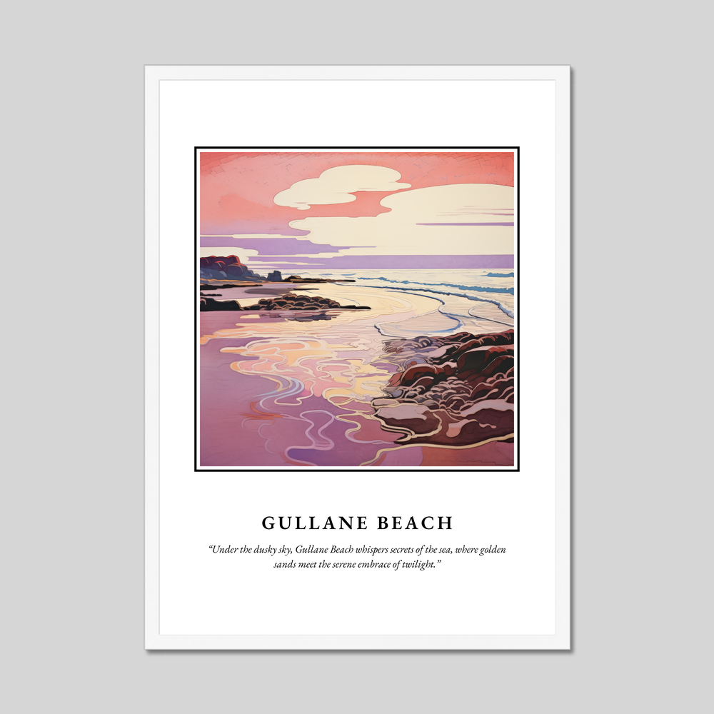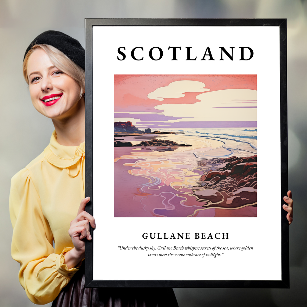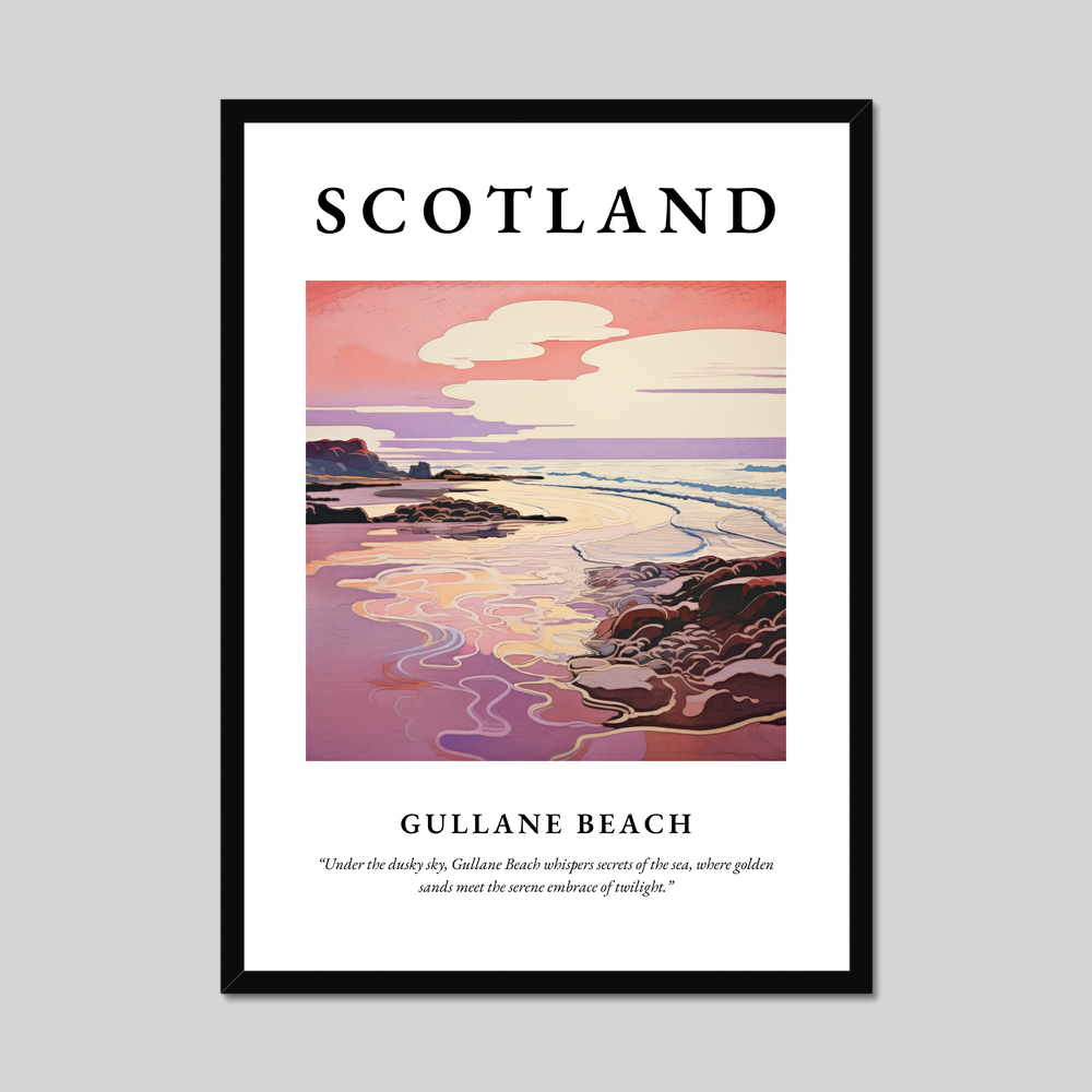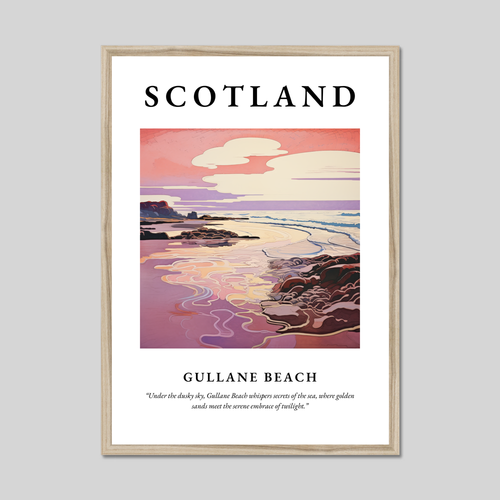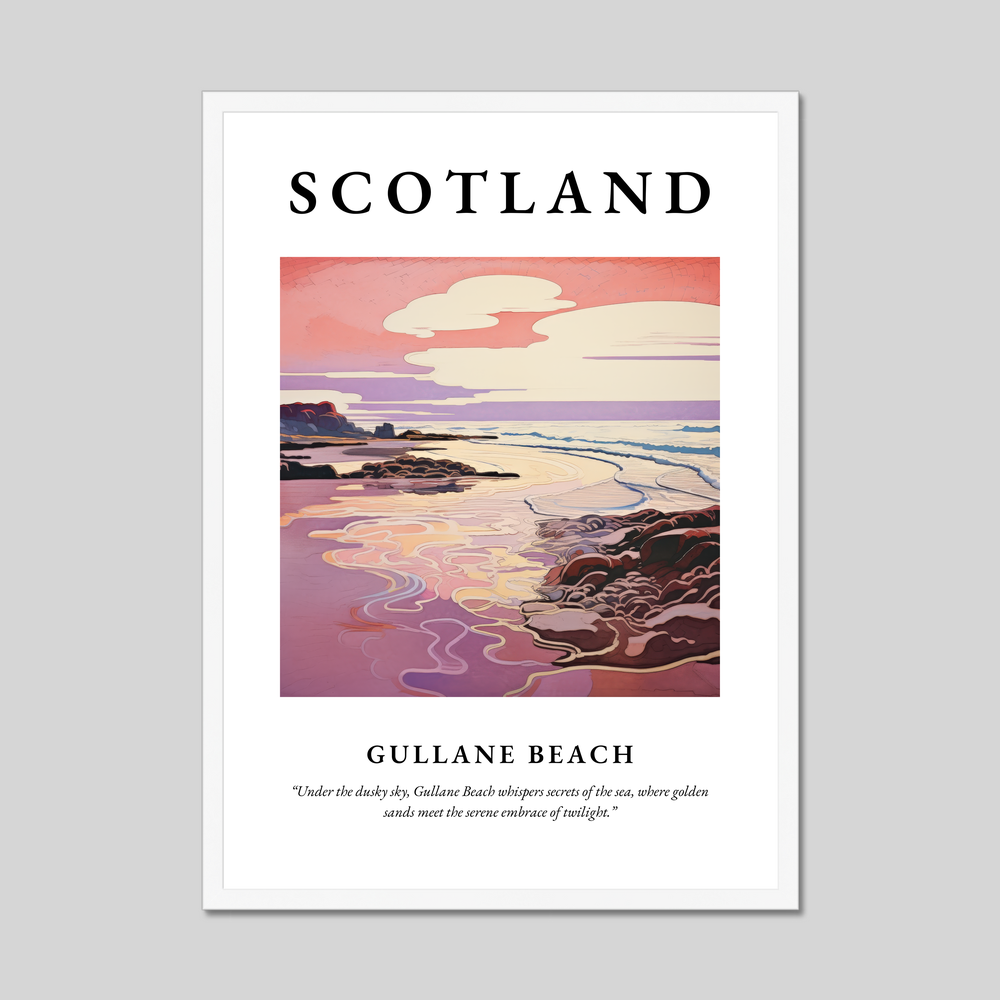 Gullane Beach, a gem on Scotland's East Lothian coast, is renowned for its sprawling sands and pristine natural beauty. Favoured by locals and visitors alike, it offers a peaceful retreat from the bustle of everyday life. The beach is ideal for leisurely walks, invigorating swims, or simply watching as the sun dips below the horizon, painting the sky with hues reminiscent of this captivating artwork. The quote beneath the painting perfectly encapsulates the ethereal experience of being at Gullane Beach, a place where nature's serenity whispers to the heart.