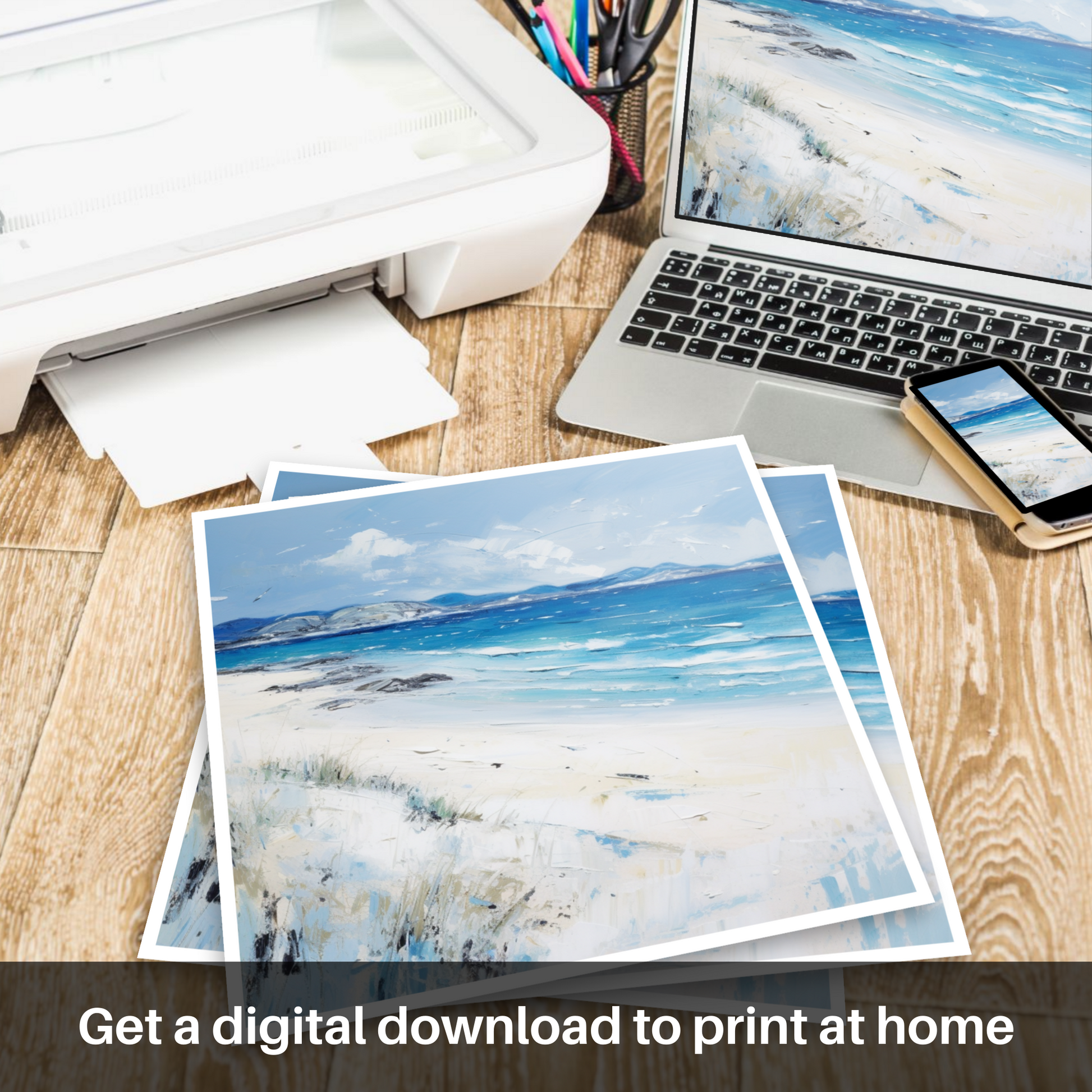 Capture the essence of the Scottish coastline with this stirring piece that transports you to the serene expanse of Traigh Mhor, a gem on the Isle of Barra. Embracing a modern take on Abstract Expressionism, this work skilfully marries vibrant hues and bold textures to evoke the raw, untamed beauty of Scotland's beaches.