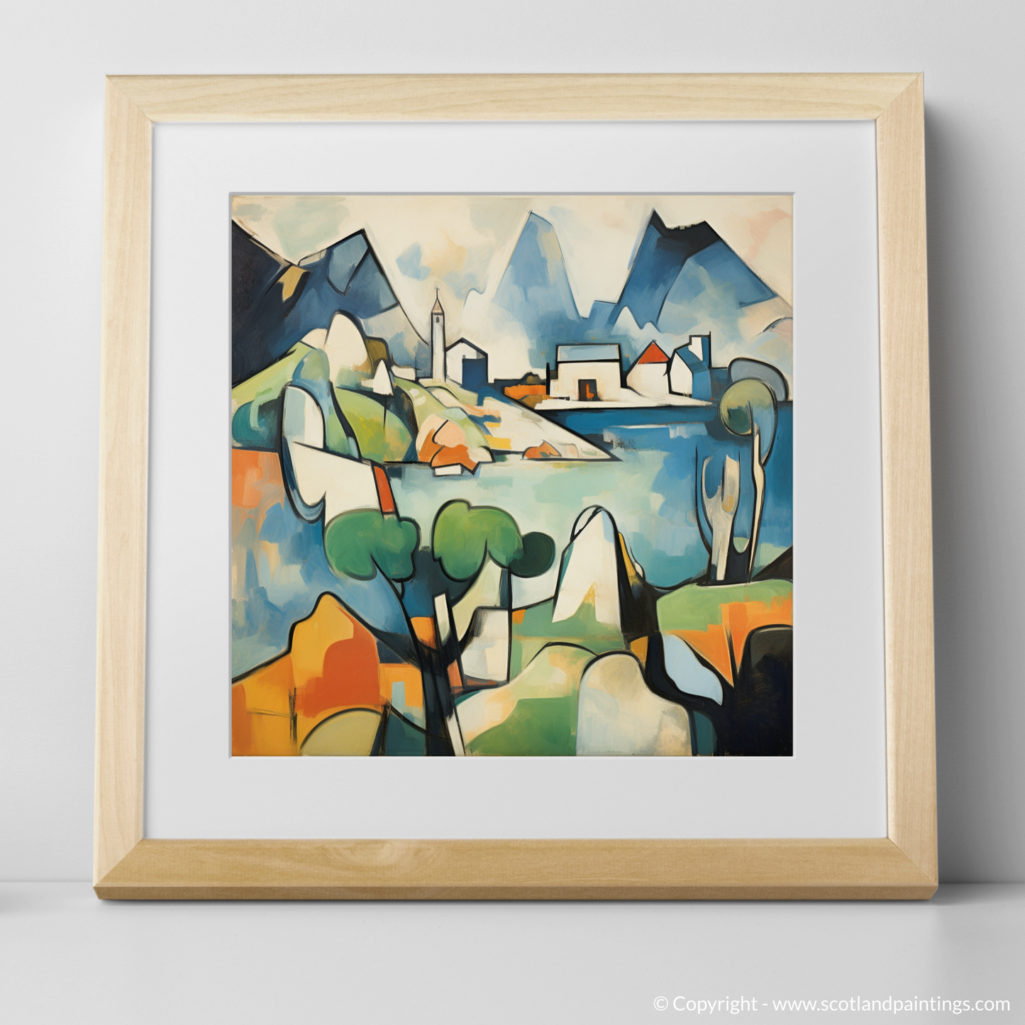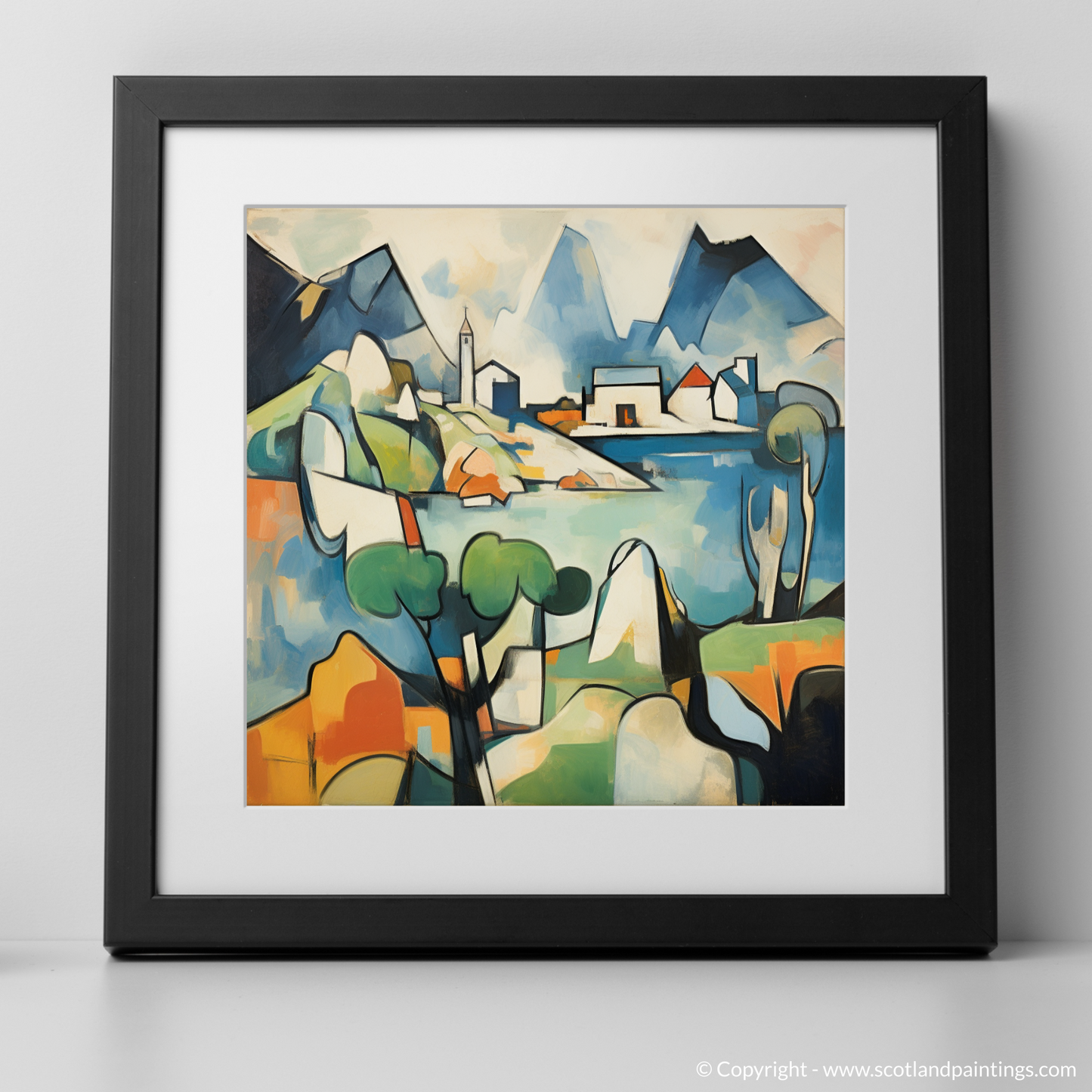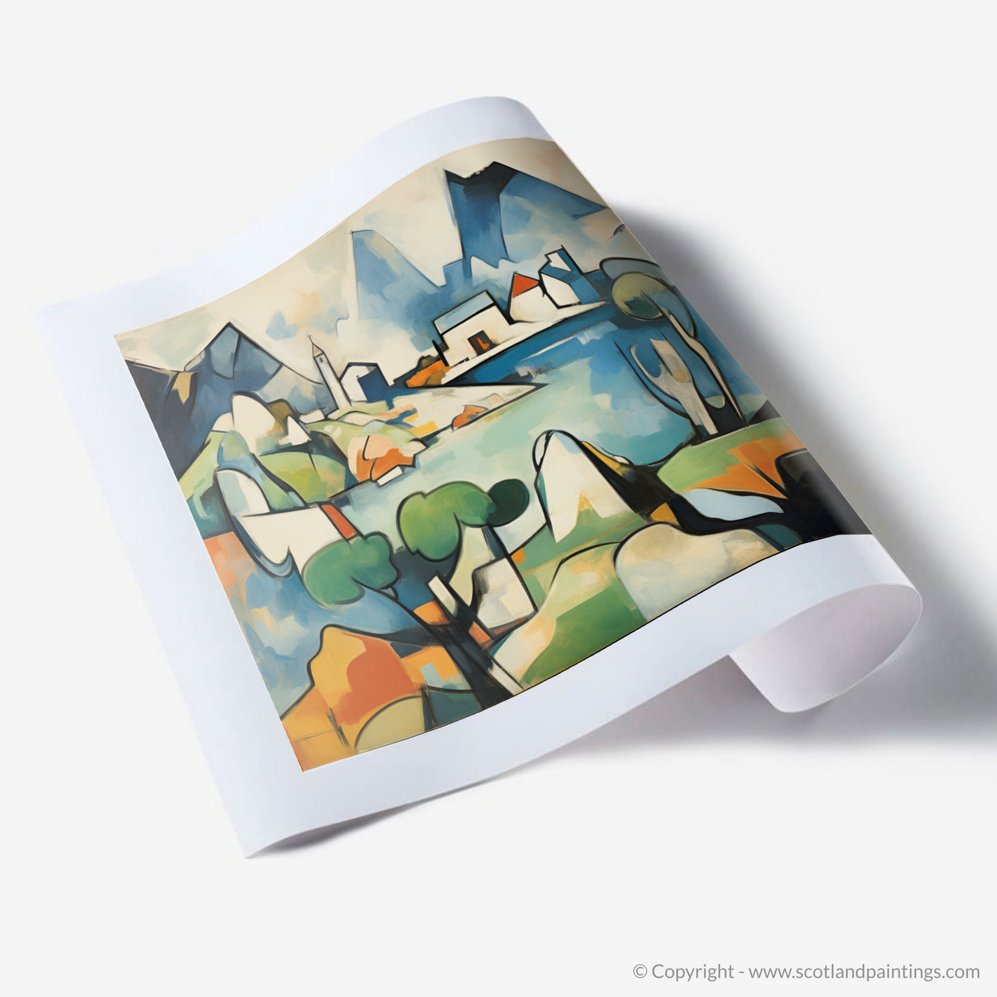 Embark on a visual journey to the Scottish Isles with this evocative cubist interpretation of the Isle of Iona, a gem nestled within the Inner Hebrides. Geometric shapes meld and juxtapose to form an abstract landscape rich with colour and form. Angular edifices rise against a backdrop of majestic mountains, their peaks reimagined into sharp, intersecting planes that capture the essence of cubism's revolutionary perspective on form and dimension.