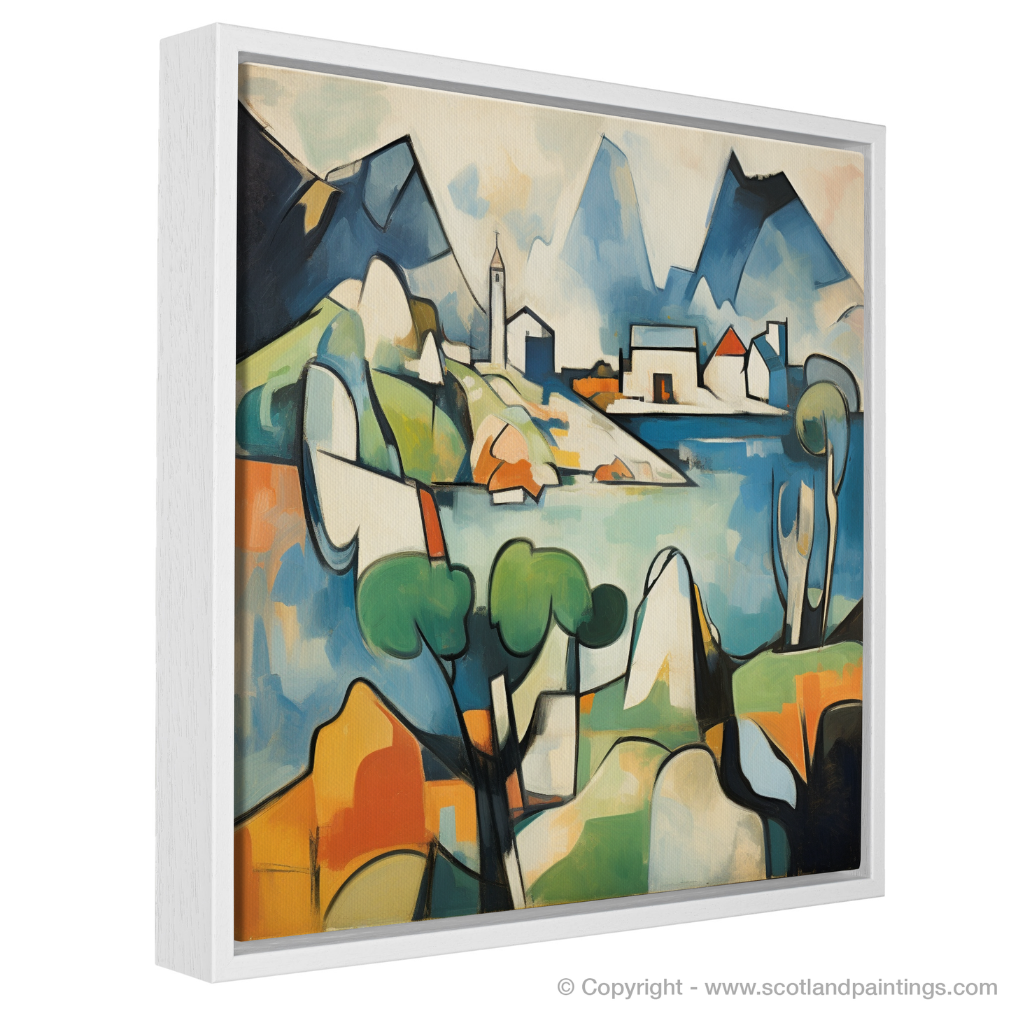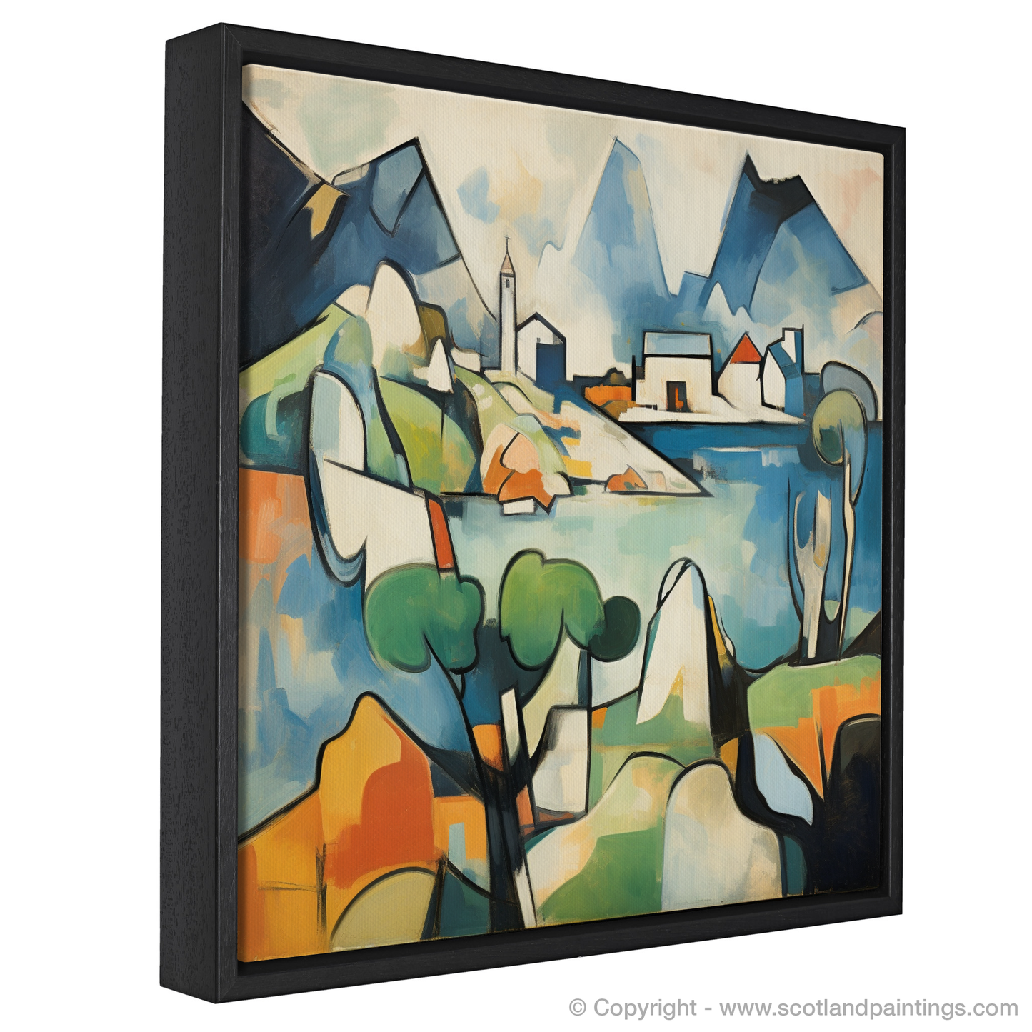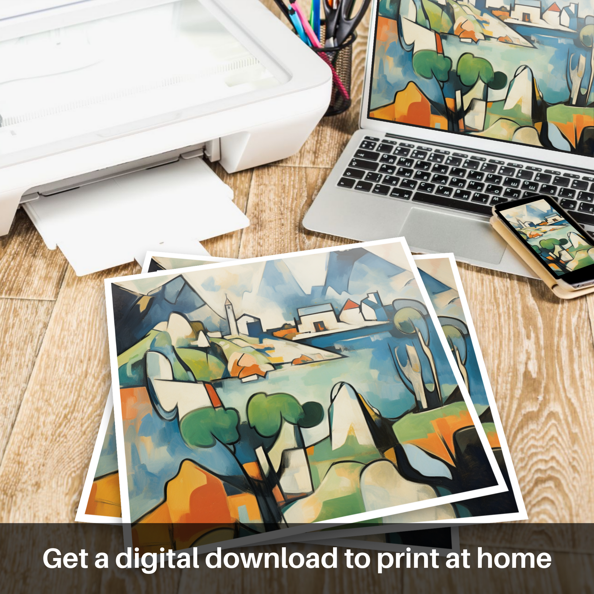 Embark on a visual journey to the Scottish Isles with this evocative cubist interpretation of the Isle of Iona, a gem nestled within the Inner Hebrides. Geometric shapes meld and juxtapose to form an abstract landscape rich with colour and form. Angular edifices rise against a backdrop of majestic mountains, their peaks reimagined into sharp, intersecting planes that capture the essence of cubism's revolutionary perspective on form and dimension.