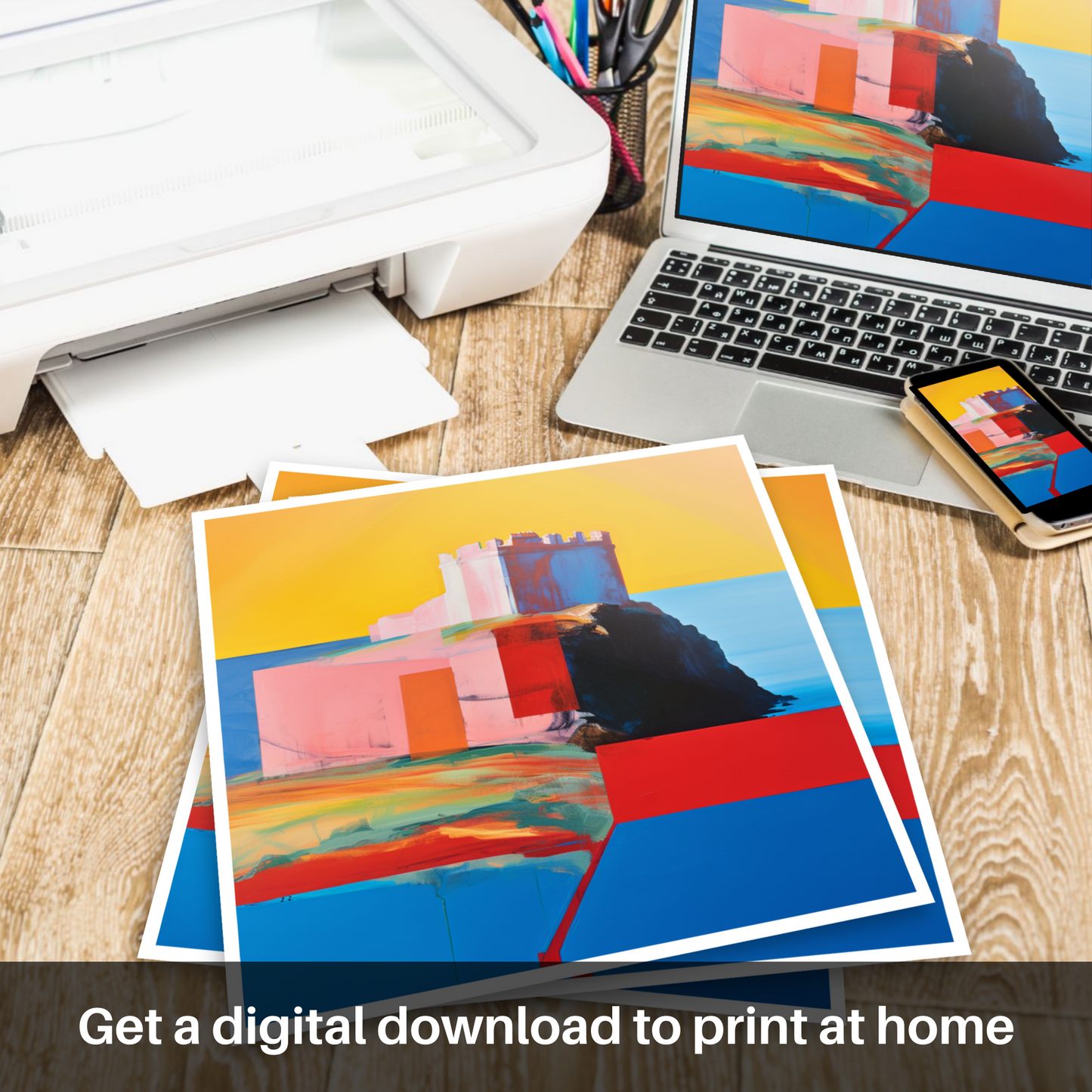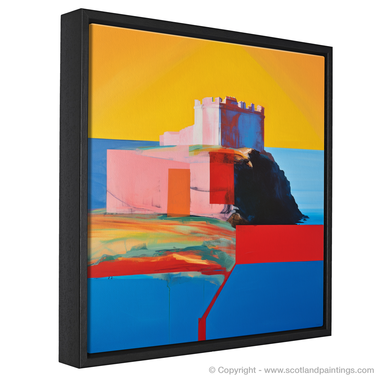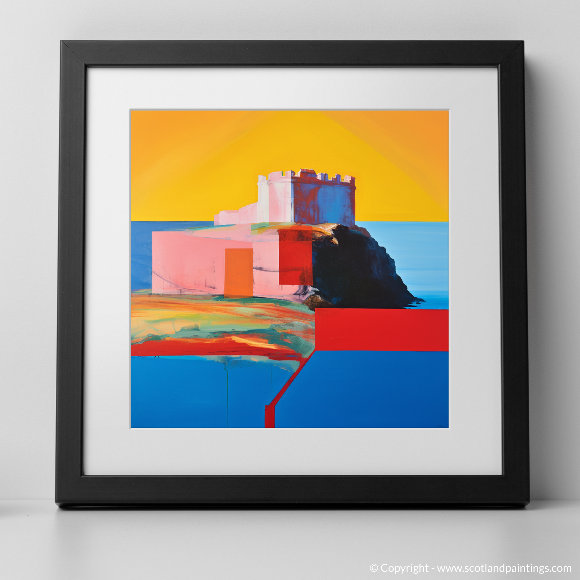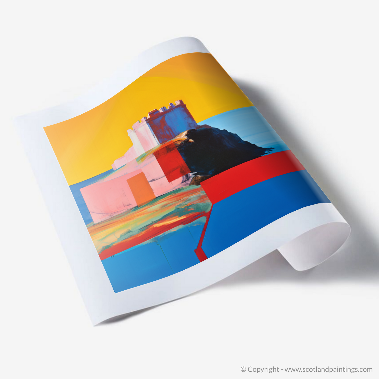 Immerse yourself in the evocative hues and broad strokes of this captivating print, where the imposing silhouette of Tantallon Castle emerges against the canvas in a defined interplay of colour and form. This piece is a celebration of the majestic East Lothian landmark, envisioned through the vibrant lens of the Color Field style.