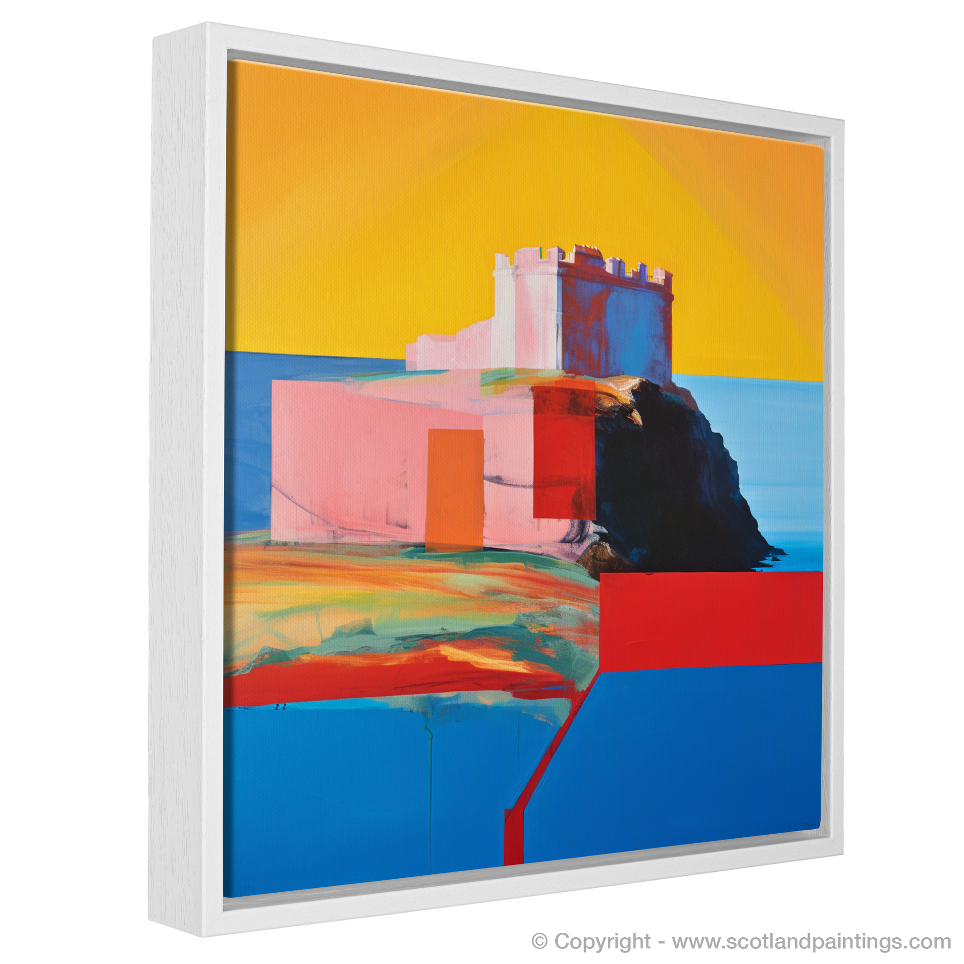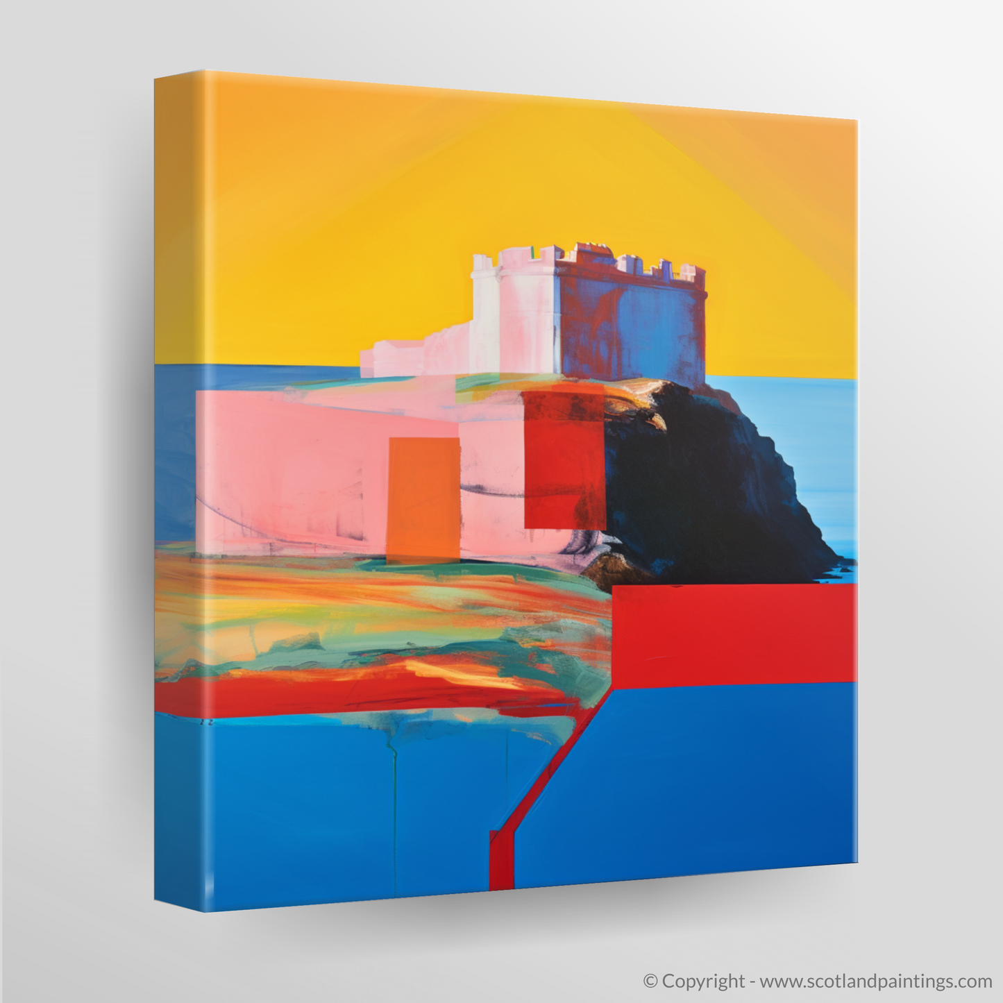 At the heart of this visual narrative is the grand edifice of Tantallon Castle, boldly reimagined with expansive blocks of colour that capture both its grandeur and the ethereal quality of its coastal surroundings. The foreground is awash with a kaleidoscope of tones that mimic the rugged terrain and hint at the wild beauty of the Scottish landscape.