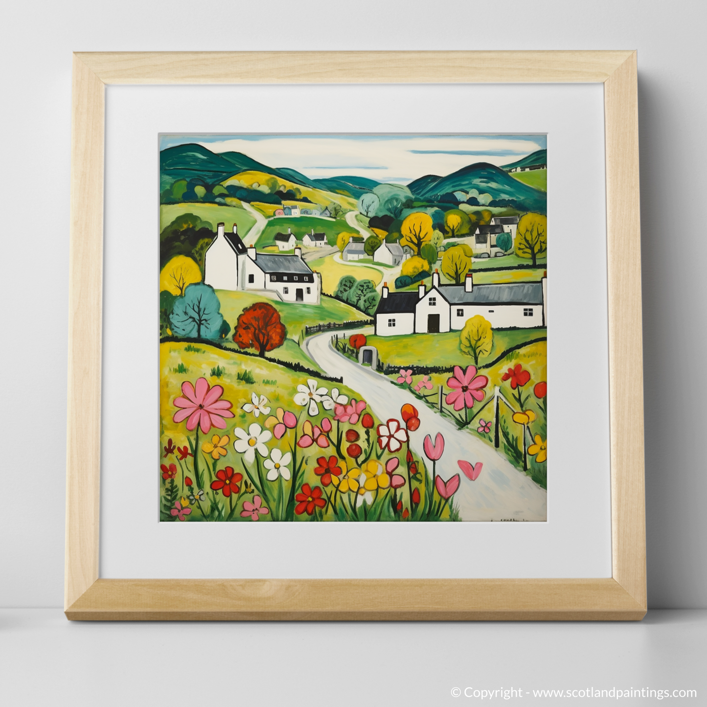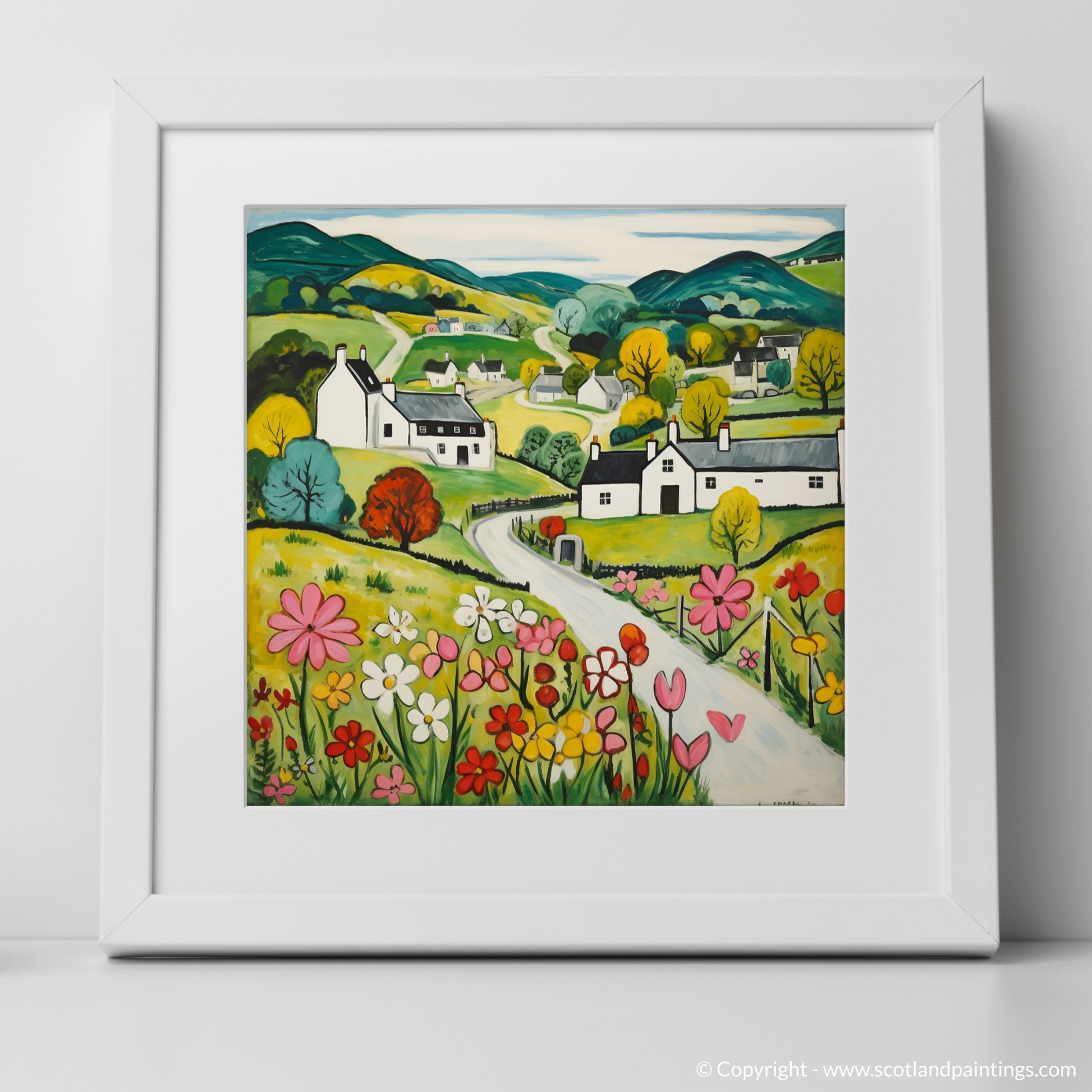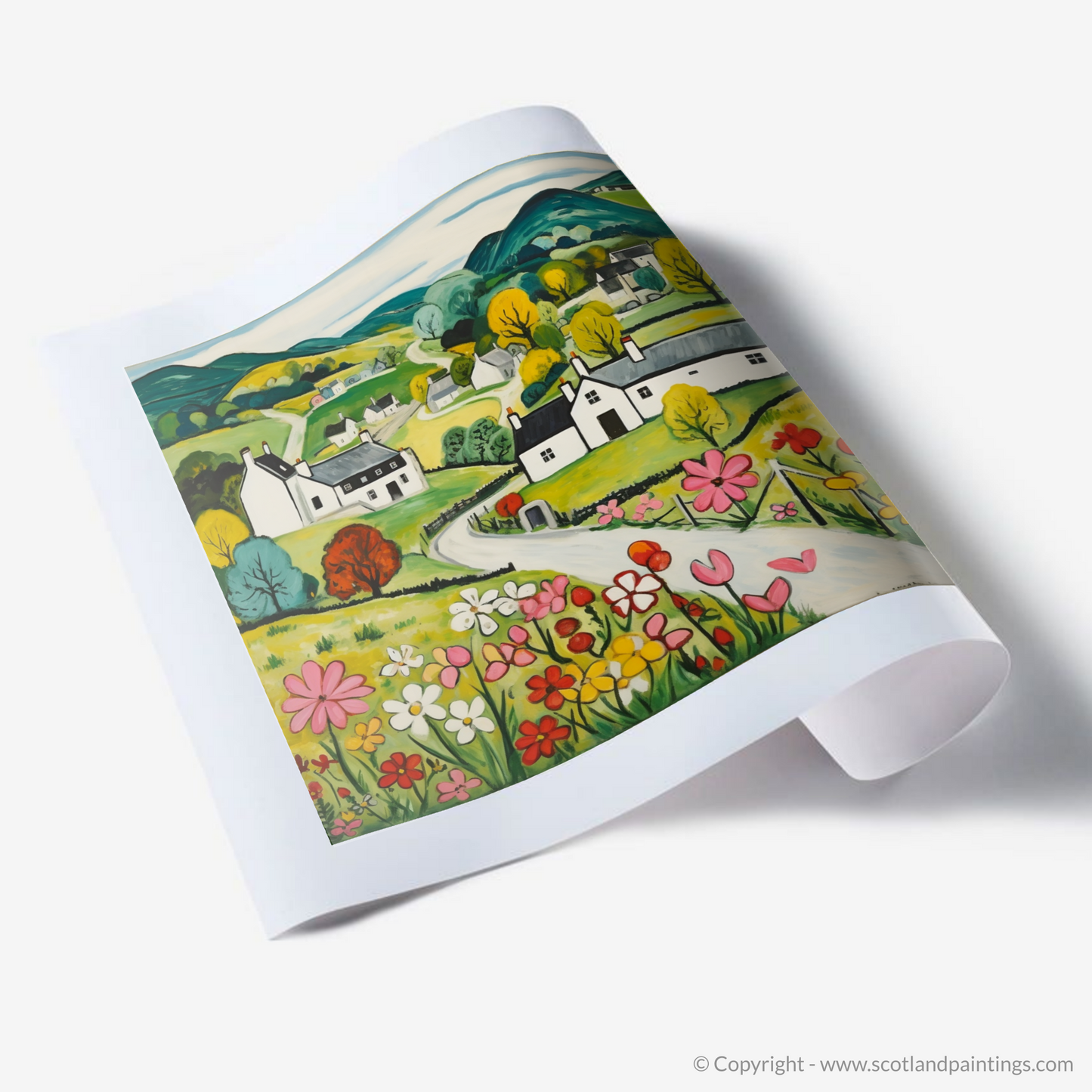 Immerse yourself in the rustic charm of the Scottish countryside with our enchanting print inspired by the picturesque village of Kilmartin in Argyll and Bute. This delightful piece, rendered in the Naive Art style, captures the simplistic beauty and whimsical allure of the rural landscape.