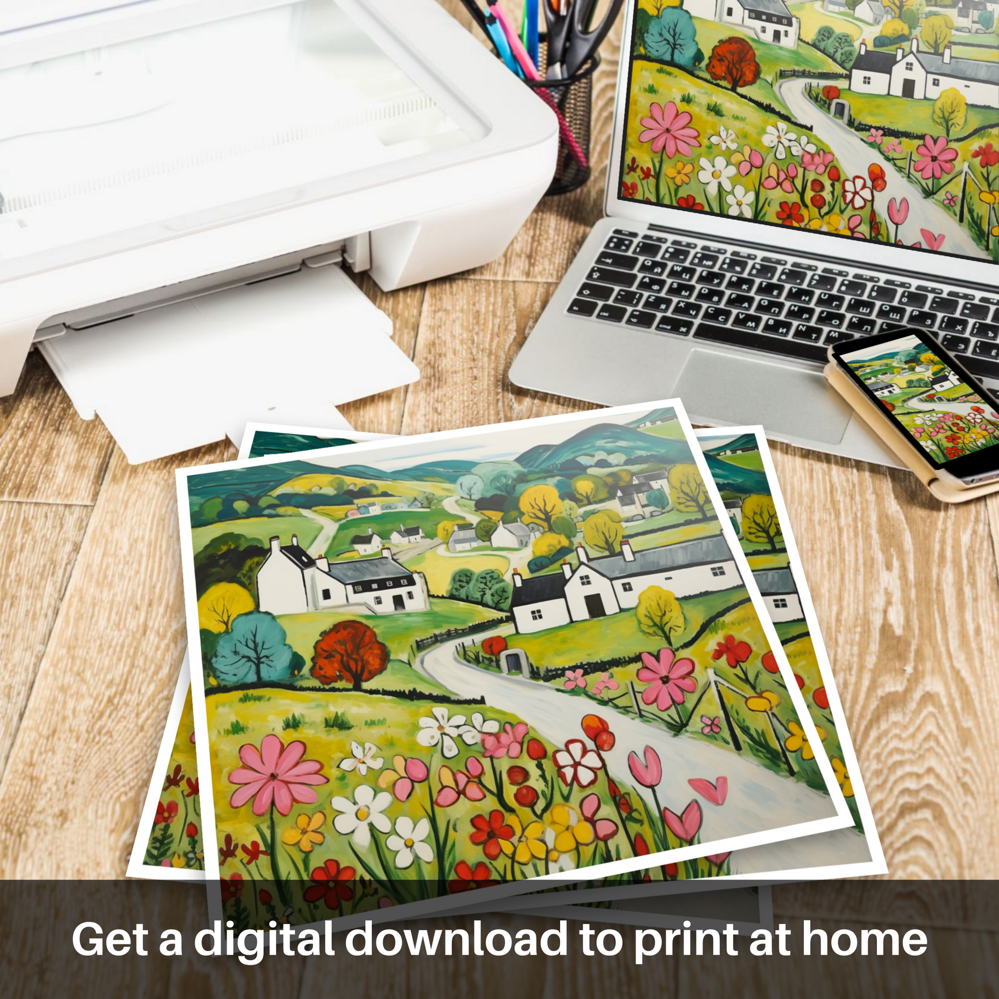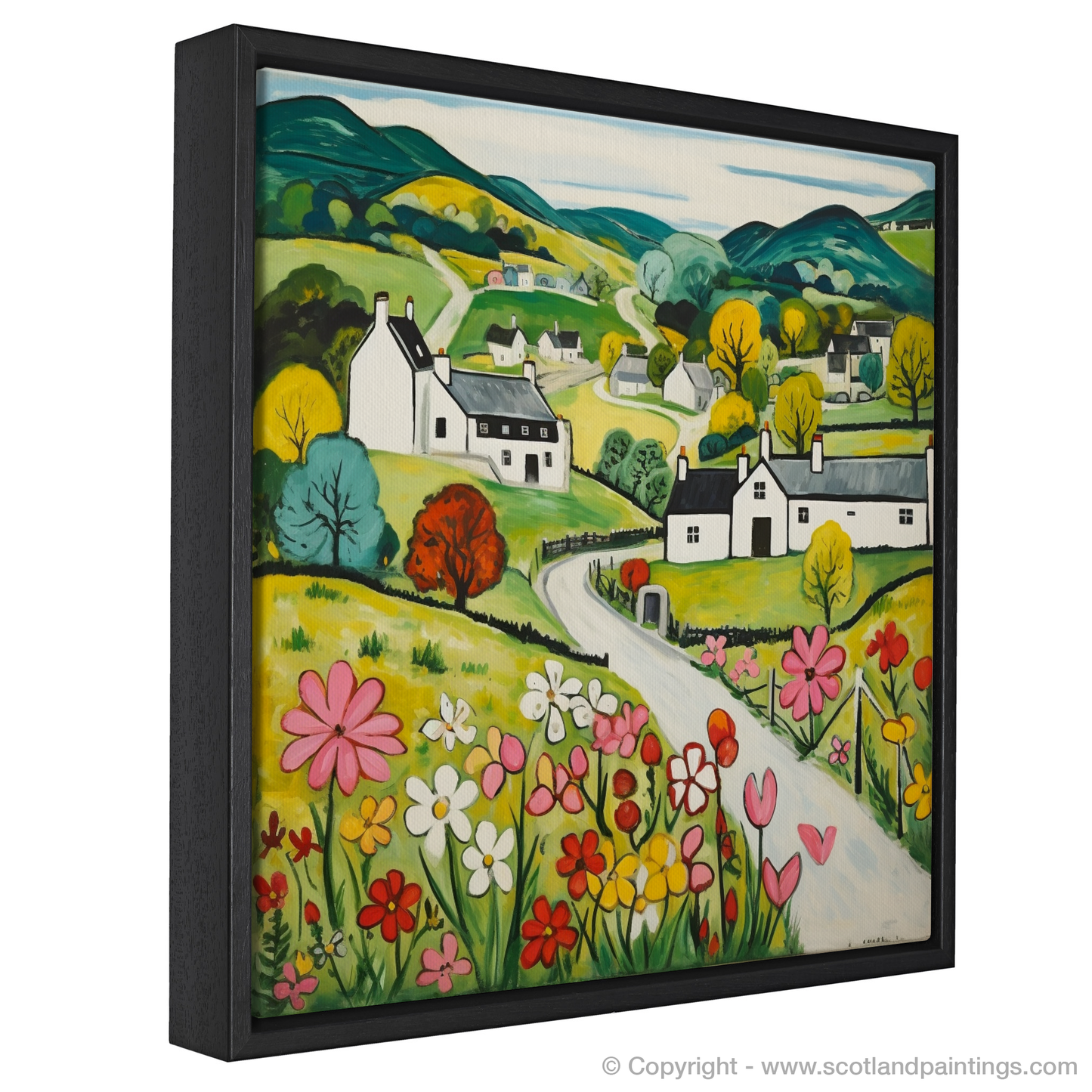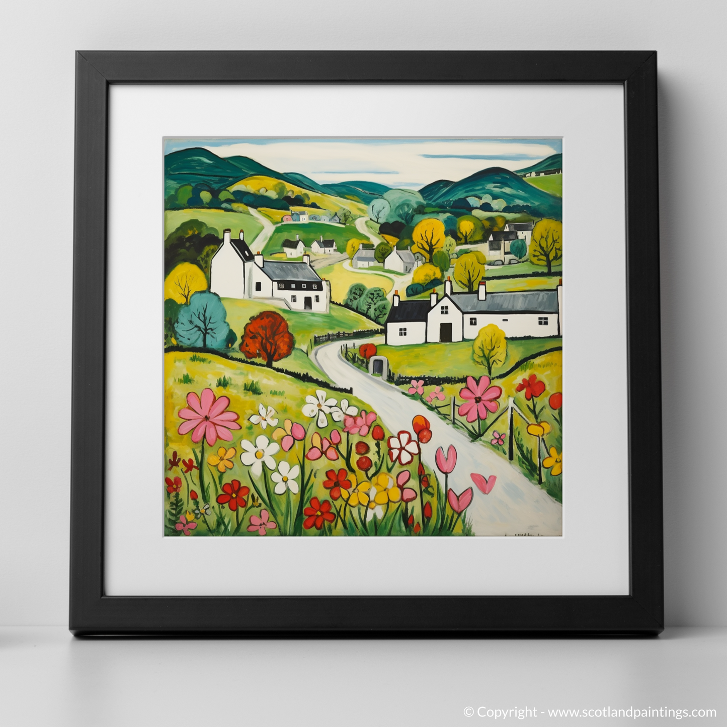 Immerse yourself in the rustic charm of the Scottish countryside with our enchanting print inspired by the picturesque village of Kilmartin in Argyll and Bute. This delightful piece, rendered in the Naive Art style, captures the simplistic beauty and whimsical allure of the rural landscape.