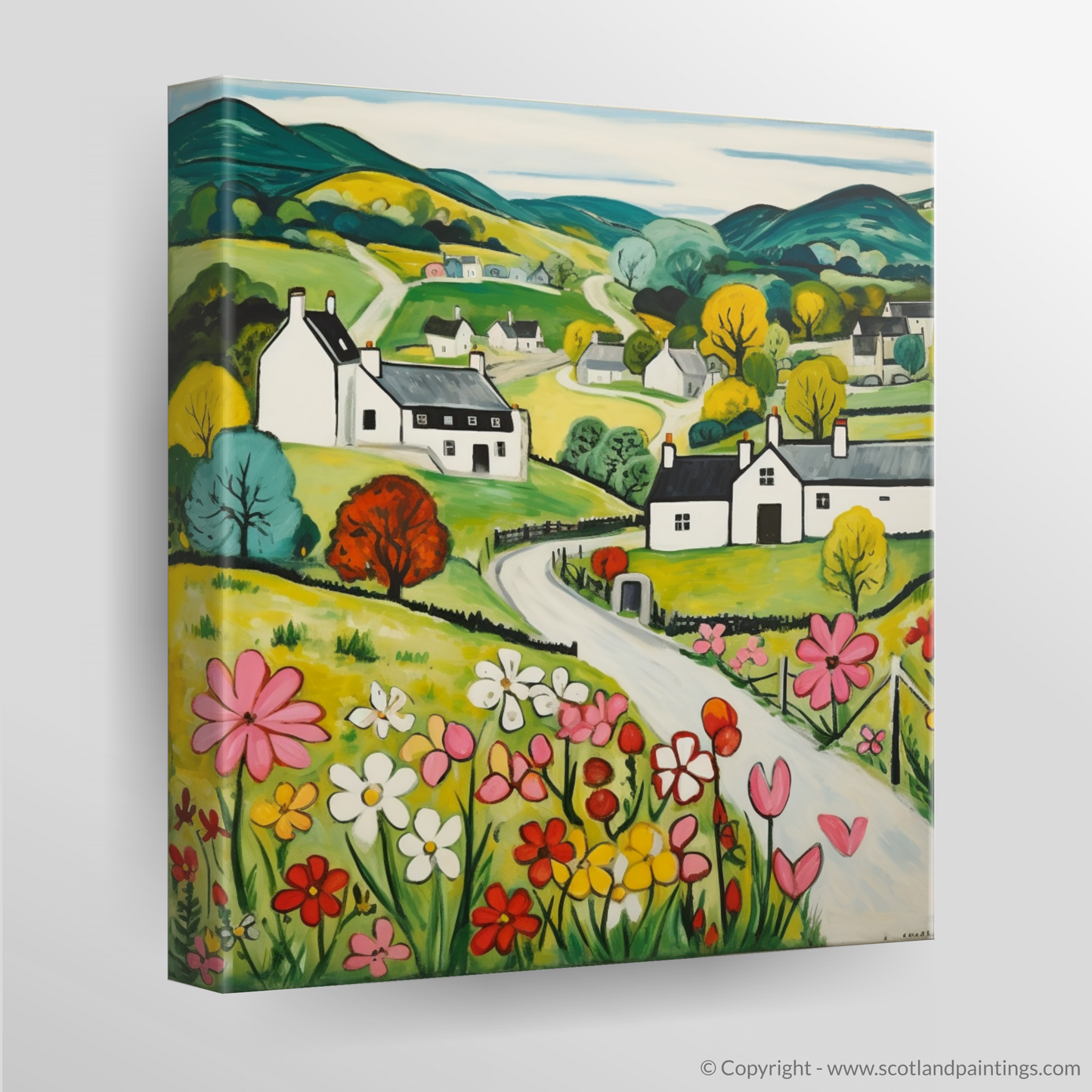 With an overarching palette of vivid greens, harmonious yellows, and bold reds, this image invites the viewer to stroll through a serene pastoral scene. It depicts a winding road meandering through the composition, leading your gaze past charming white cottages with striking dark roofs. The quaint dwellings are nestled amid undulating hills that roll gently into the distance, suggesting a tranquil seclusion from the hustle of modern life.