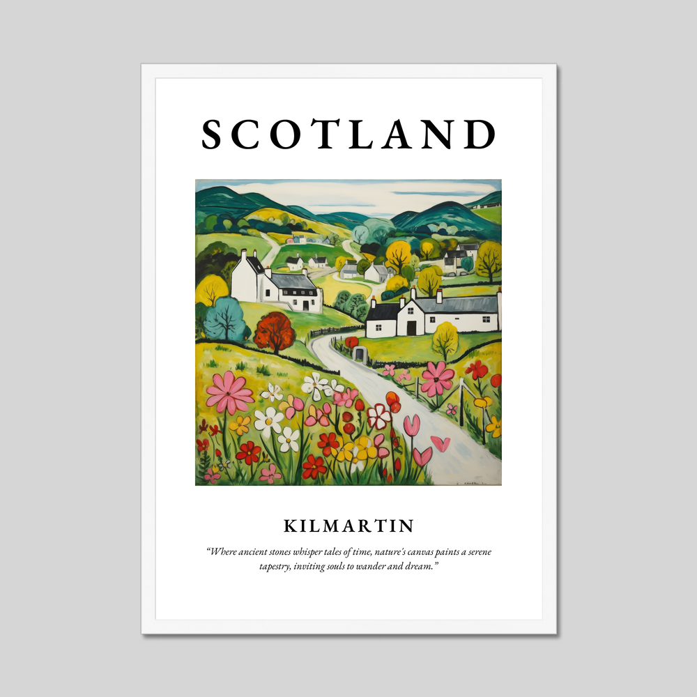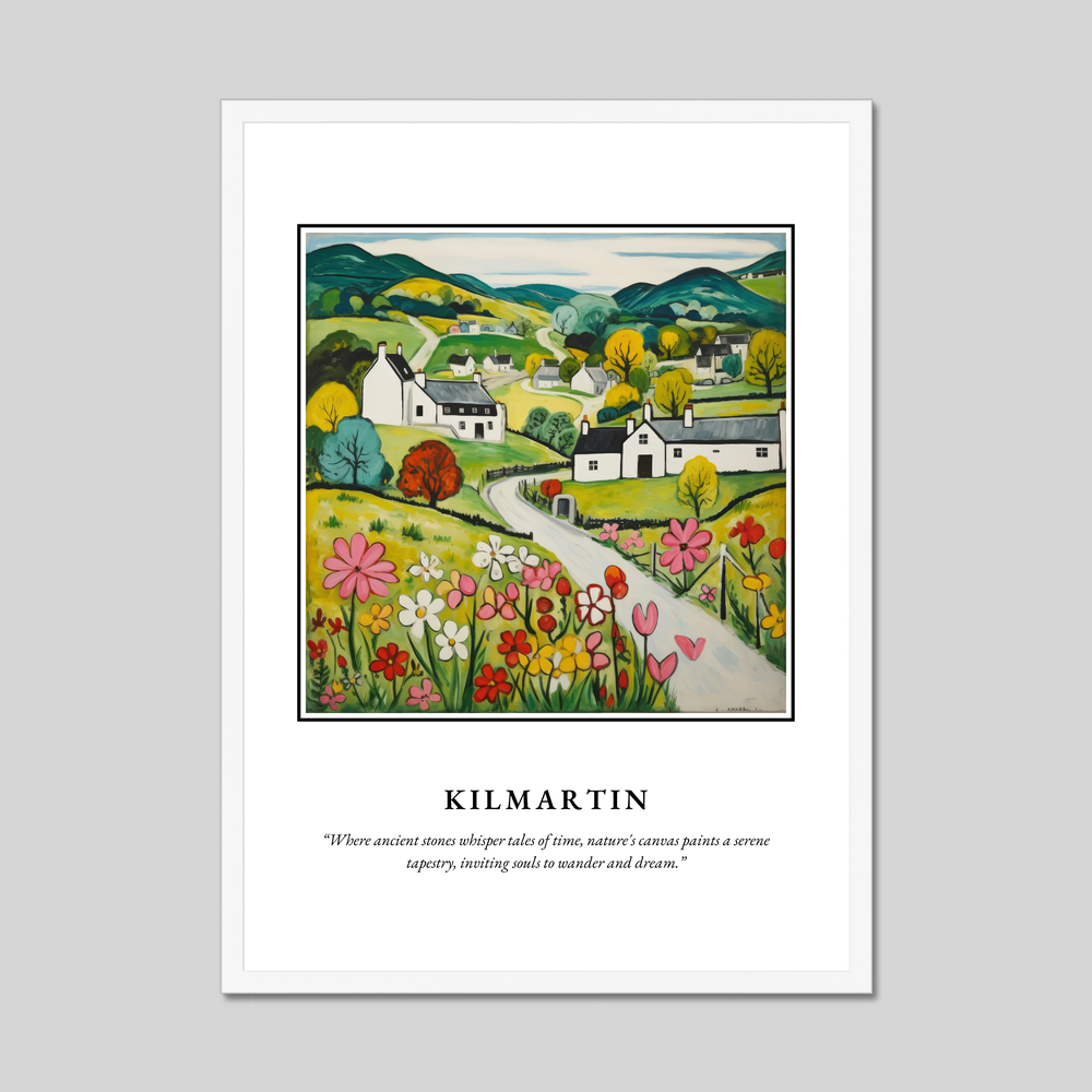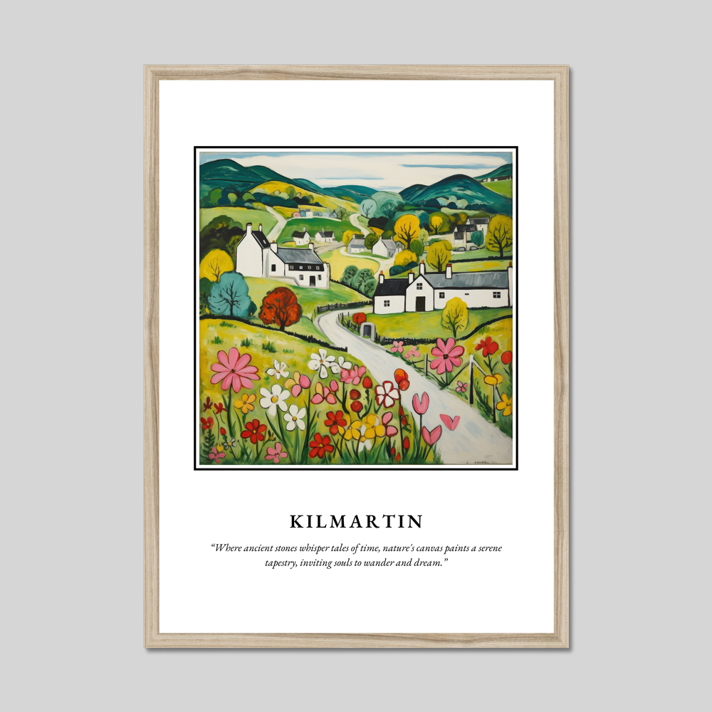 Elegantly framed in your choice of black, white, or natural wood-effect, the poster begins with the bold proclamation of "SCOTLAND" at the top, set against a backdrop of vibrant hues and rustic charm. Below, the Naive Art depiction of Kilmartin evokes a sense of simplicity and warmth, capturing rolling hills and quaint cottages in striking yet softened colours. The landscape is alive with a patchwork of fields, where cheerful blossoms dance under a tranquil sky. Beneath this delightful scene, the words “Where ancient stones whisper tales of time, nature's canvas paints a serene tapestry, inviting souls to wander and dream.” invite viewers to lose themselves in imagination and memory.