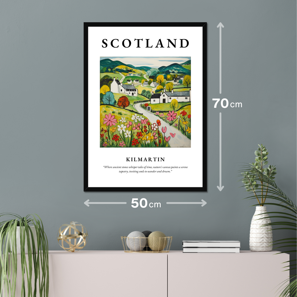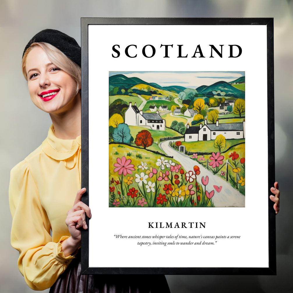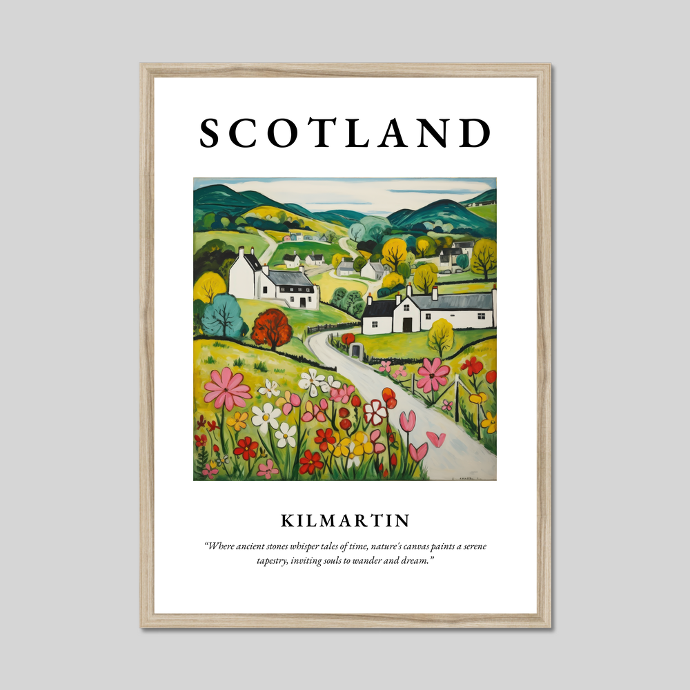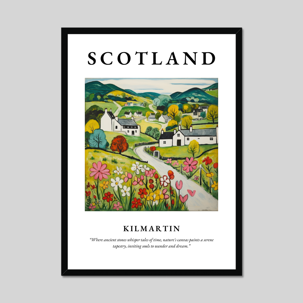 Elegantly framed in your choice of black, white, or natural wood-effect, the poster begins with the bold proclamation of "SCOTLAND" at the top, set against a backdrop of vibrant hues and rustic charm. Below, the Naive Art depiction of Kilmartin evokes a sense of simplicity and warmth, capturing rolling hills and quaint cottages in striking yet softened colours. The landscape is alive with a patchwork of fields, where cheerful blossoms dance under a tranquil sky. Beneath this delightful scene, the words “Where ancient stones whisper tales of time, nature's canvas paints a serene tapestry, inviting souls to wander and dream.” invite viewers to lose themselves in imagination and memory.