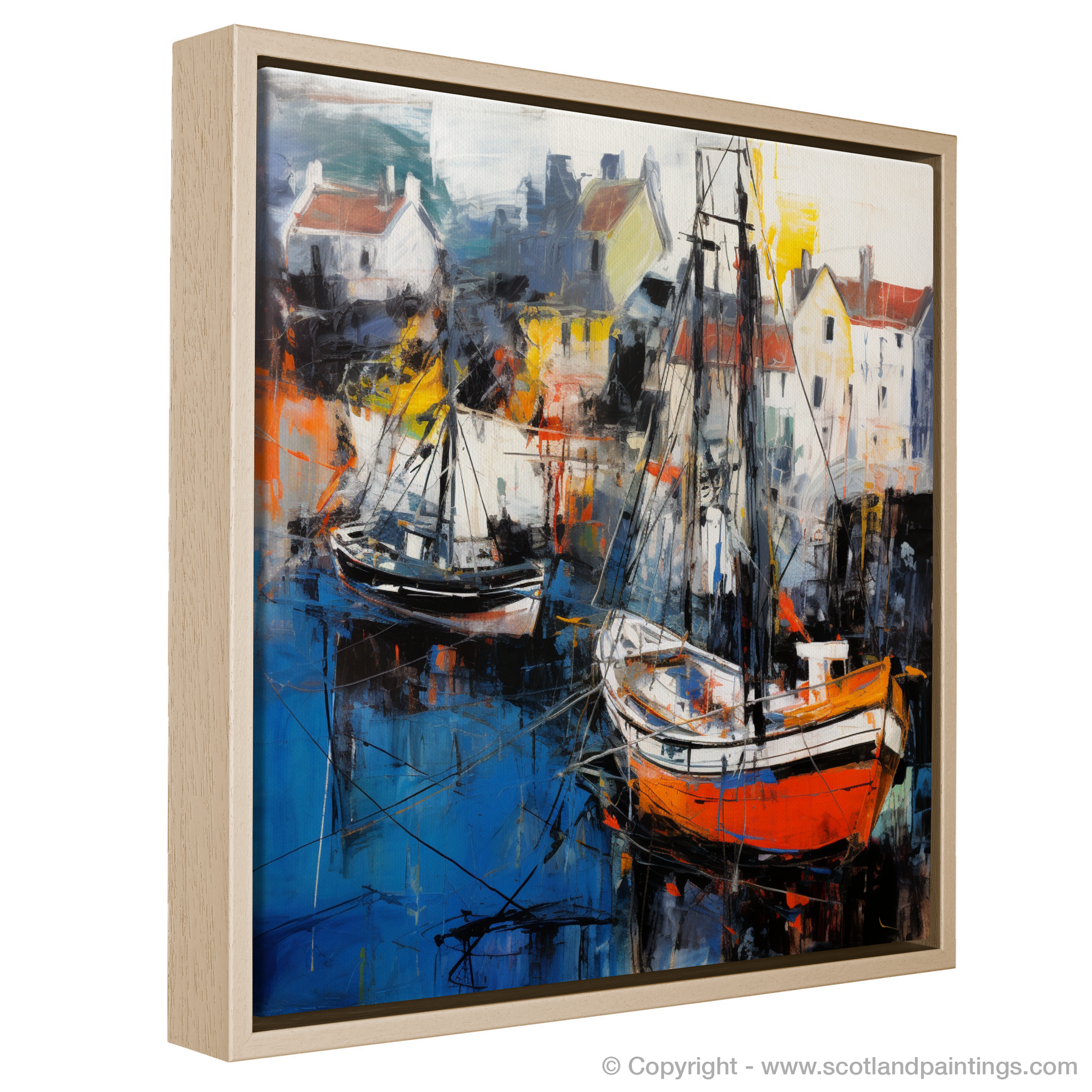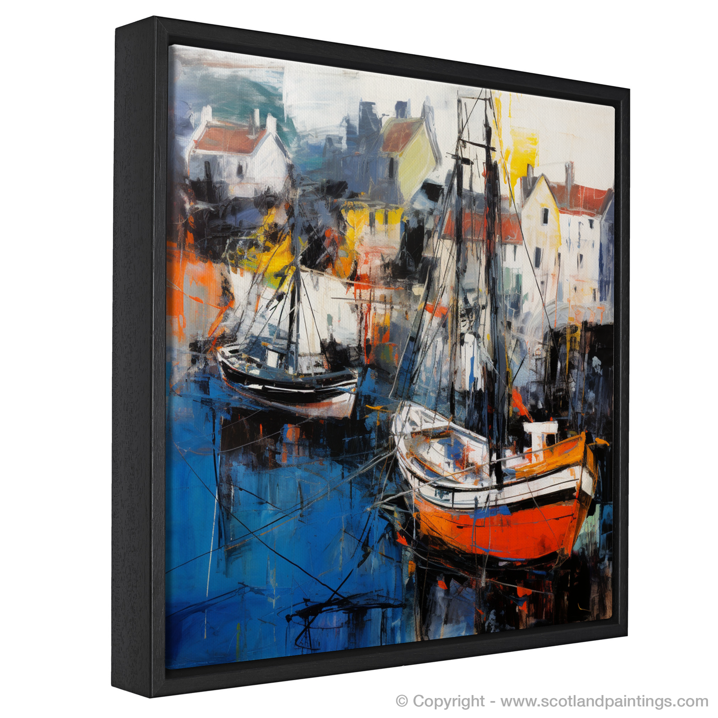 The artist's skillful use of the Abstract Impressionism style brings the scene to life with bold, expressive brushstrokes that suggest the gentle rocking of boats against the quayside. Rich, vibrant hues of deep ocean blues and fiery reds dominate the palette, contrasting starkly against the more subdued tones that hint at the historic stone buildings in the background.