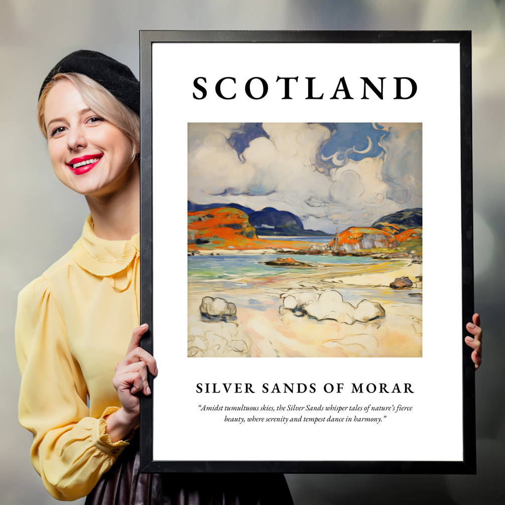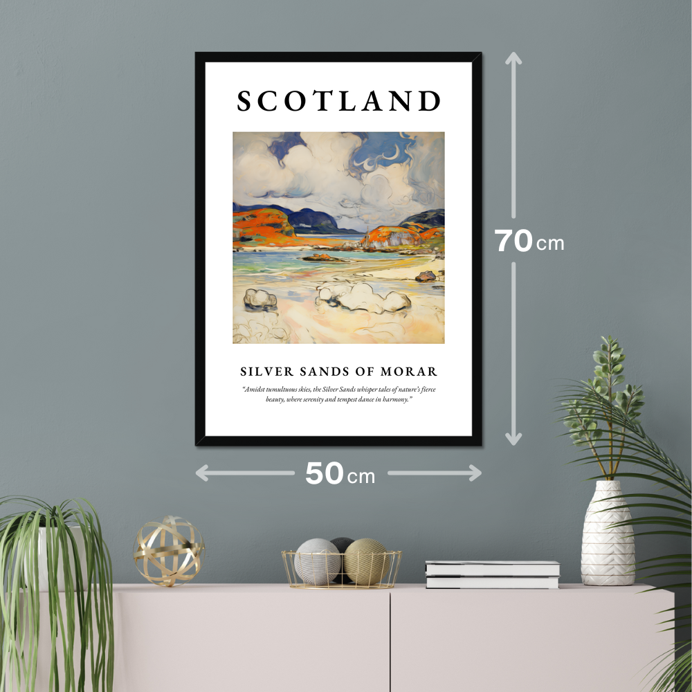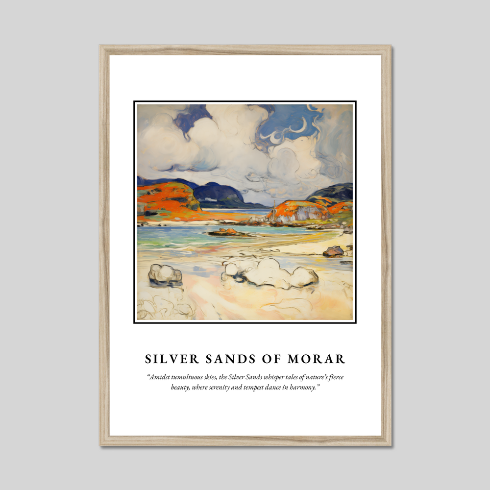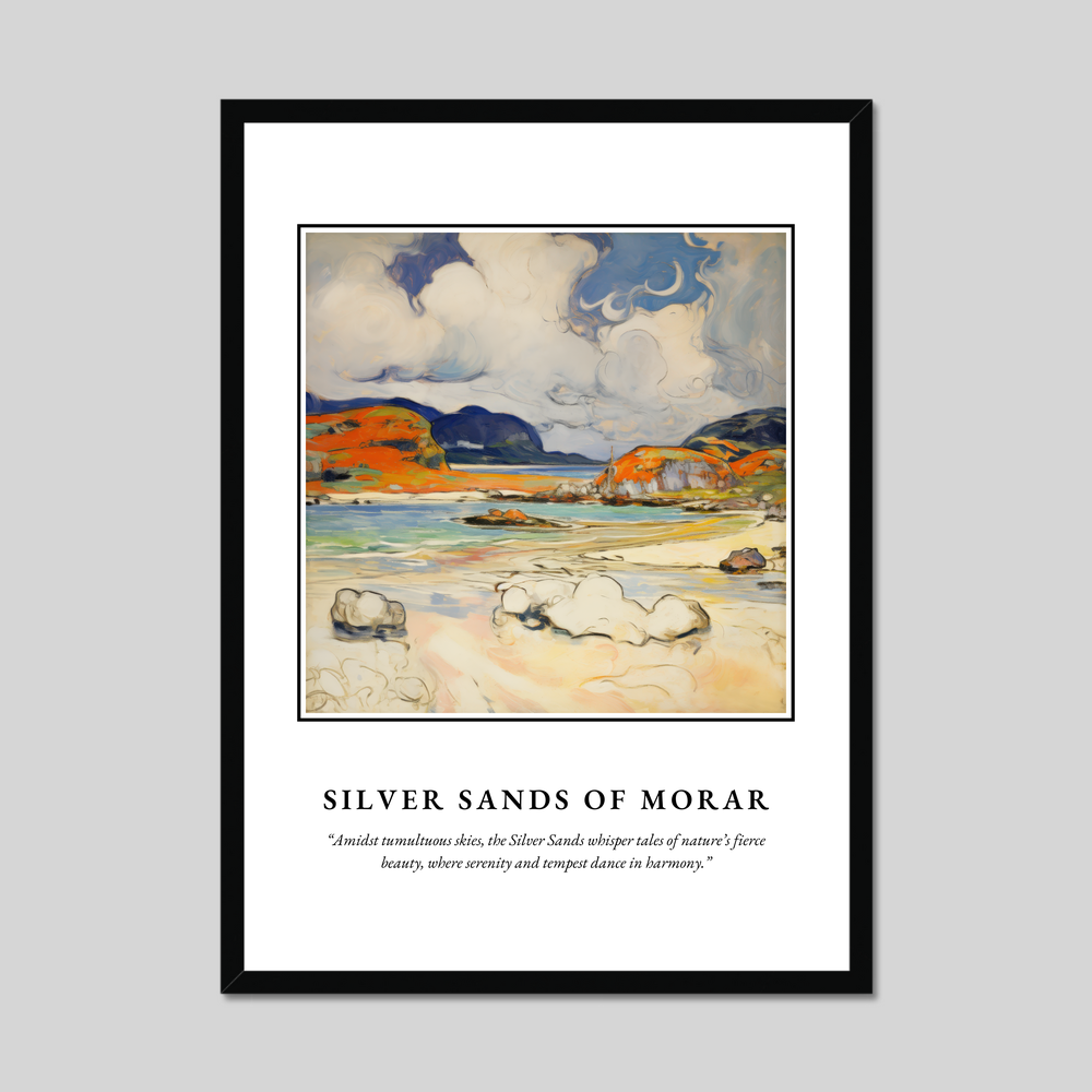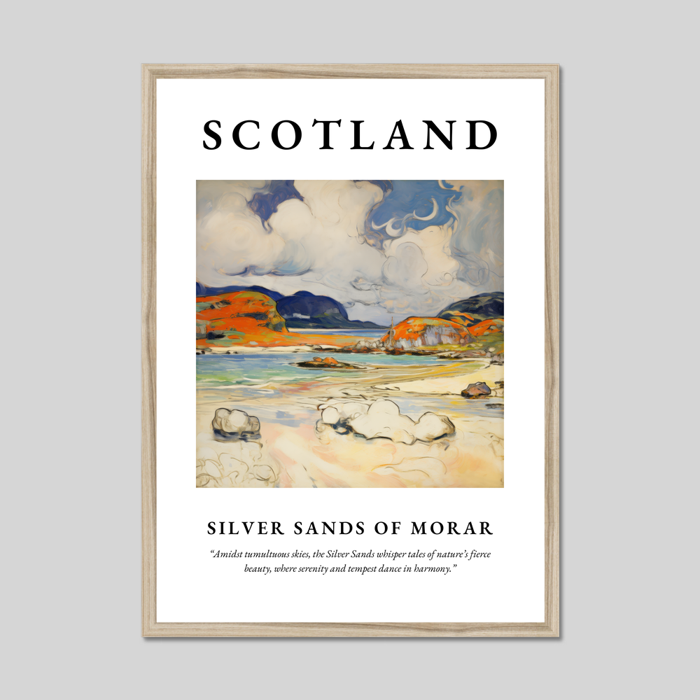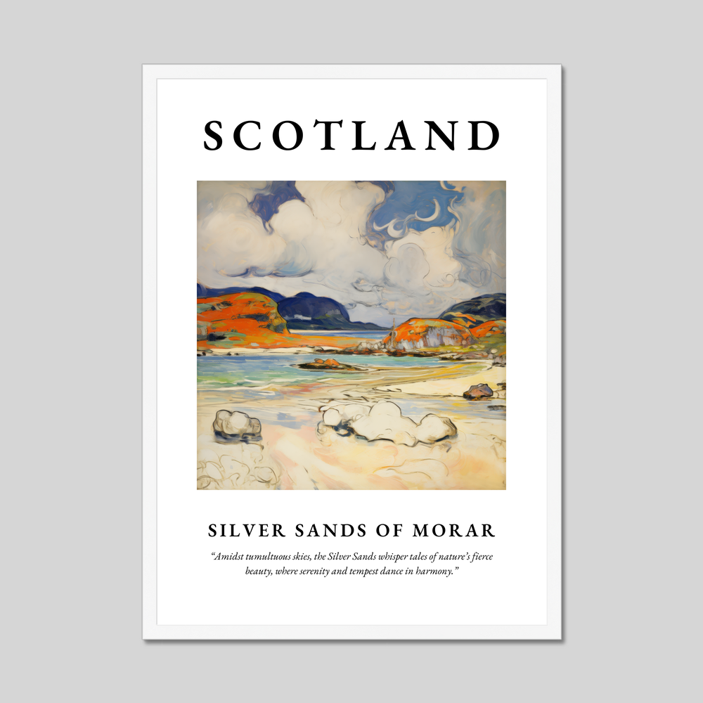 Immerse yourself in the enchanting beauty of the Scottish Highlands with our stunning framed poster print, measuring an impressive 50cm x 70cm. This vibrant piece brings the Silver Sands of Morar into your home, capturing the essence of Scotland’s wild beauty in the Fauvism style. The bold word "SCOTLAND" headlines the poster, while beneath the evocative painting is a poetic quote: “Amidst tumultuous skies, the Silver Sands whisper tales of nature’s fierce beauty, where serenity and tempest dance in harmony.”