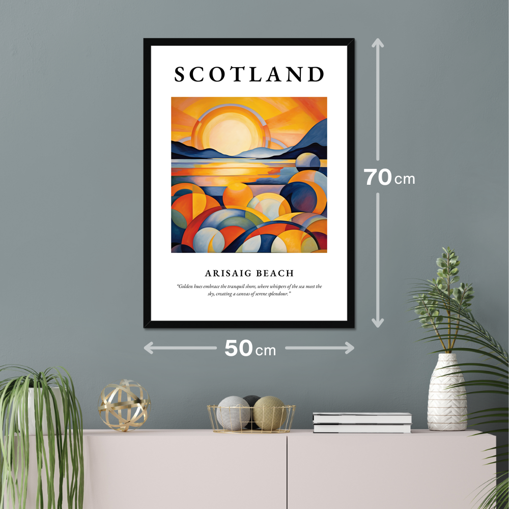 Elevate your space with a captivating piece from our “Scottish Beaches” collection, a framed poster that beautifully encapsulates the ethereal allure of Arisaig Beach. Measuring a substantial 50cm x 70cm, this poster commands attention, covering a large wall area without breaking the bank. Perfect for those with a love for Scotland, cherished memories of its coastlines, or an appreciation for the abstract art form, this piece is sure to add a touch of serene splendour to any room.
