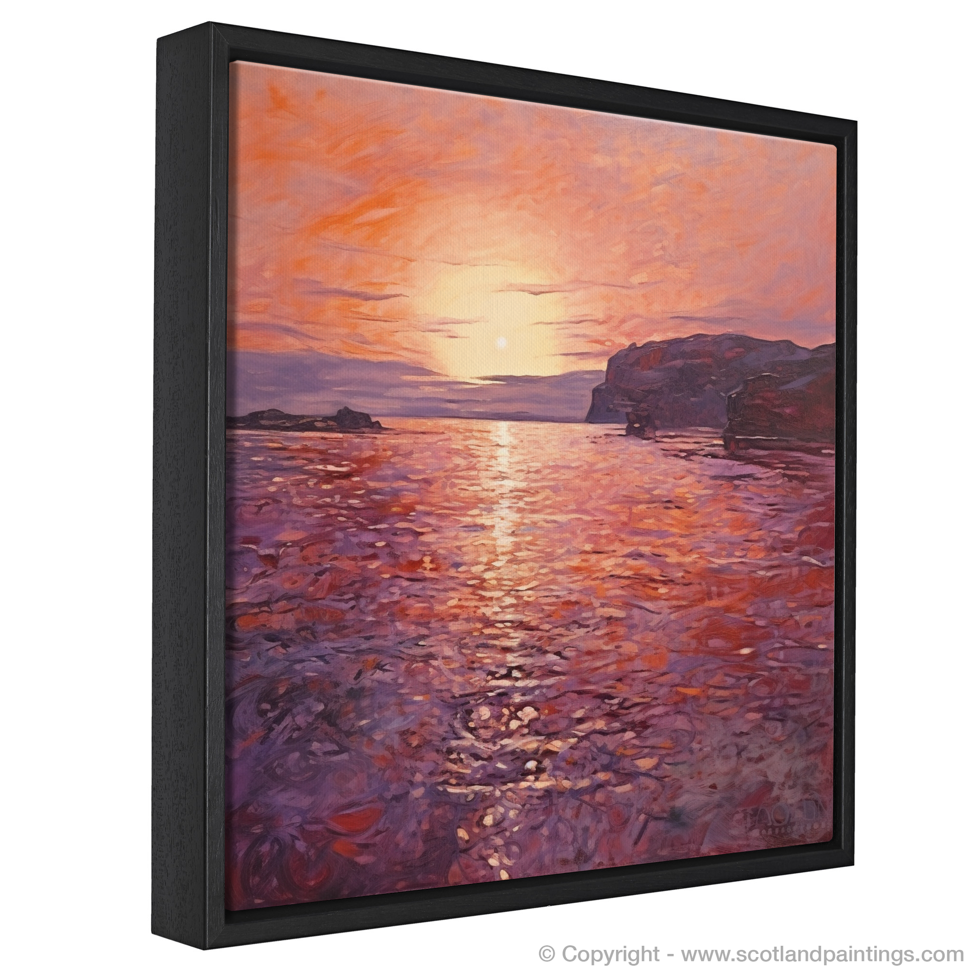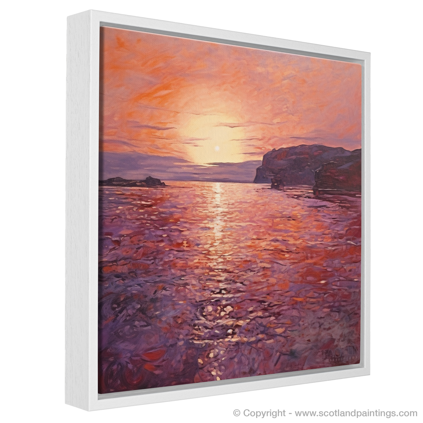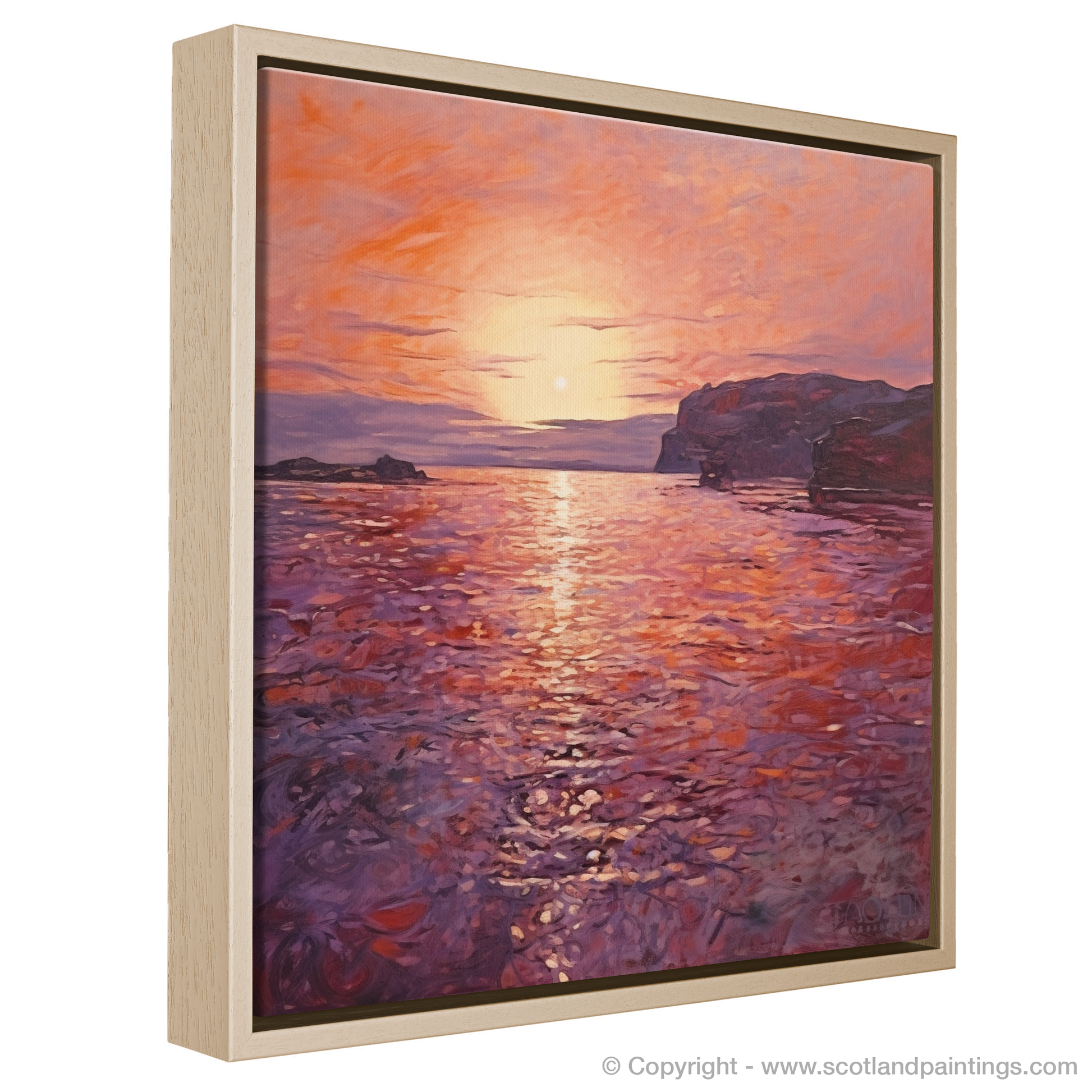 As the day surrenders to twilight, our exclusive print captures the serene beauty of Kiloran Bay bathed in the gentle embrace of a sunset. The tranquil panorama is an exploration of the color field style, rendering the vast sky in rich, resonant hues. Shades of lavender, peach, and deep violet dance across the canvas, capturing the last light of day as it reflects upon the water's surface with an almost molten gold radiance.