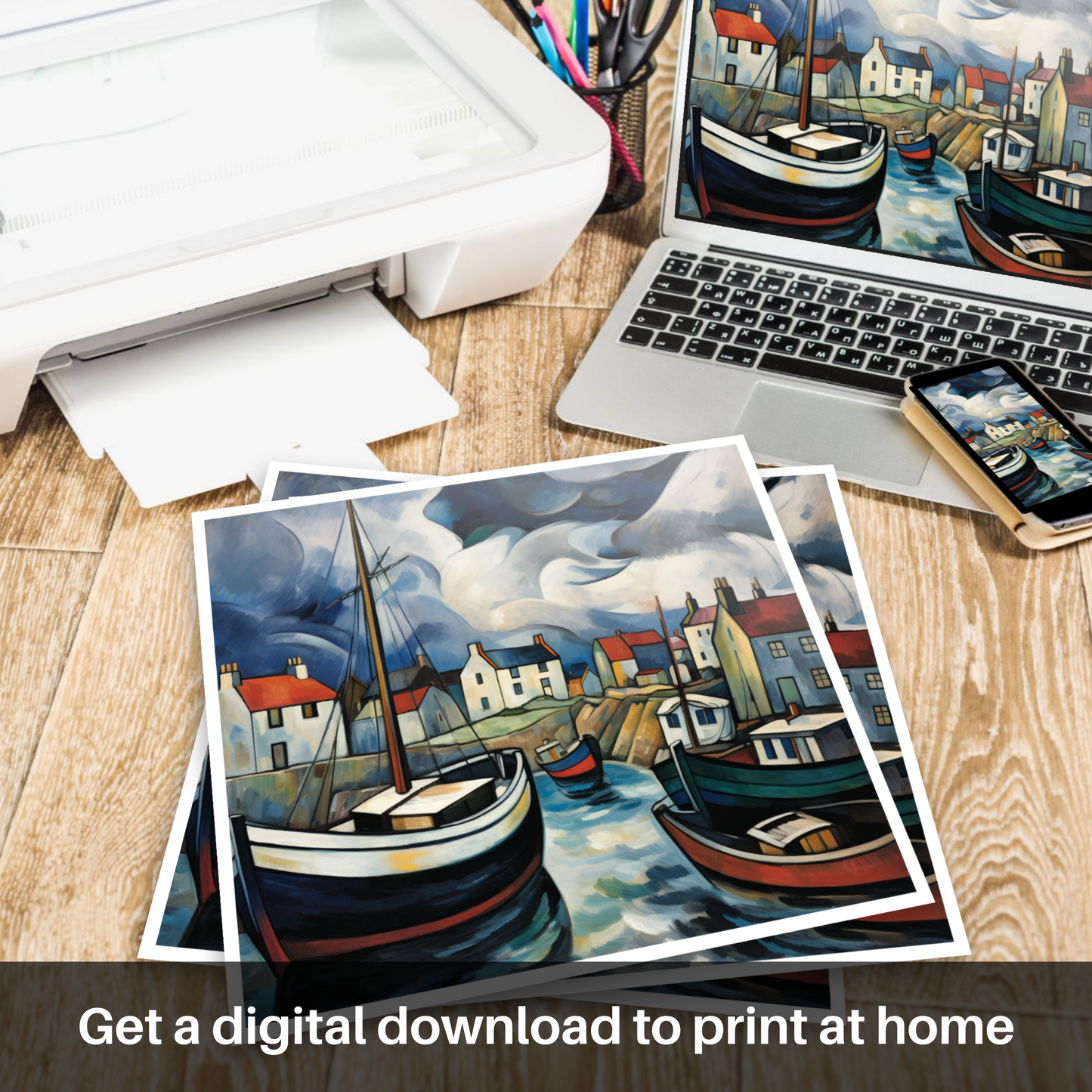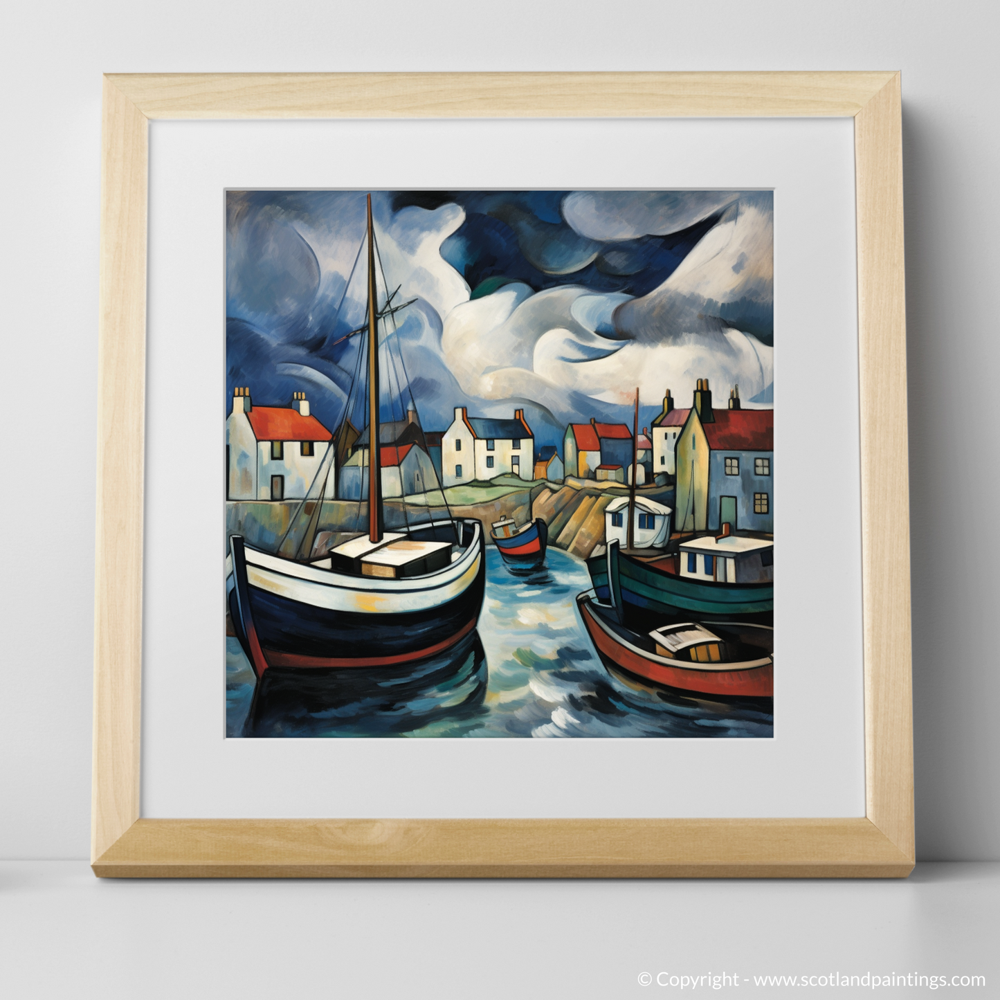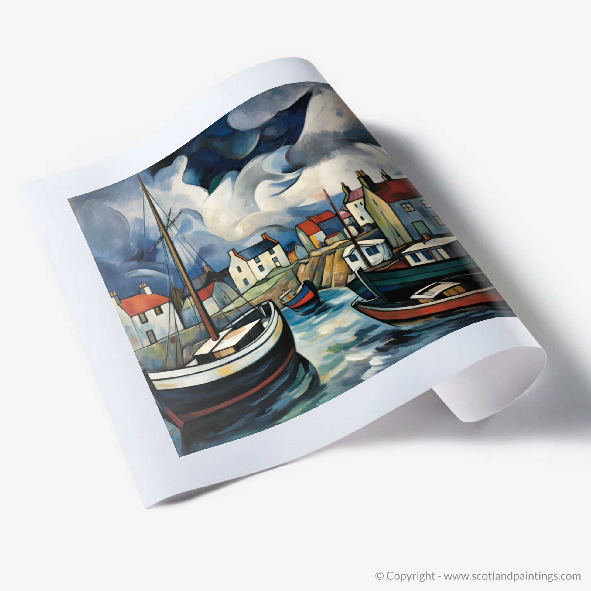 Let the tempestuous beauty of Scotland's rugged coastline wash over you with our striking abstract print, inspired by the enchanting St Monans Harbour under a storm-laden sky. This evocative piece captures the untamed spirit of the sea with bold, swirling strokes delineating the turbulent heavens above. In contrast, the quaint charm of coastal living is portrayed through a tapestry of cubic houses nestled along the water's edge, their walls hued with muted earth tones that whisper of timeless tranquillity amidst the storm.