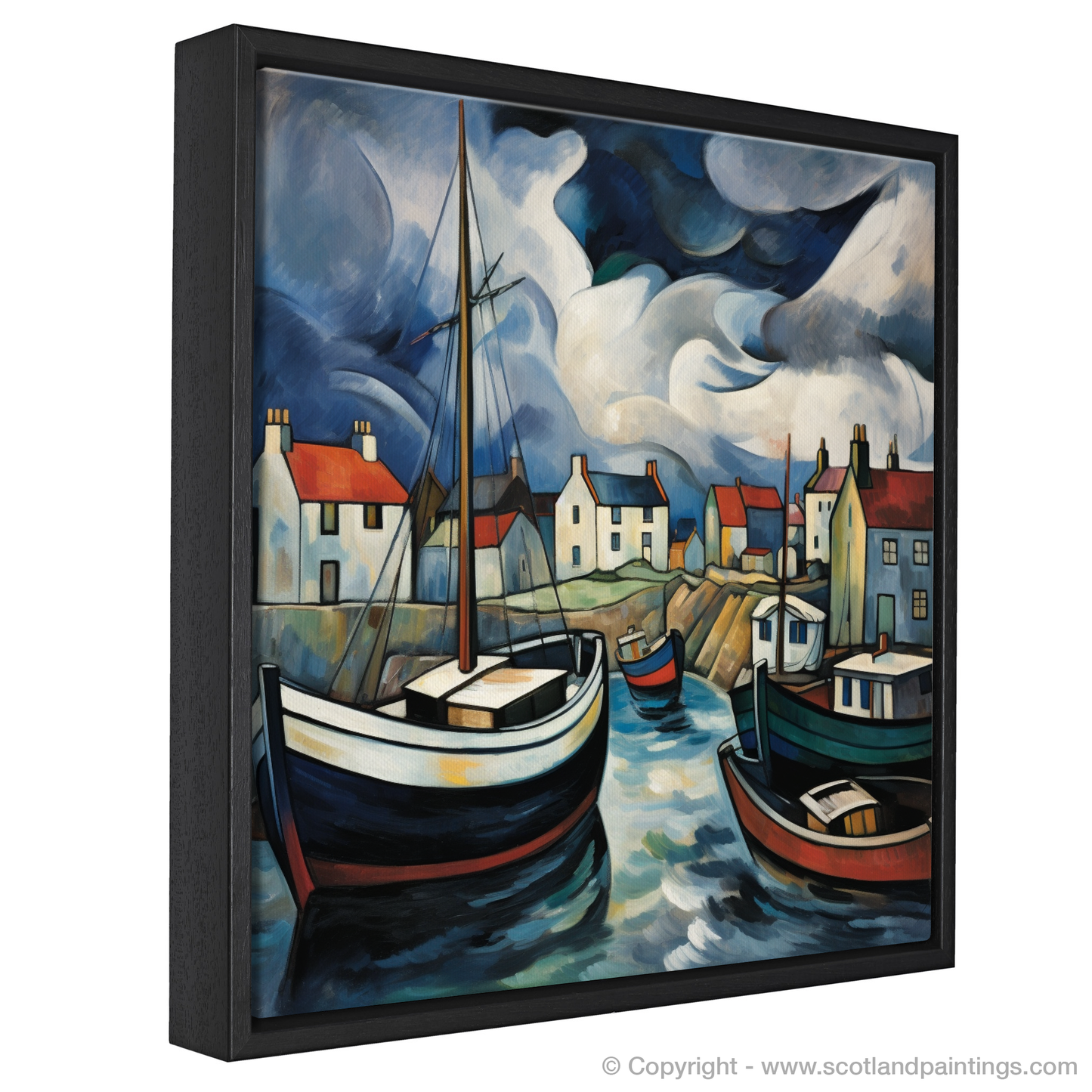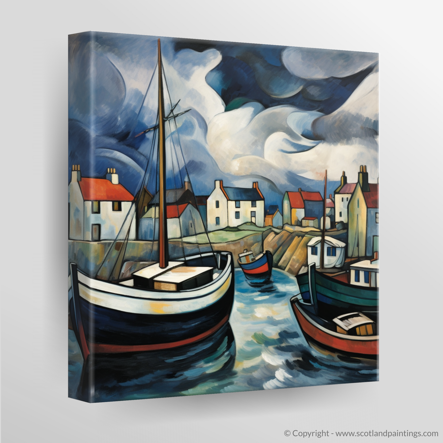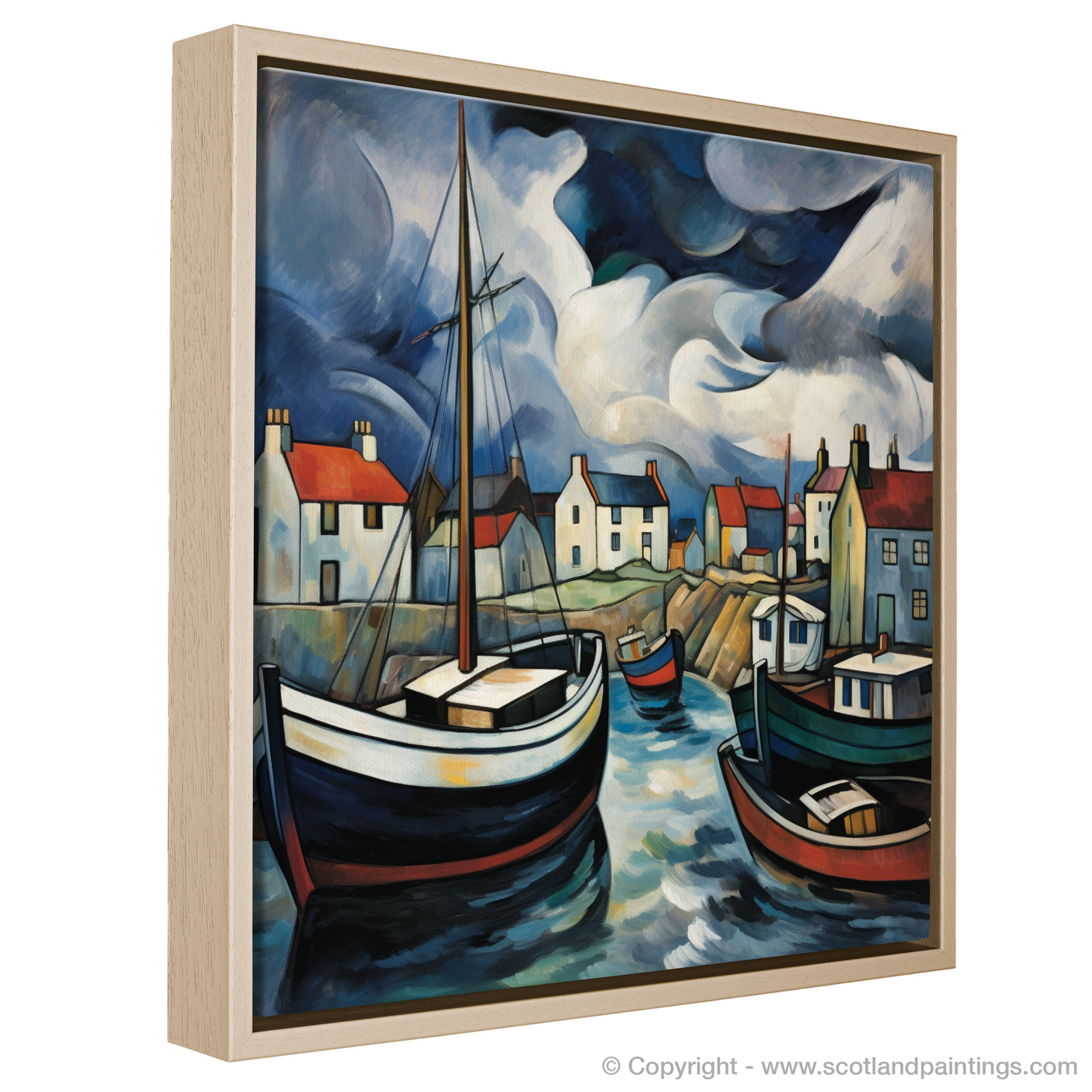 Let the tempestuous beauty of Scotland's rugged coastline wash over you with our striking abstract print, inspired by the enchanting St Monans Harbour under a storm-laden sky. This evocative piece captures the untamed spirit of the sea with bold, swirling strokes delineating the turbulent heavens above. In contrast, the quaint charm of coastal living is portrayed through a tapestry of cubic houses nestled along the water's edge, their walls hued with muted earth tones that whisper of timeless tranquillity amidst the storm.