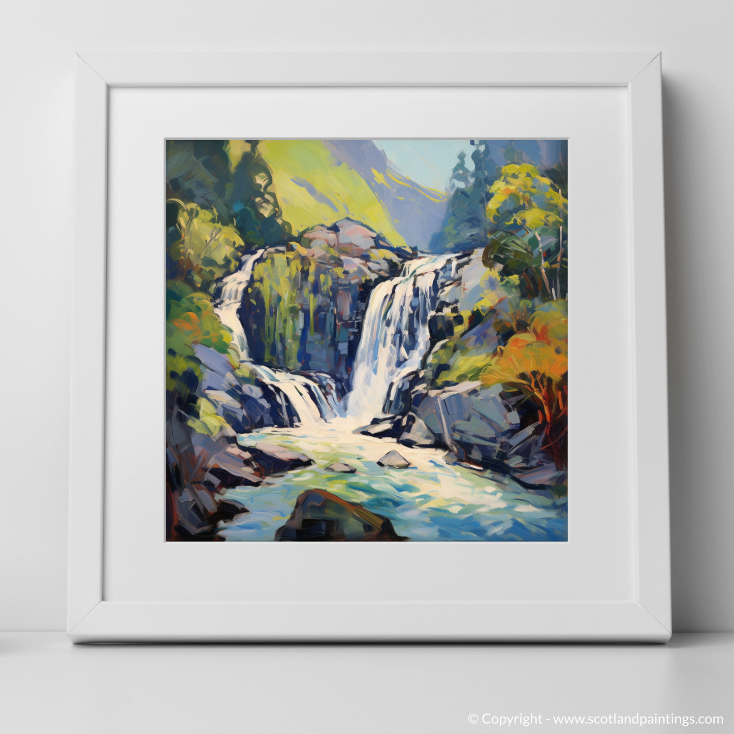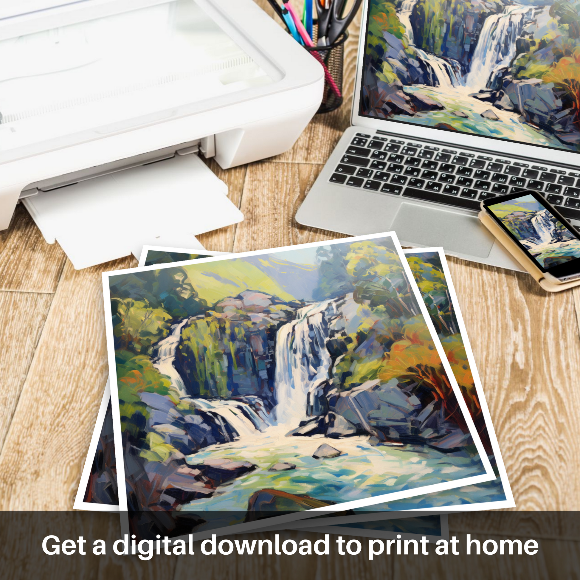 The print features the waterfall's energetic flow, rendered in vivid hues that dance across the canvas, mingling blues and whites to depict the frothy waters tumbling over rugged rocks. Surrounding the cascade, a tapestry of lush foliage is brought to life with an exuberant palette; strokes of emerald green, bright yellow and autumnal orange create a feast for the senses, evoking the untamed beauty of the Scottish woodlands.