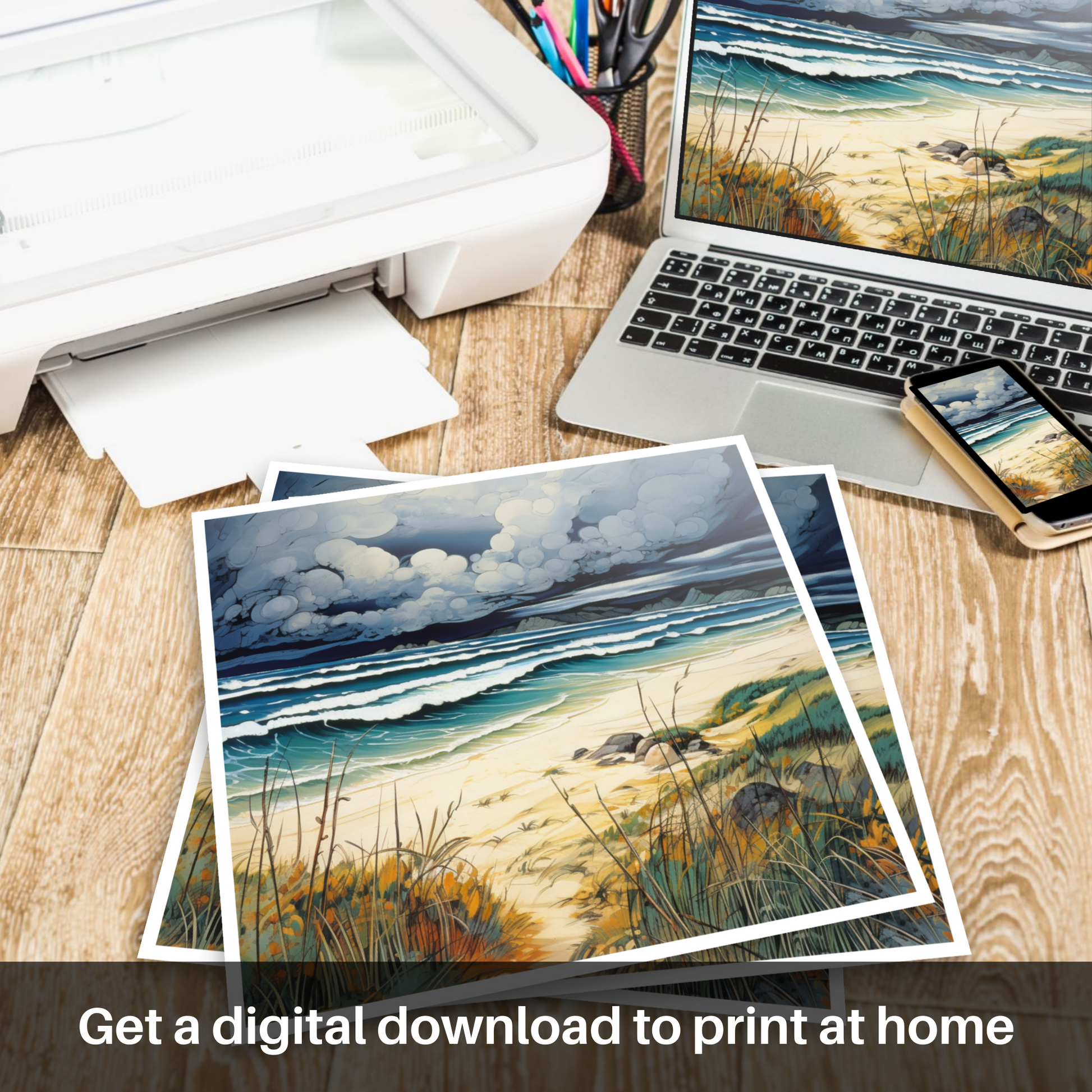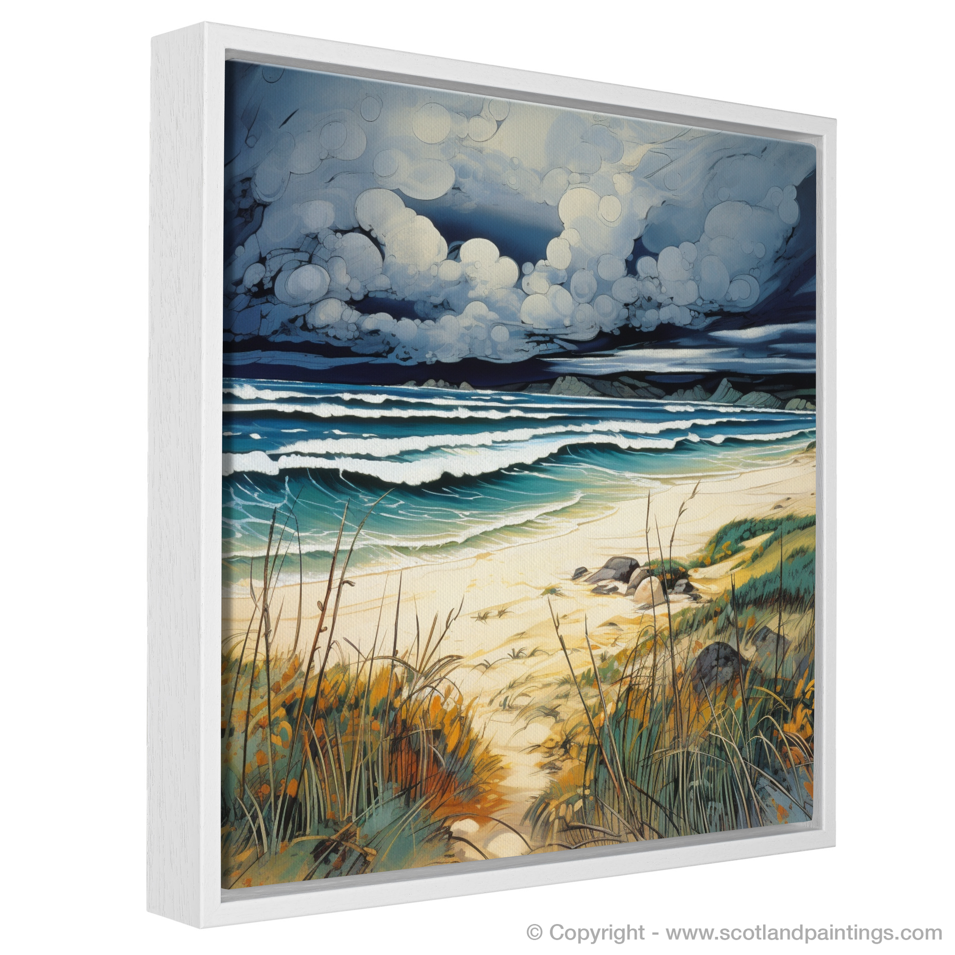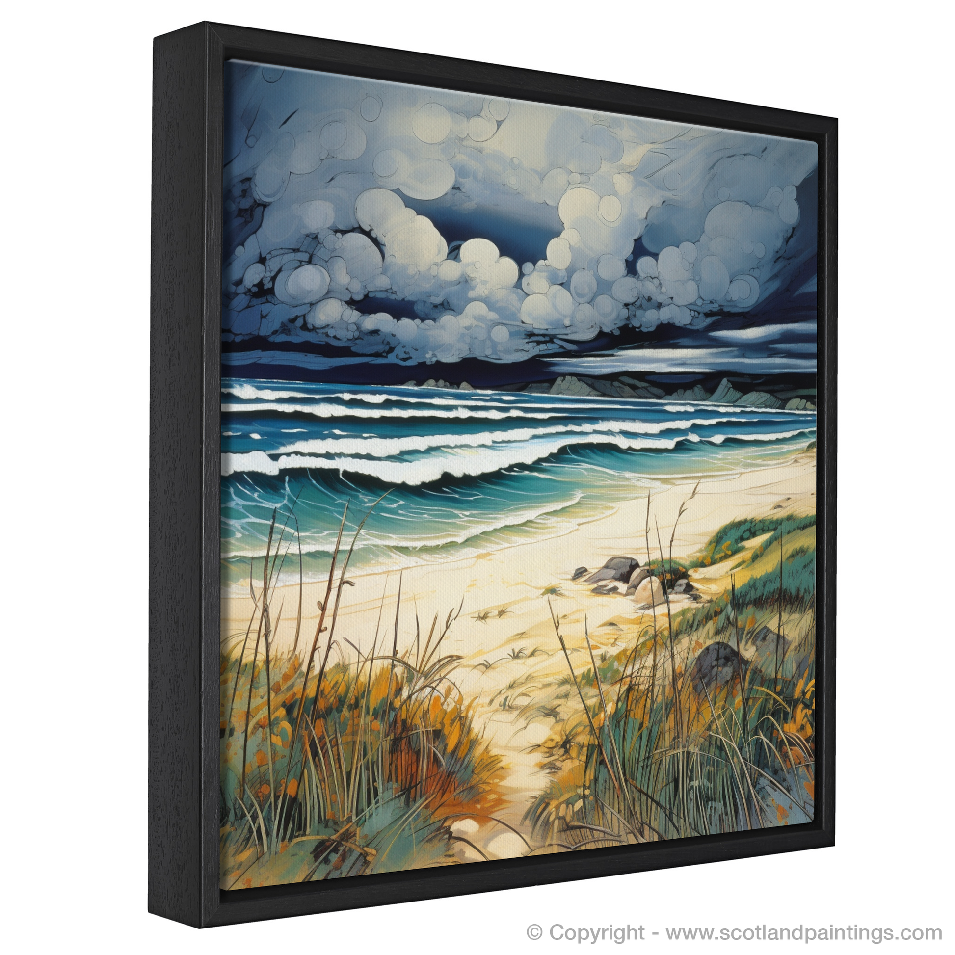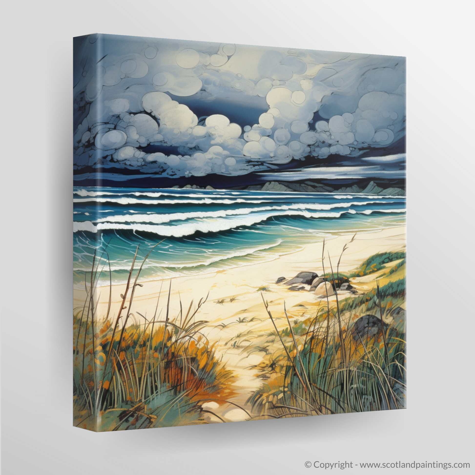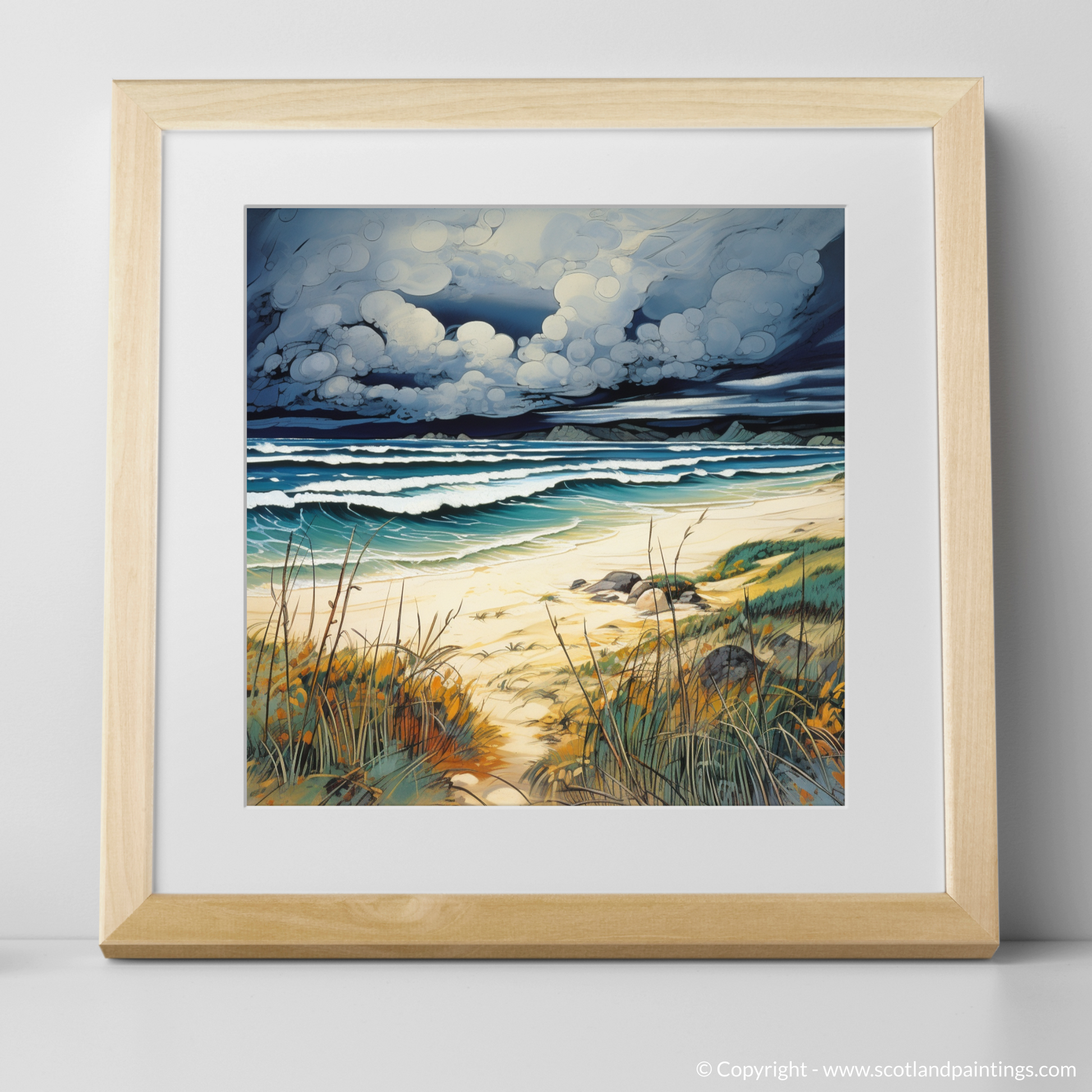 Capturing the untamed spirit of Scarista Beach, this evocative piece transports the viewer straight to the heart of the Scottish coast. Imagine yourself standing on the edge of the Hebrides, where the vastness of the sky dramatically meets the wild sea. The tempest above churns with an energy that is almost palpable, as swirling storm clouds rendered in a stunning palette of moody blues and greys dominate the horizon.