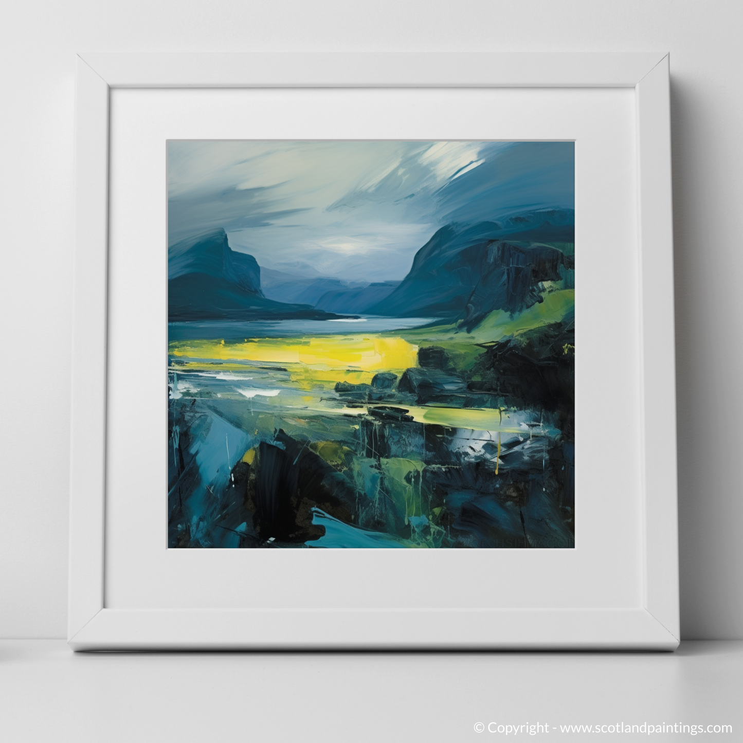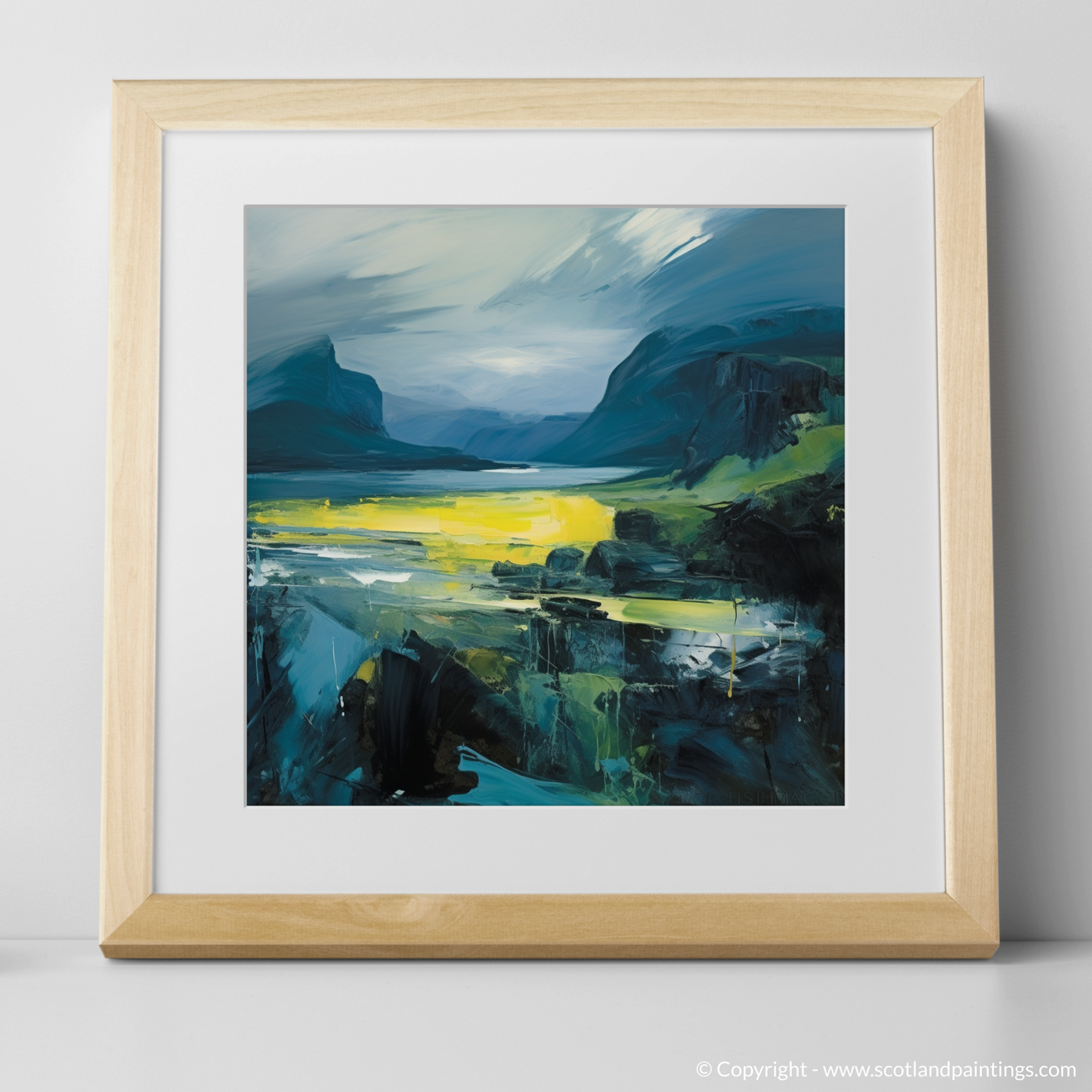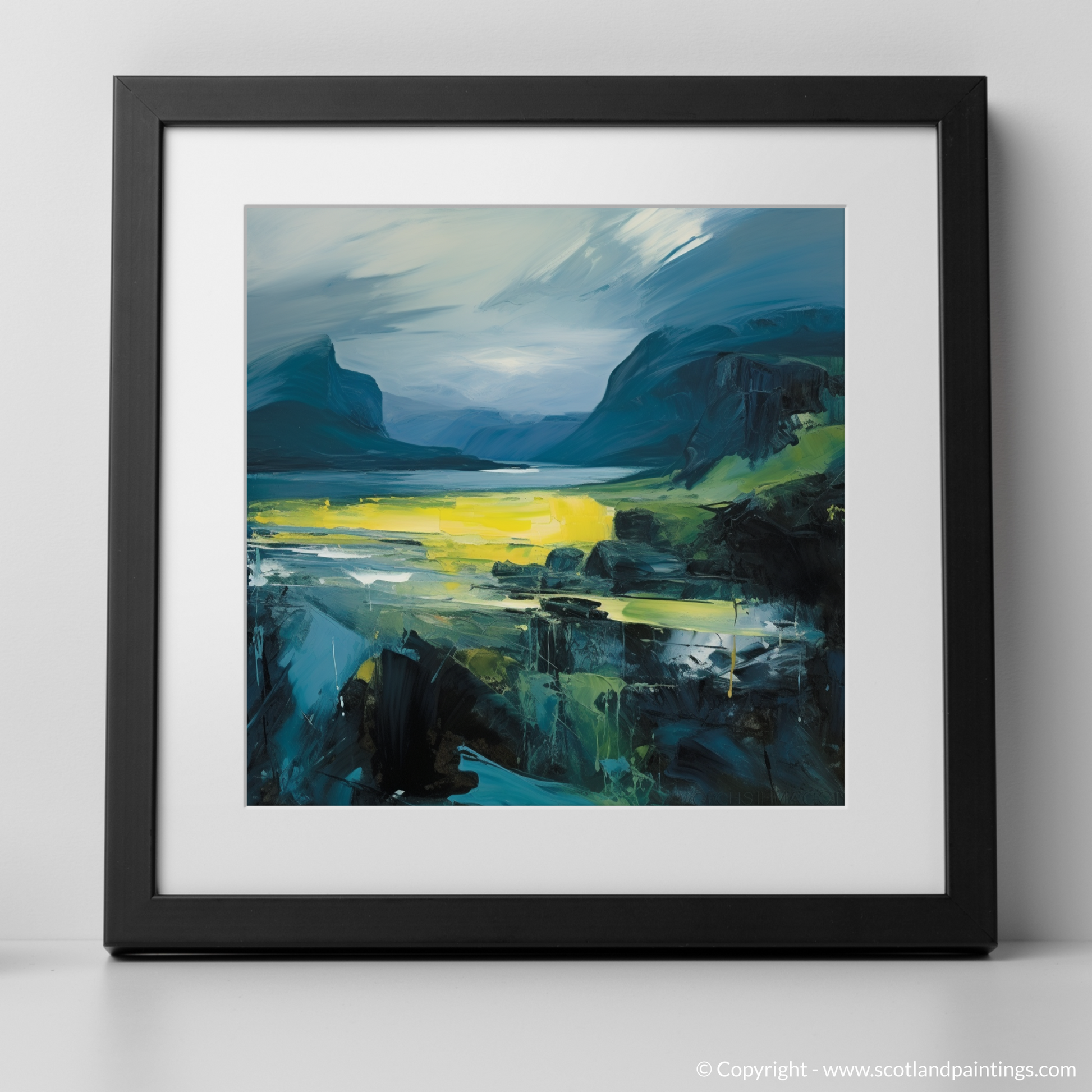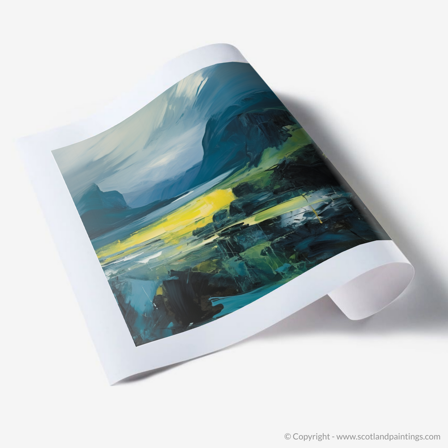 This print offers more than just a visual journey; it's an homage to the spirit of the Scottish islands, a captivating fusion of tumultuous weather and ephemeral light moments. The essence of Skye and its sister isles are captured with impassioned intensity, making this piece a profound statement for any lover of abstract art, expressionist aficionados, or those who hold a special place in their heart for Scotland's unique landscapes.