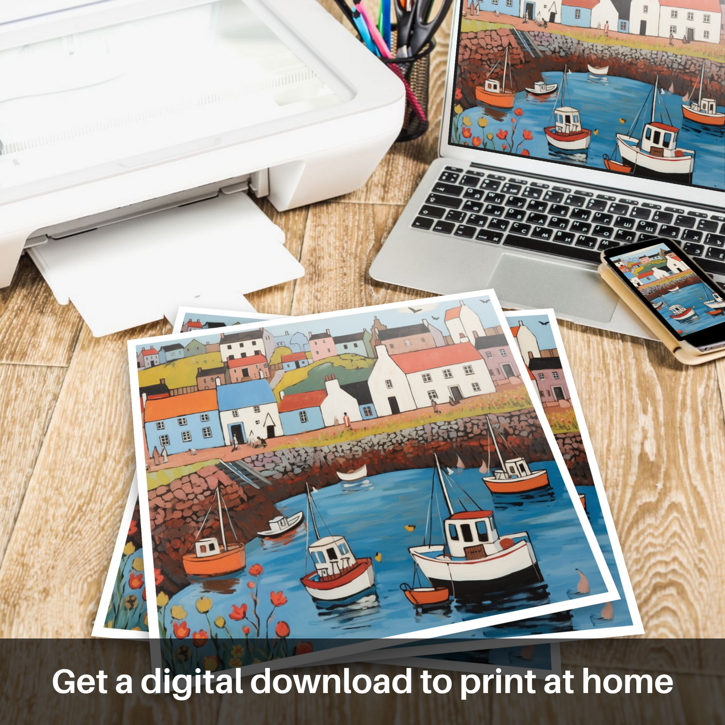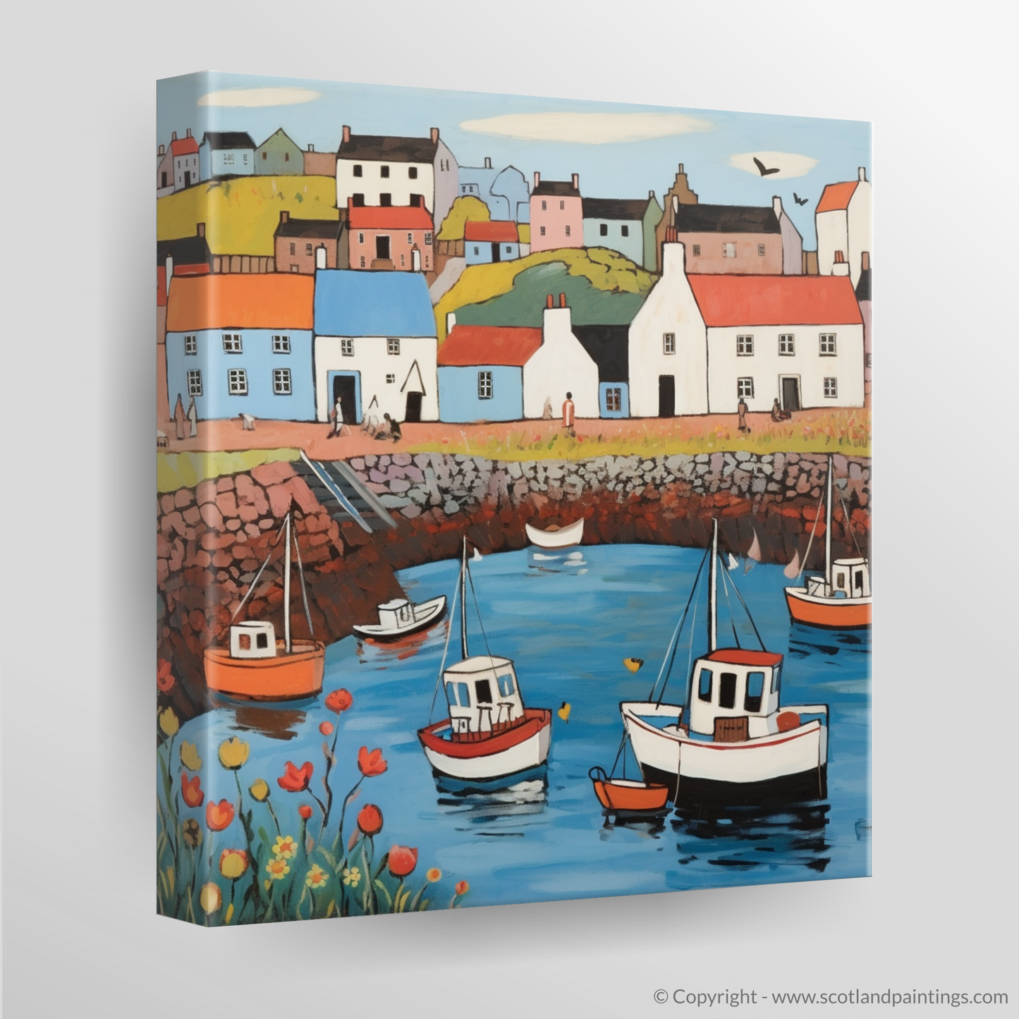 This enchanting print would not only serve as a memento evoking the nostalgia of seaside adventures but would bring into one's space the timeless charm of Scottish coastal life. A perfect anchor for a lover of art that reminisces the spirit of Scotland’s iconic harbours with a touch of playful naivety and joyful colour.