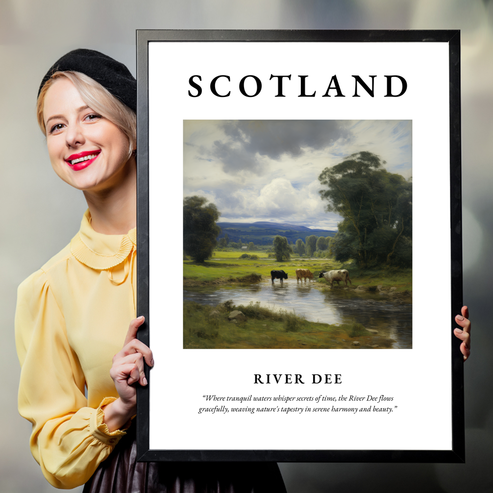 Featuring the majestic words “SCOTLAND” in bold lettering, this poster celebrates the serene beauty of the River Dee, depicted in an enchanting Impressionist style. Below the painting, find inspiration in the delicate quote: “Where tranquil waters whisper secrets of time, the River Dee flows gracefully, weaving nature's tapestry in serene harmony and beauty.” This harmonious blend of text and art captures the essence of Scotland’s natural beauty, perfect for those who hold a special connection to the region, whether through visits, ancestry, or an appreciation of its culture and landscapes.