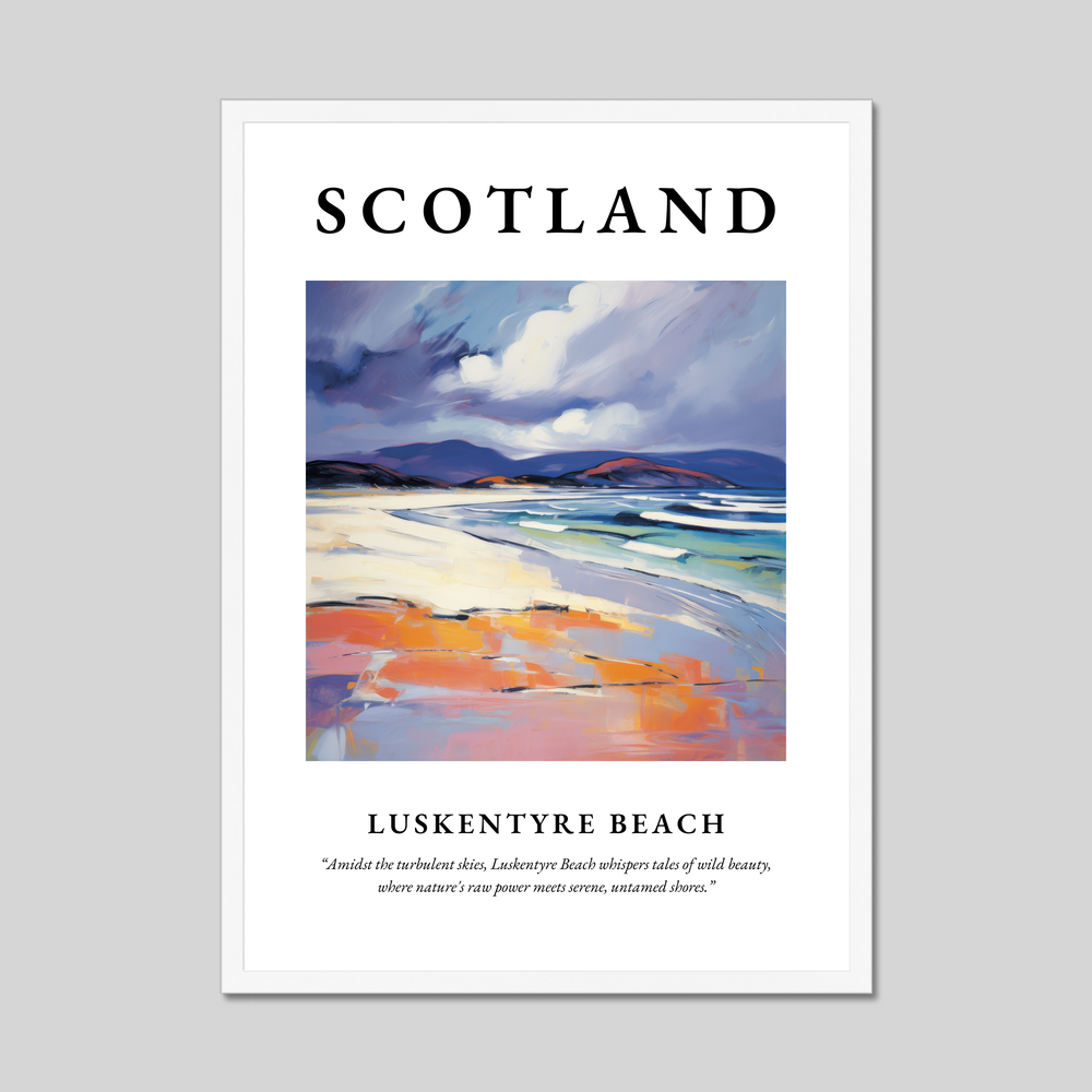 The poster's design is impeccably structured: the word “SCOTLAND” dominates the top in bold lettering, instantly commanding attention and setting the tone for what lies beneath. The heart of the piece is a vivid painting of Luskentyre Beach, rendered in a dynamic Fauvism style. The bold, expressive brushstrokes capture the interplay of turbulent skies and tranquil shores, conjuring a scene of raw nature meeting serene landscapes. Beneath this showcase of artistry, a quote whispers of the beach's untamed allure: “Amidst the turbulent skies, Luskentyre Beach whispers tales of wild beauty, where nature's raw power meets serene, untamed shores.”