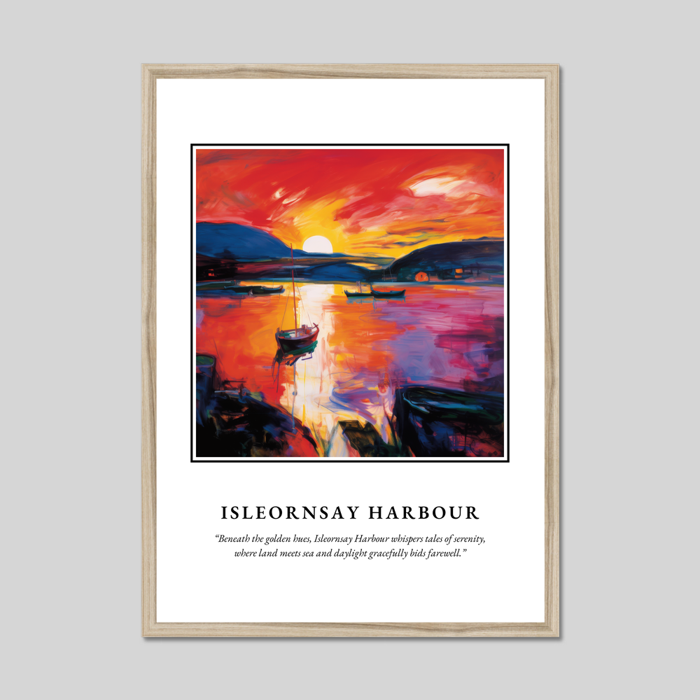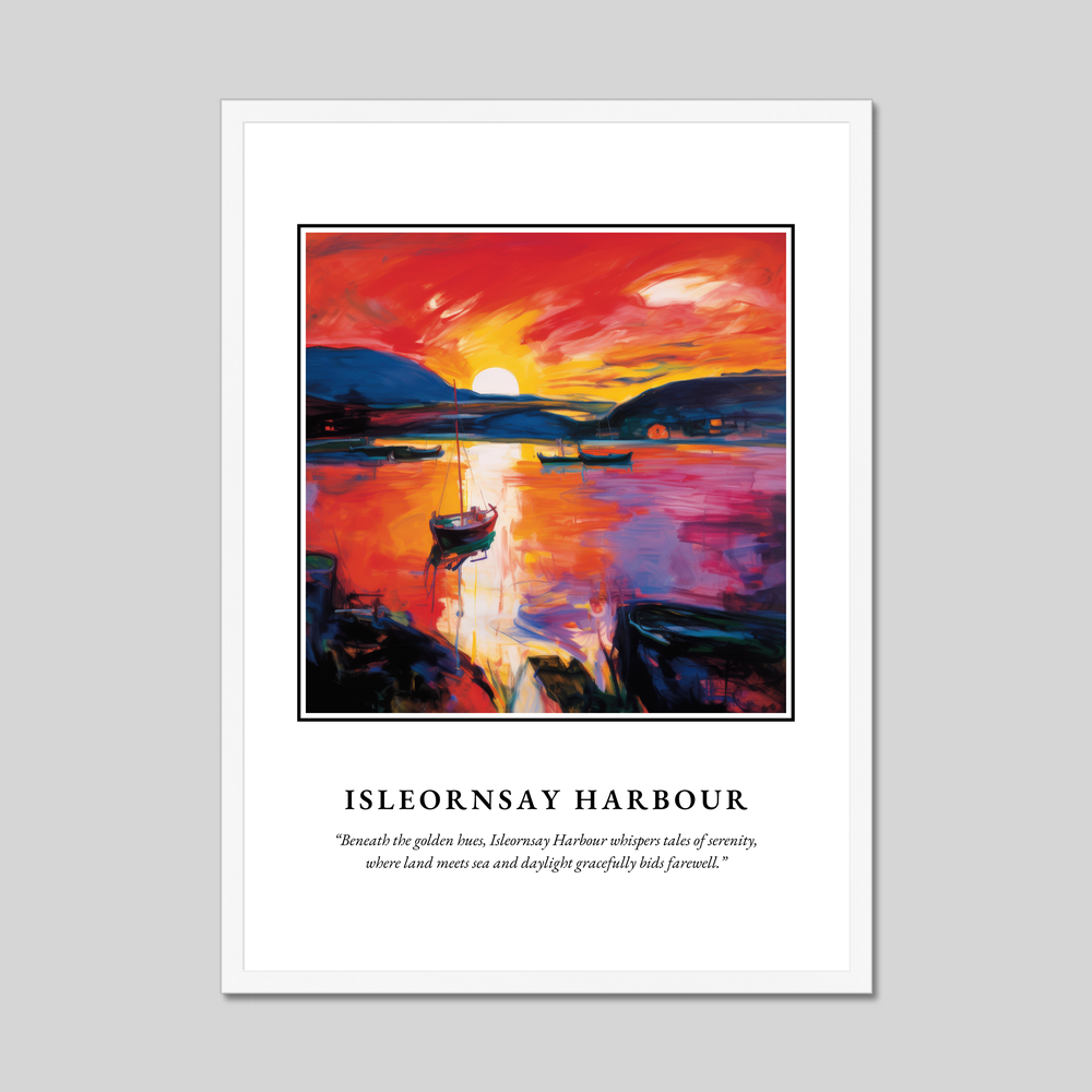 Underneath the painting, the quote gently draws you deeper into the scene: "Beneath the golden hues, Isleornsay Harbour whispers tales of serenity, where land meets sea and daylight gracefully bids farewell." This eloquent touch evokes the peaceful essence of the harbour and leaves a lasting impression.