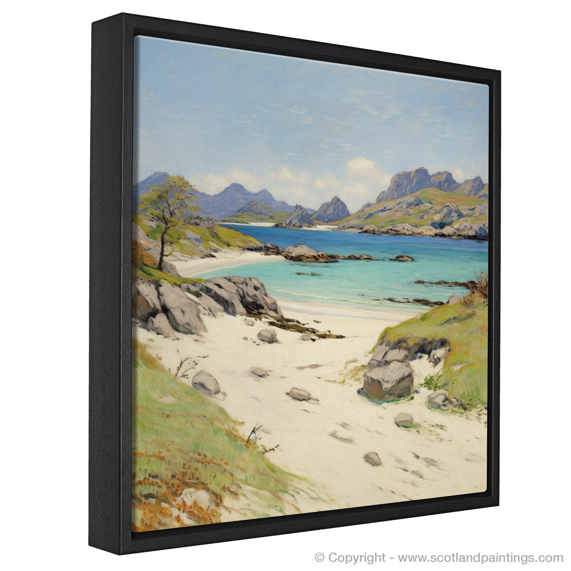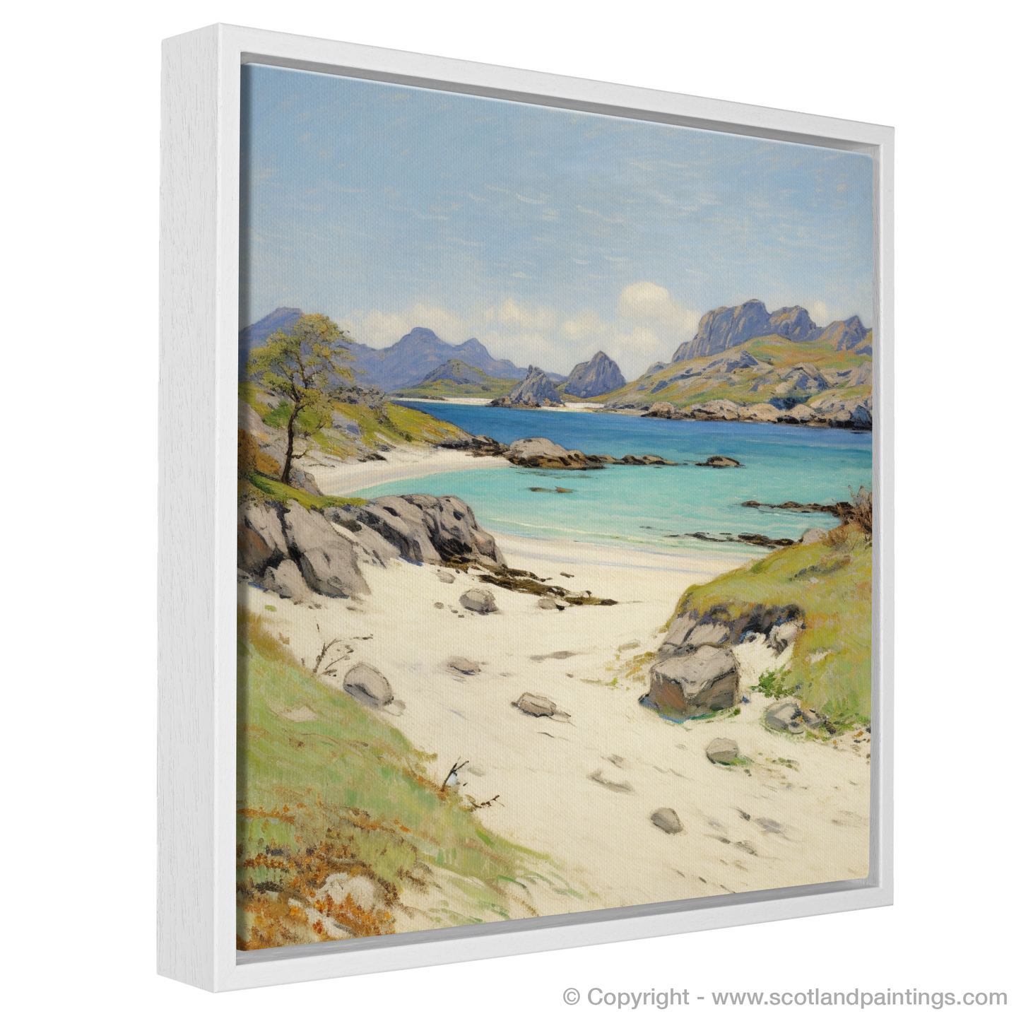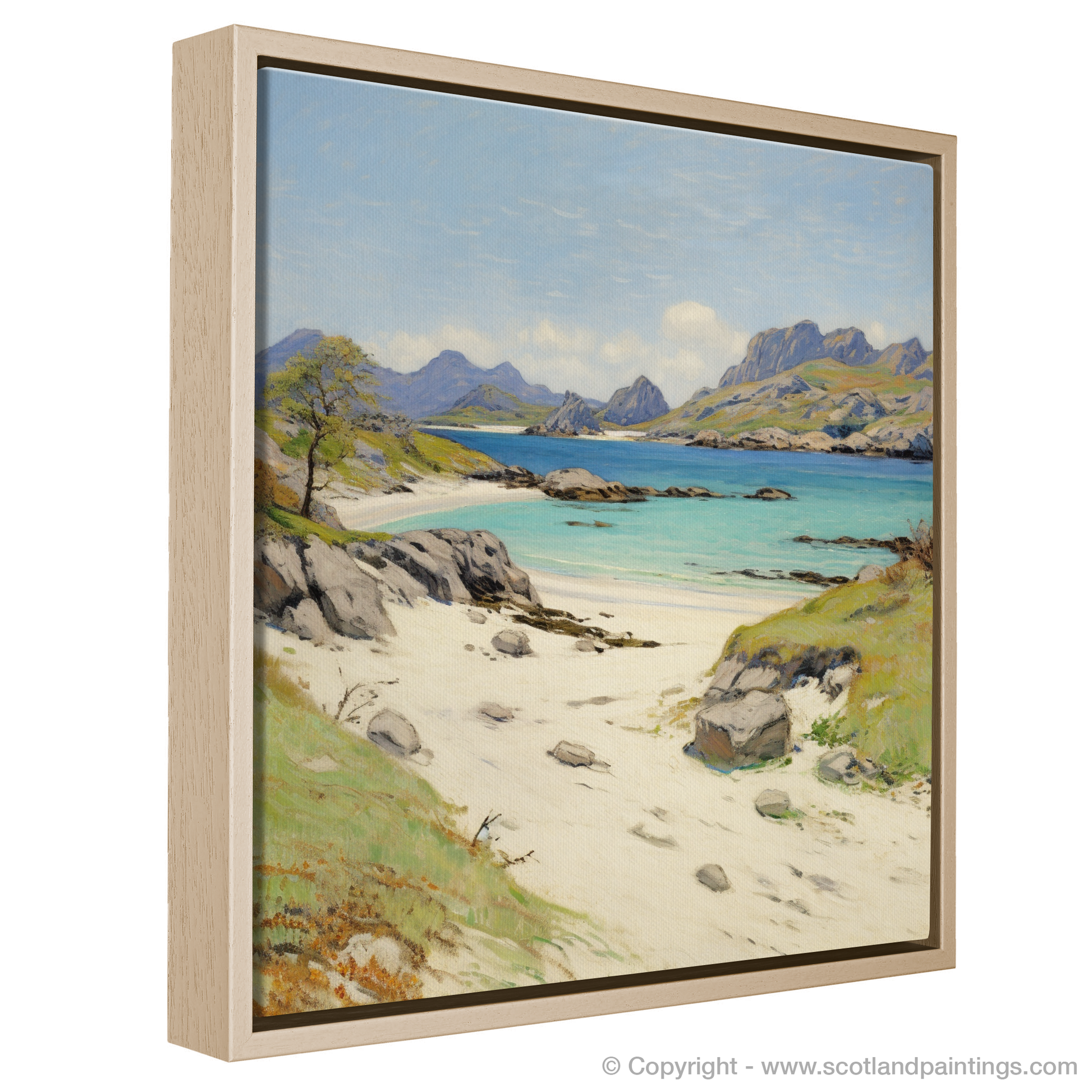 Immerse yourself in the serene beauty of one of Scotland's hidden gems with this evocative impressionistic print. Every stroke of this stunning piece is a subtle dance of colour and light, capturing the idyllic charm of Achmelvich Bay. The soft brushwork portrays the pristine white sands that curve gently into the vivid turquoise waters, creating a tranquil shoreline that beckons with its peaceful embrace.