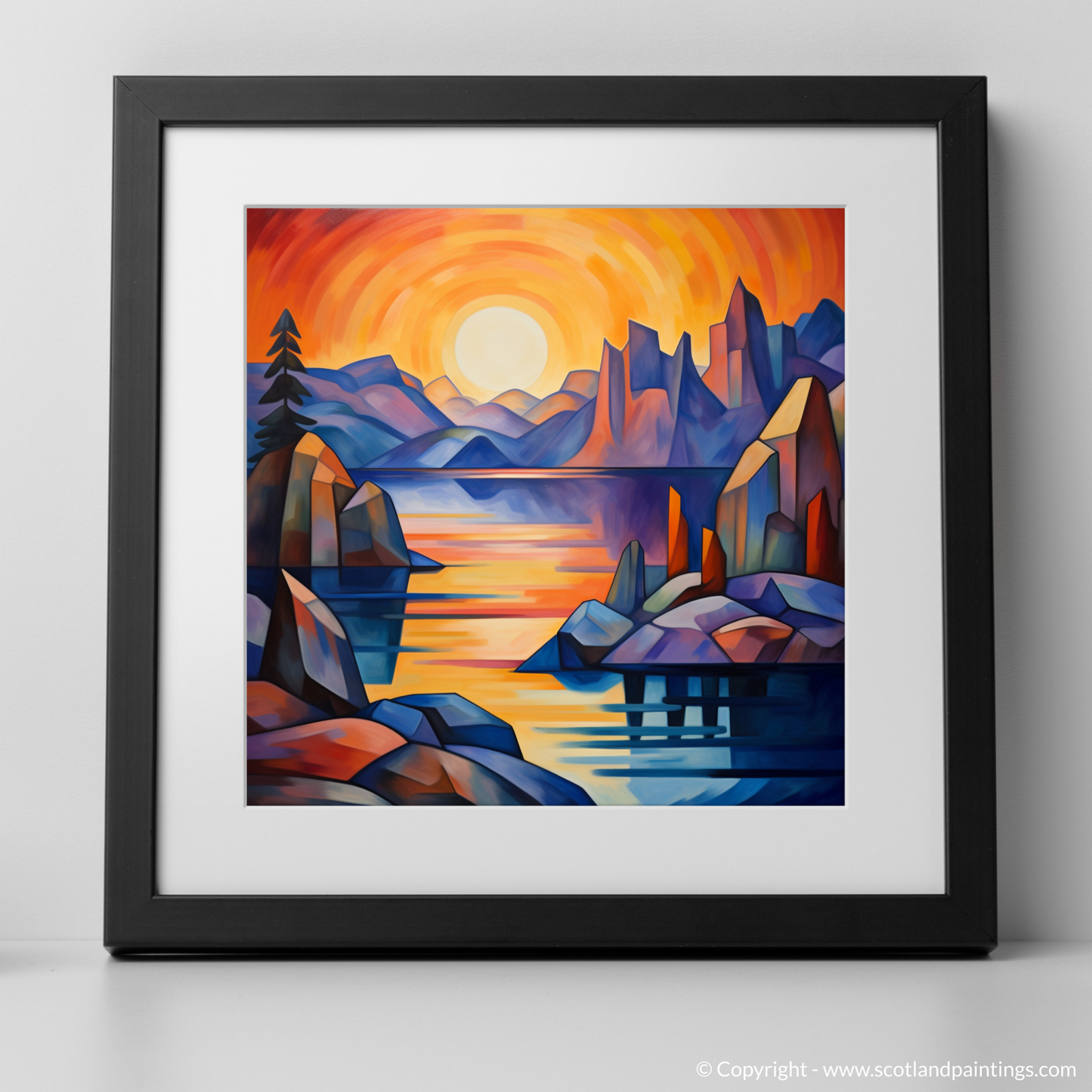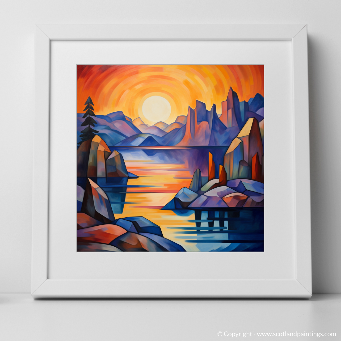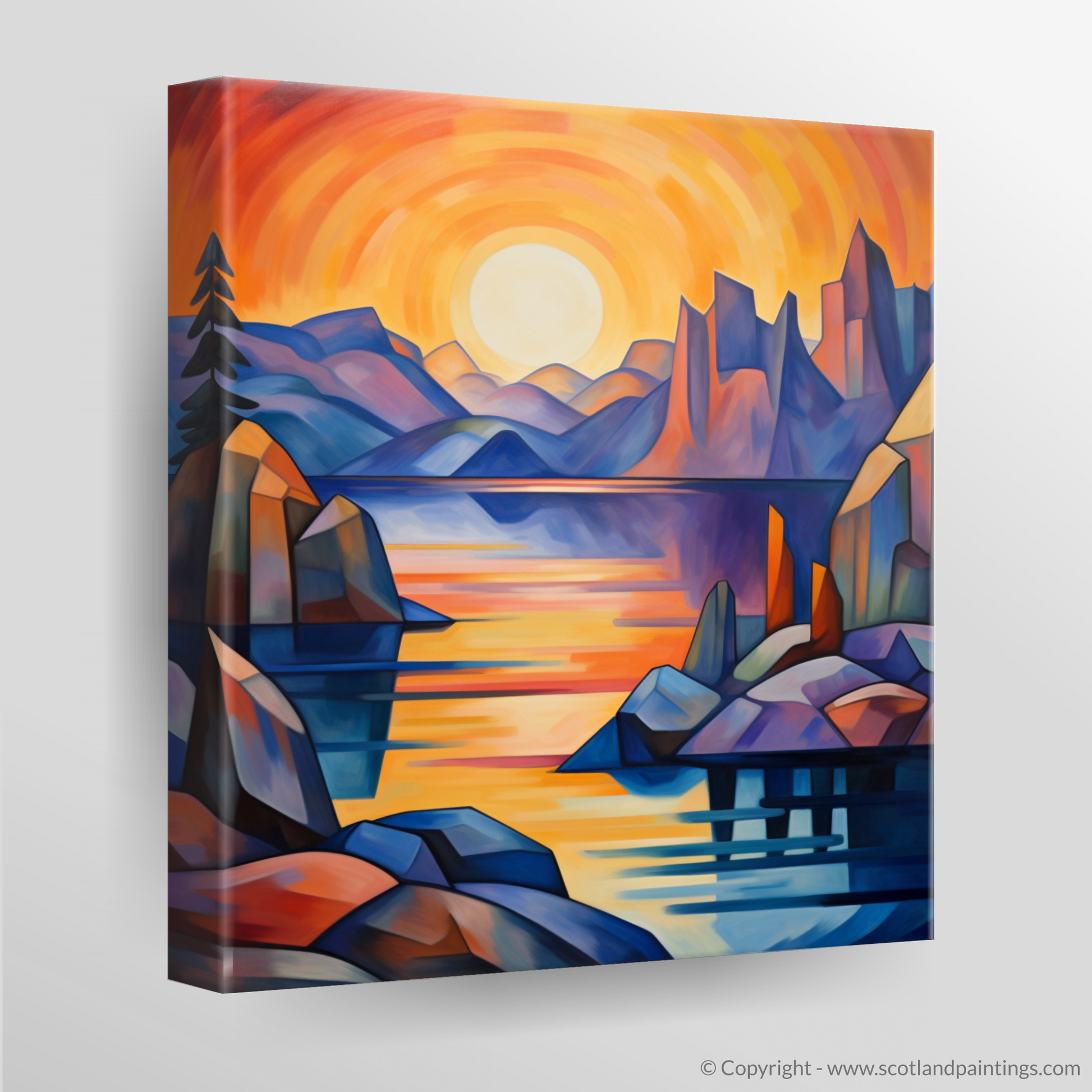 The scene before you, reminiscent of the Scottish Coves, is alive with a vivacious spectrum - the sky a whirlpool of incandescent oranges, passionate reds, and gentle purples, suggesting the fleeting moments as day transitions into night. The serene waters of the loch, dappled with reflections of the sun's dying light, offer an impression of tranquillity amidst the dynamic geometry of its surrounds.