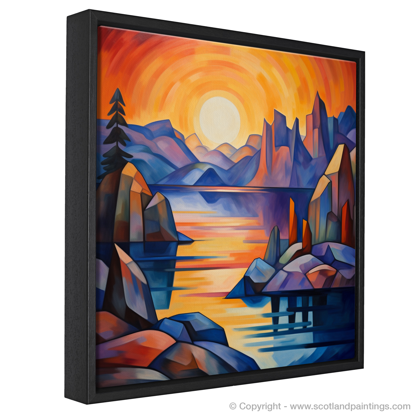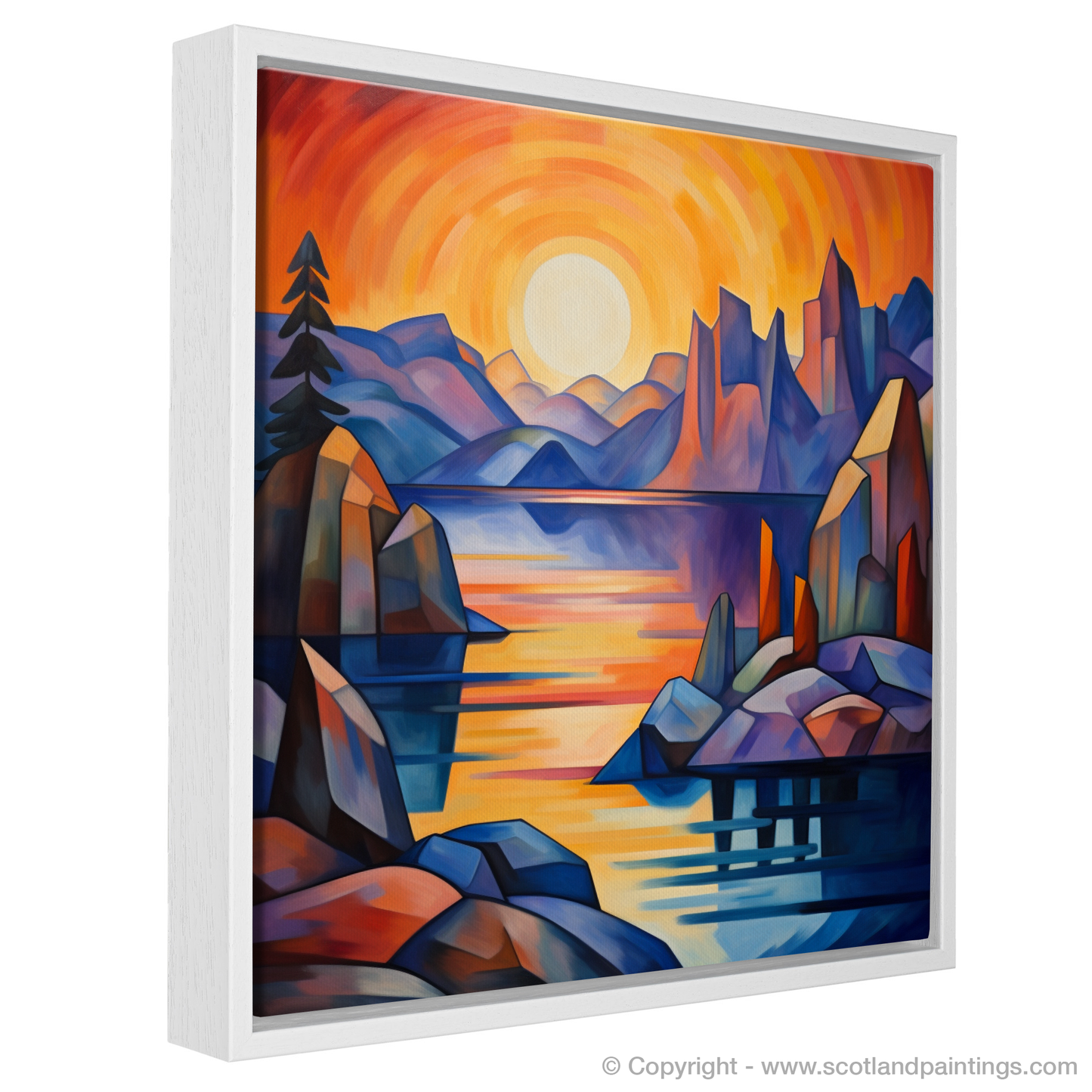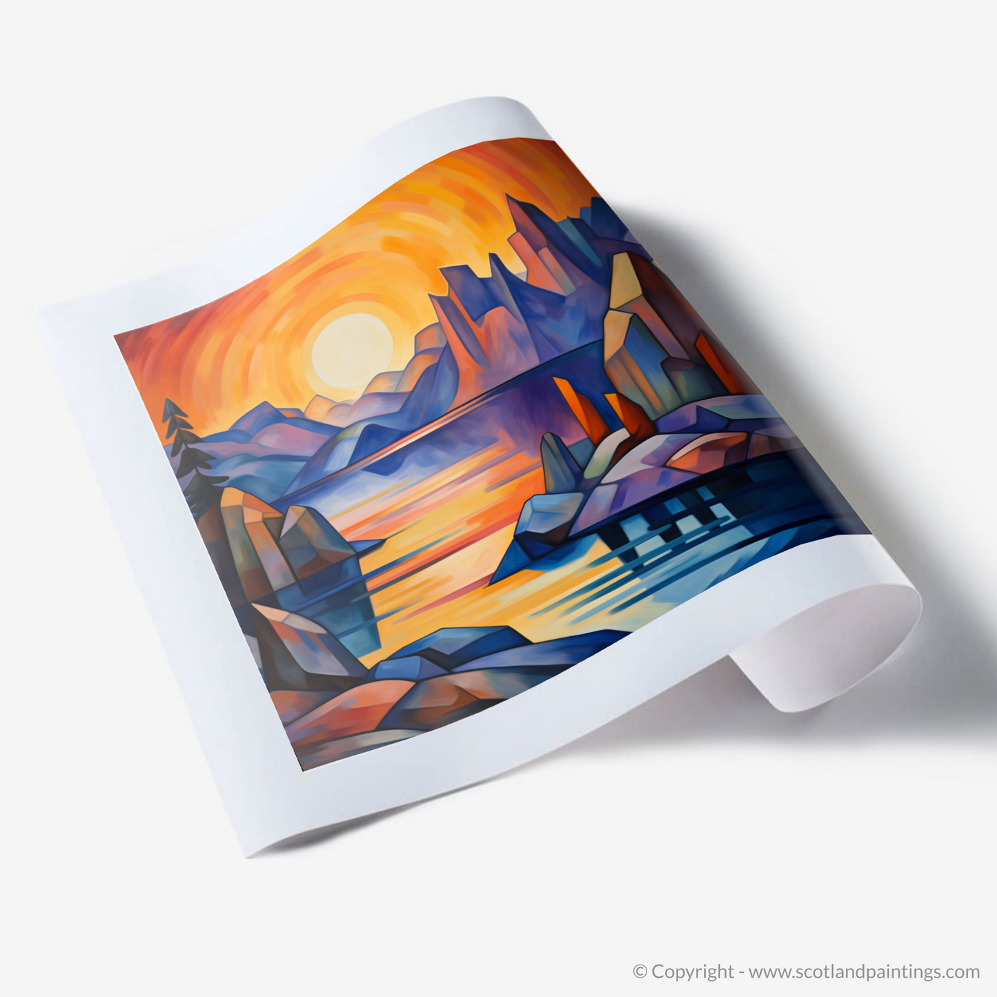 The scene before you, reminiscent of the Scottish Coves, is alive with a vivacious spectrum - the sky a whirlpool of incandescent oranges, passionate reds, and gentle purples, suggesting the fleeting moments as day transitions into night. The serene waters of the loch, dappled with reflections of the sun's dying light, offer an impression of tranquillity amidst the dynamic geometry of its surrounds.
