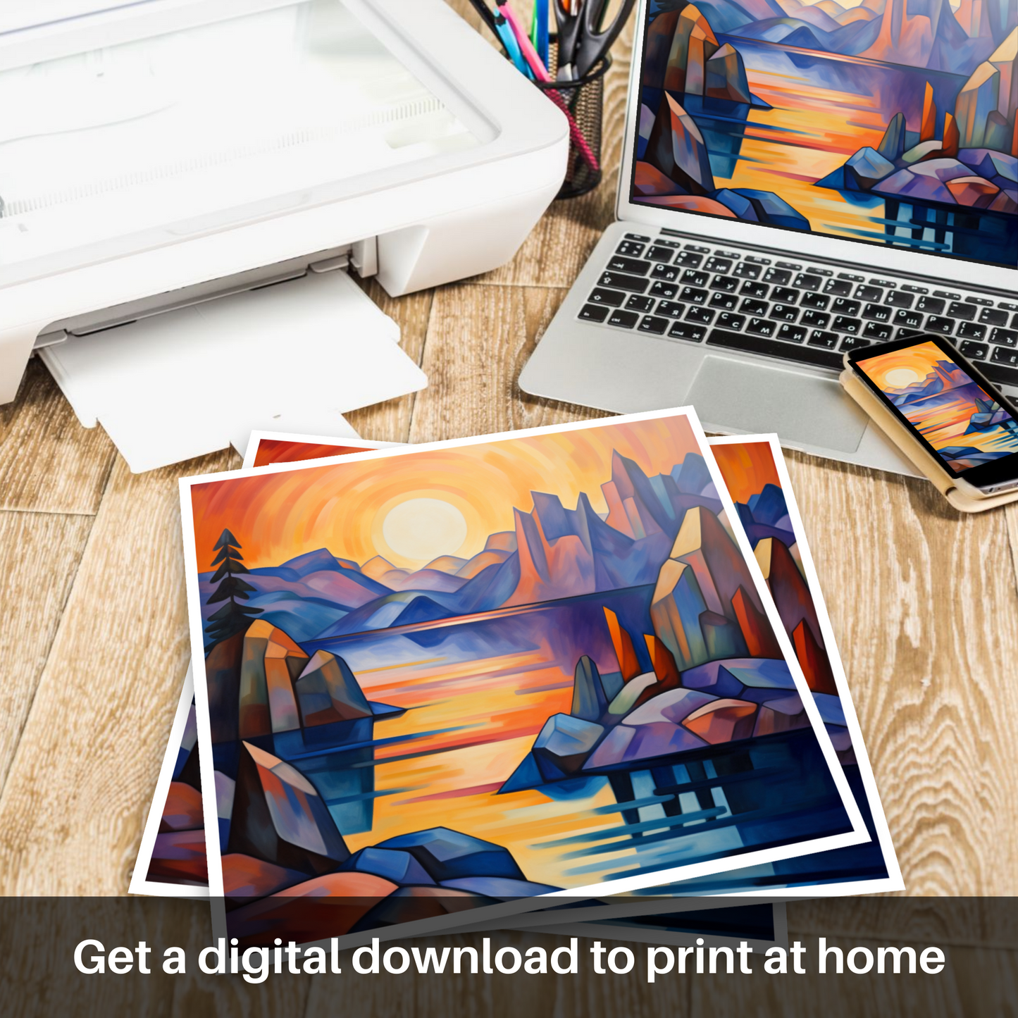 Bathed in the warm glow of a setting sun, this evocative print captures the rugged beauty of Loch Spelve, as seen through the prism of Cubism. Angular forms fragment the landscape into a tapestry of shapes, allowing violet mountain ridges, which recede rhythmically into the distance, to contrast boldly against the fiery orb suspended above.
