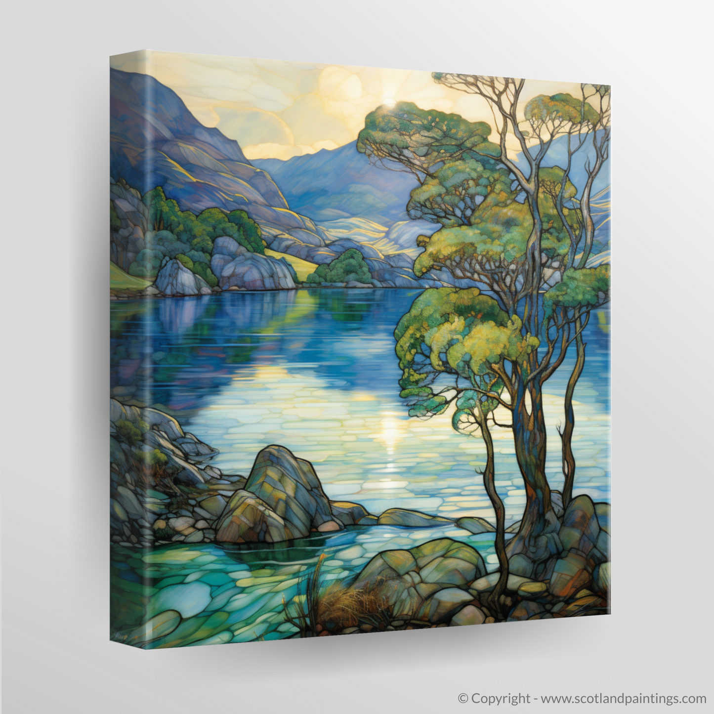 Below, the rocky shores of Loch Katrine are rendered with a mesmerising fusion of colours that suggest both the solidity of stone and the fluidity of water. The shoreline curves inward, guiding the viewer's gaze across the reflective surface of the water, which shimmers with harmonious shades of blues and yellows, mirroring a subtly stylised sunlit sky.