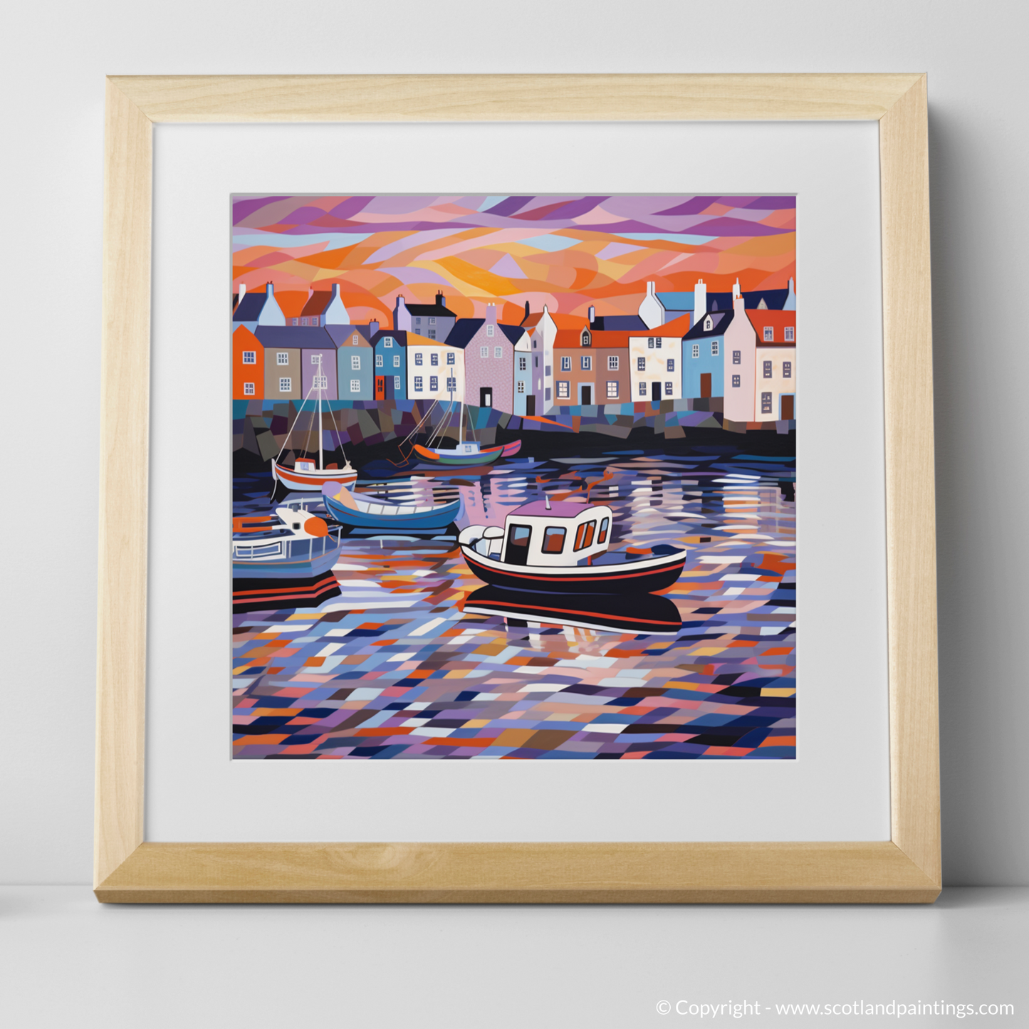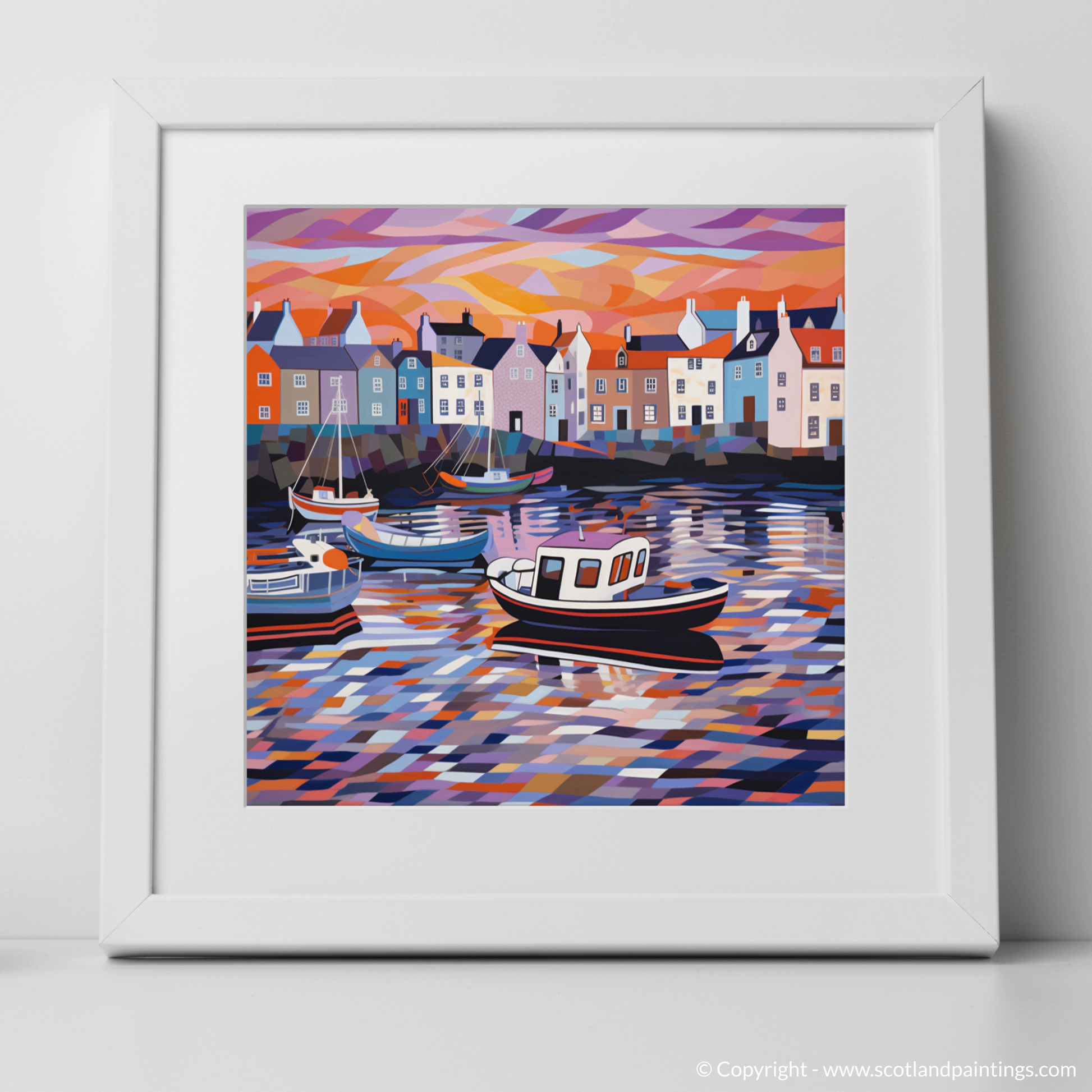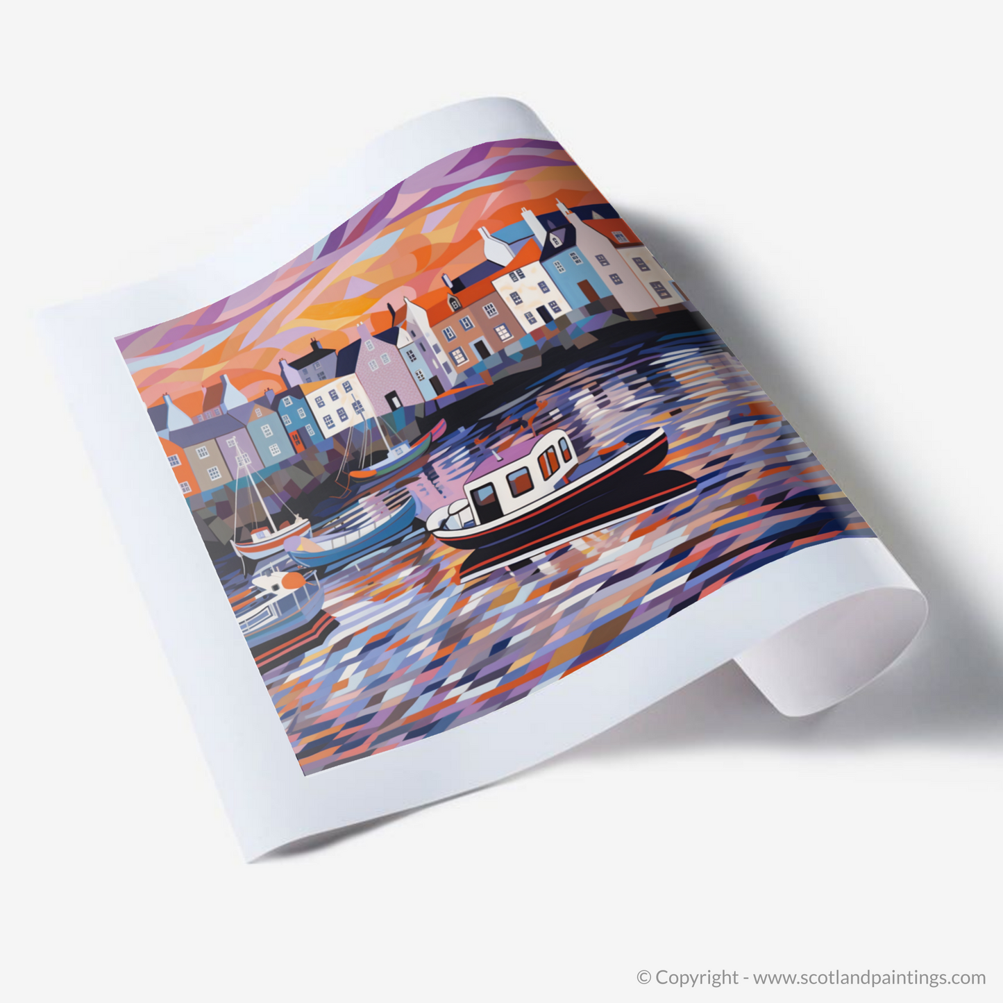Capturing the serene atmosphere of Pittenweem Harbour at the day's close, this exquisite abstract print invites viewers into a world where twilight meets the tranquil waters of this cherished Scottish locale. The harbour, a symphony of gentle forms and moored vessels, is elegantly portrayed against a backdrop of quaint houses that radiate warmth with their inviting pastel facades. Each building bears a distinct palette, contributing to the overall mosaic of hues that defines this charming seascape.