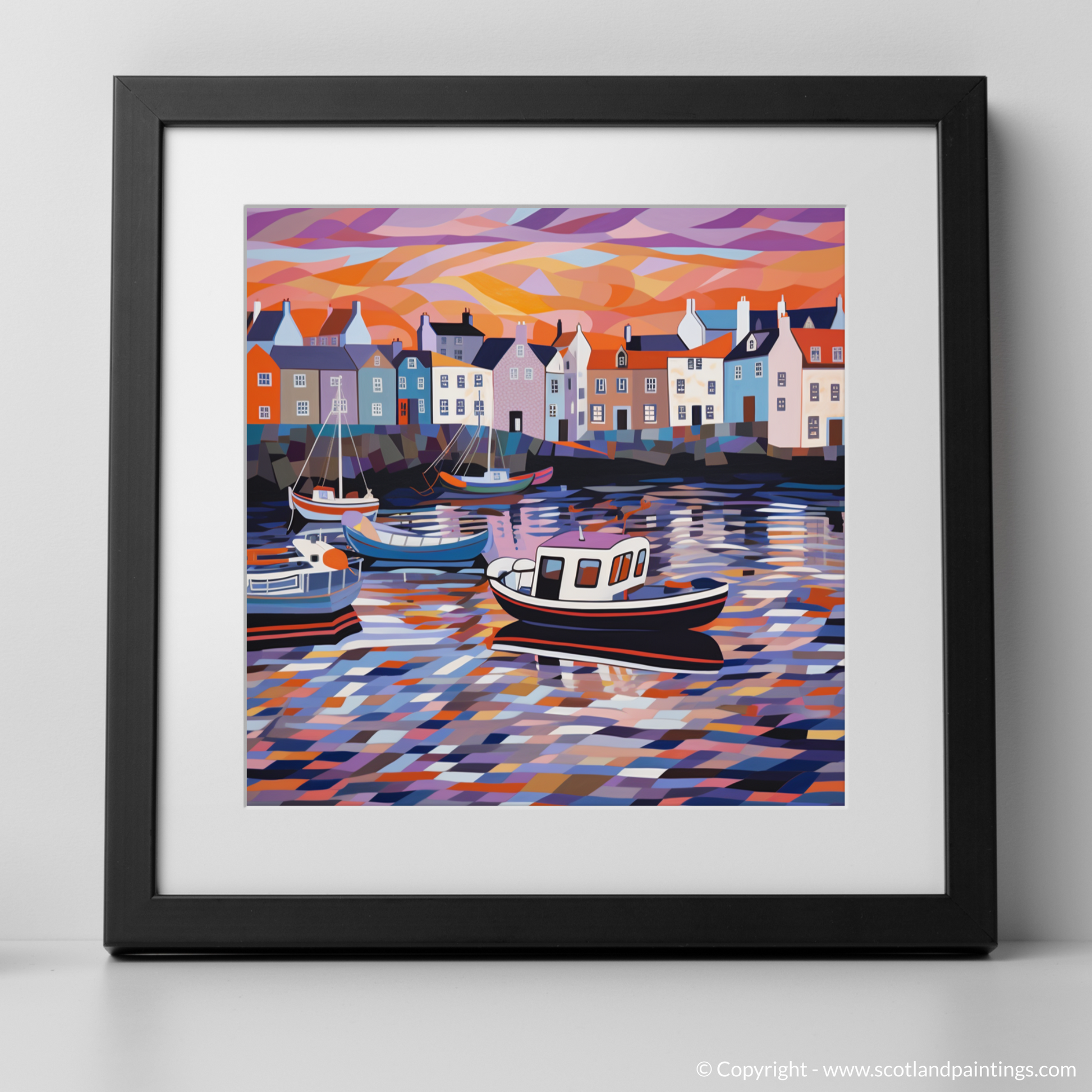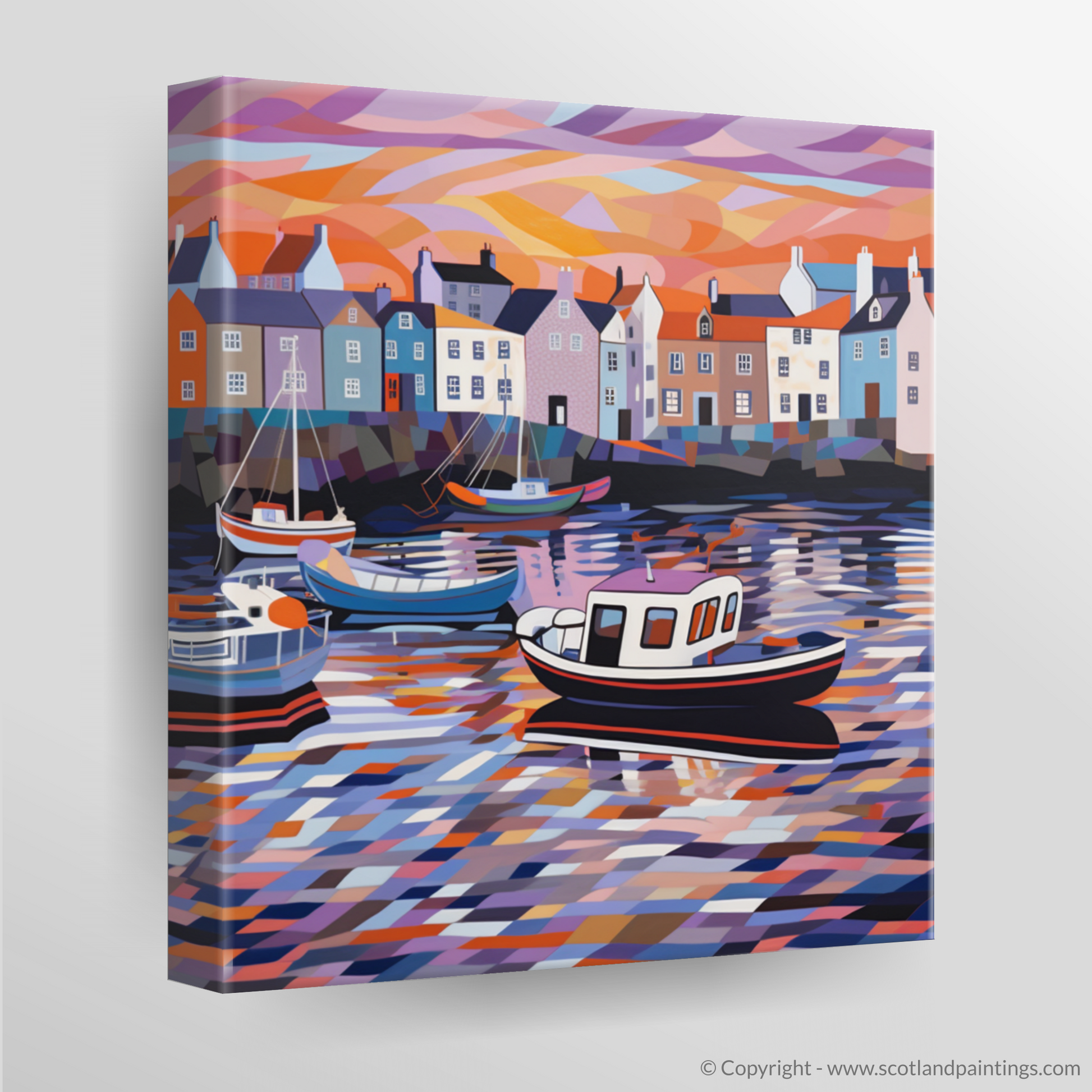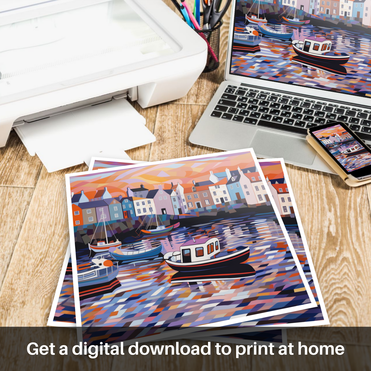 Capturing the serene atmosphere of Pittenweem Harbour at the day's close, this exquisite abstract print invites viewers into a world where twilight meets the tranquil waters of this cherished Scottish locale. The harbour, a symphony of gentle forms and moored vessels, is elegantly portrayed against a backdrop of quaint houses that radiate warmth with their inviting pastel facades. Each building bears a distinct palette, contributing to the overall mosaic of hues that defines this charming seascape.