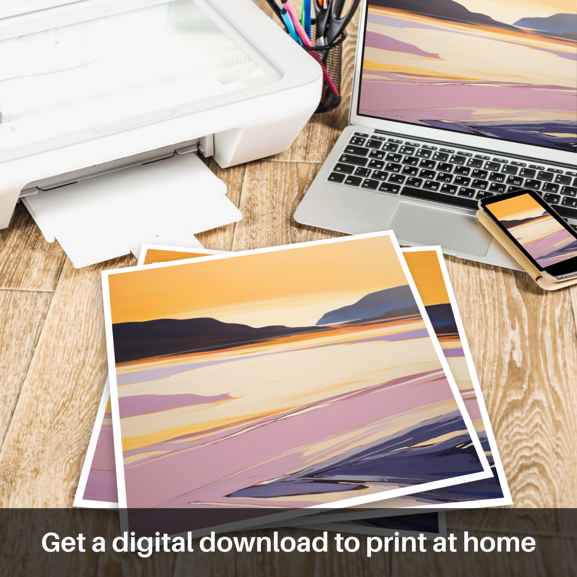Embrace a touch of the sublime with this alluring vista, designed to transport you to the rugged and peaceful coasts of Scotland. Whether as a focal point in the living space or a meditative piece in a private study, this print promises to imbue any room with the tranquil essence of a Scottish cove at dusk.