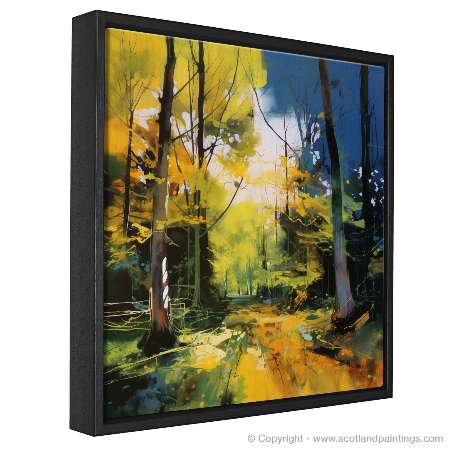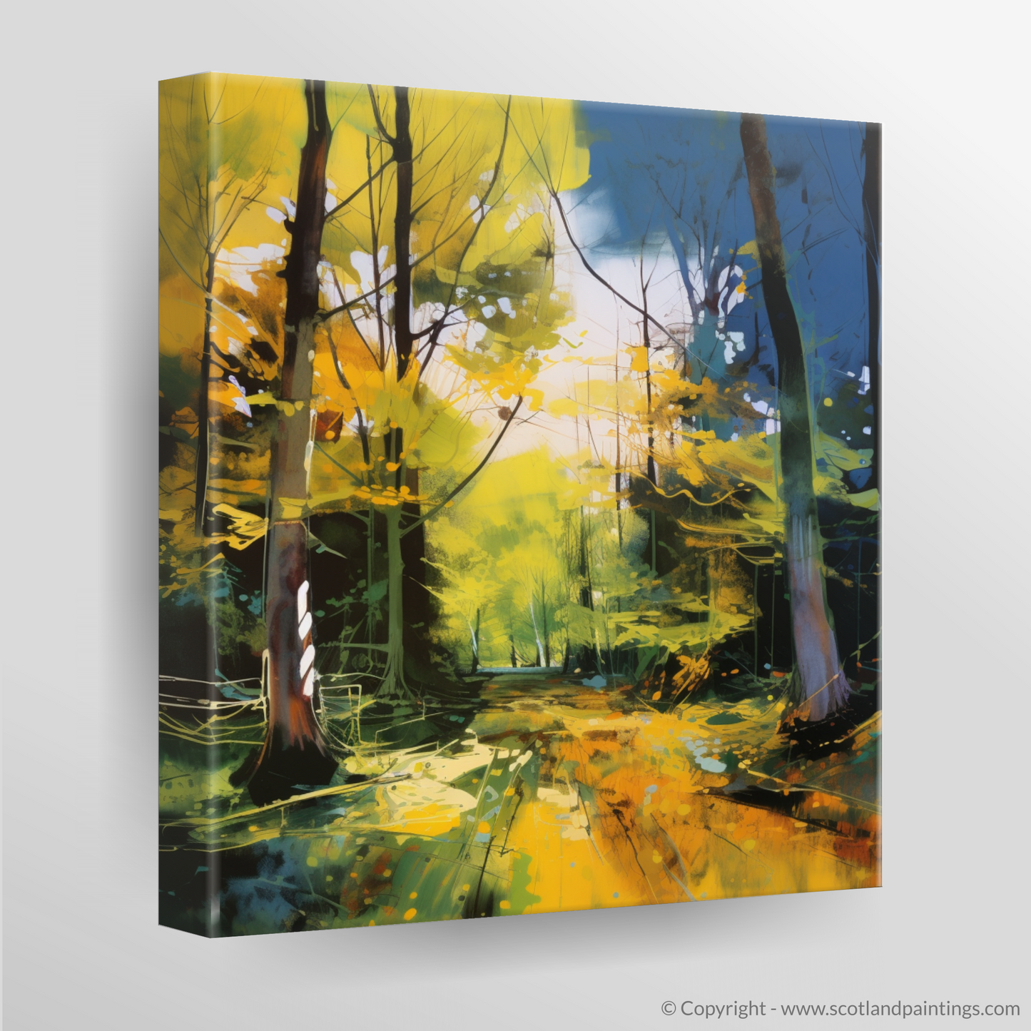 Vivid splashes of canary yellow, emerald green, and sky blue dance across the canvas, evoking the dappled sunlight filtering through the lush, leafy canopy overhead. Bold, abstracted forms and dynamic brushstrokes instil a sense of movement, as if a gentle breeze were rustling the leaves and bending the boughs.