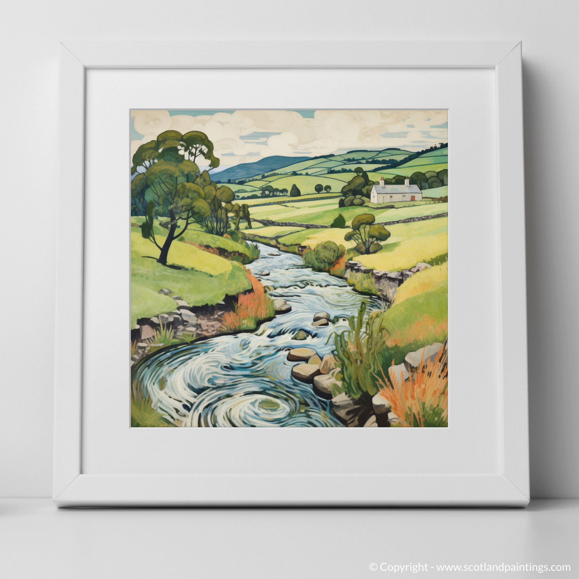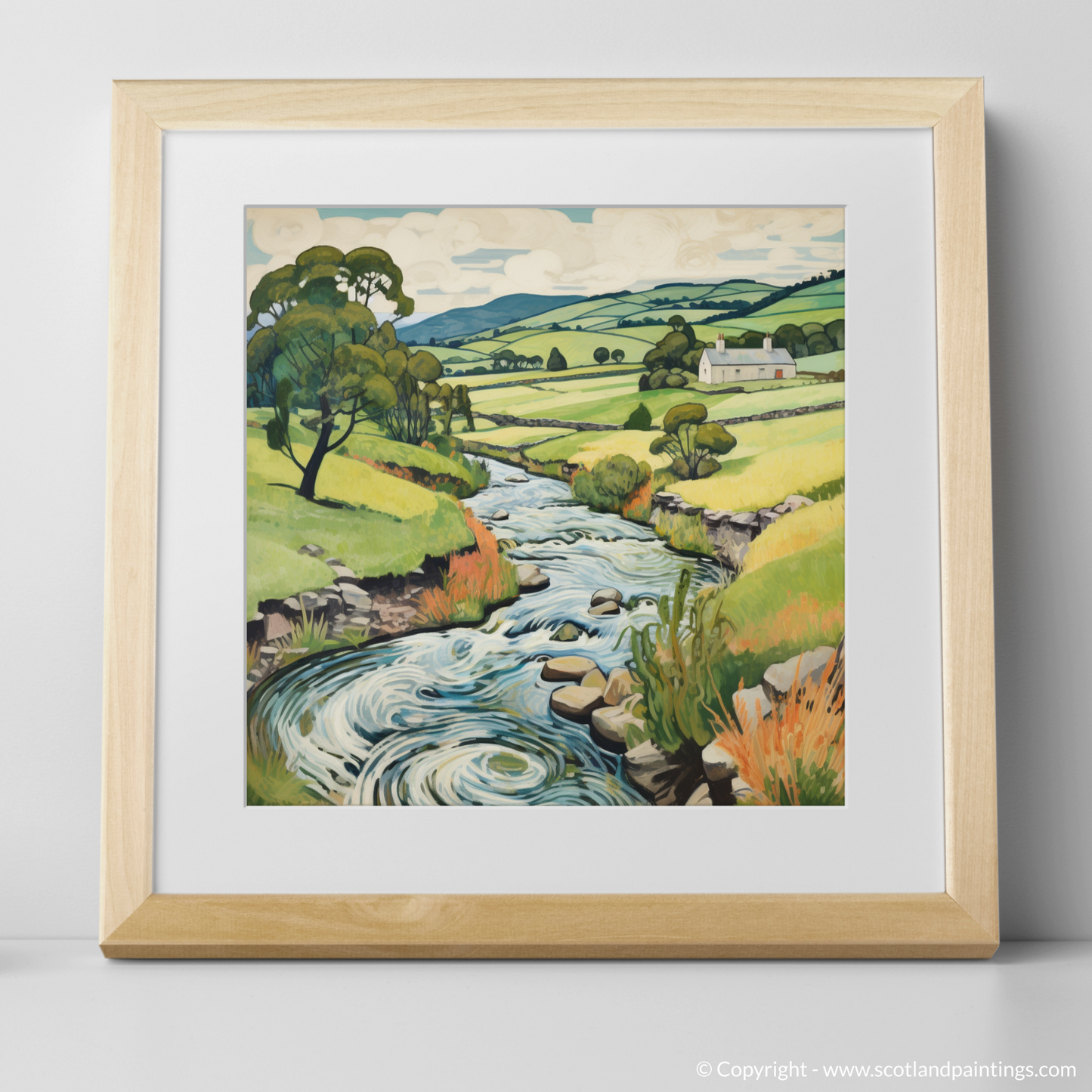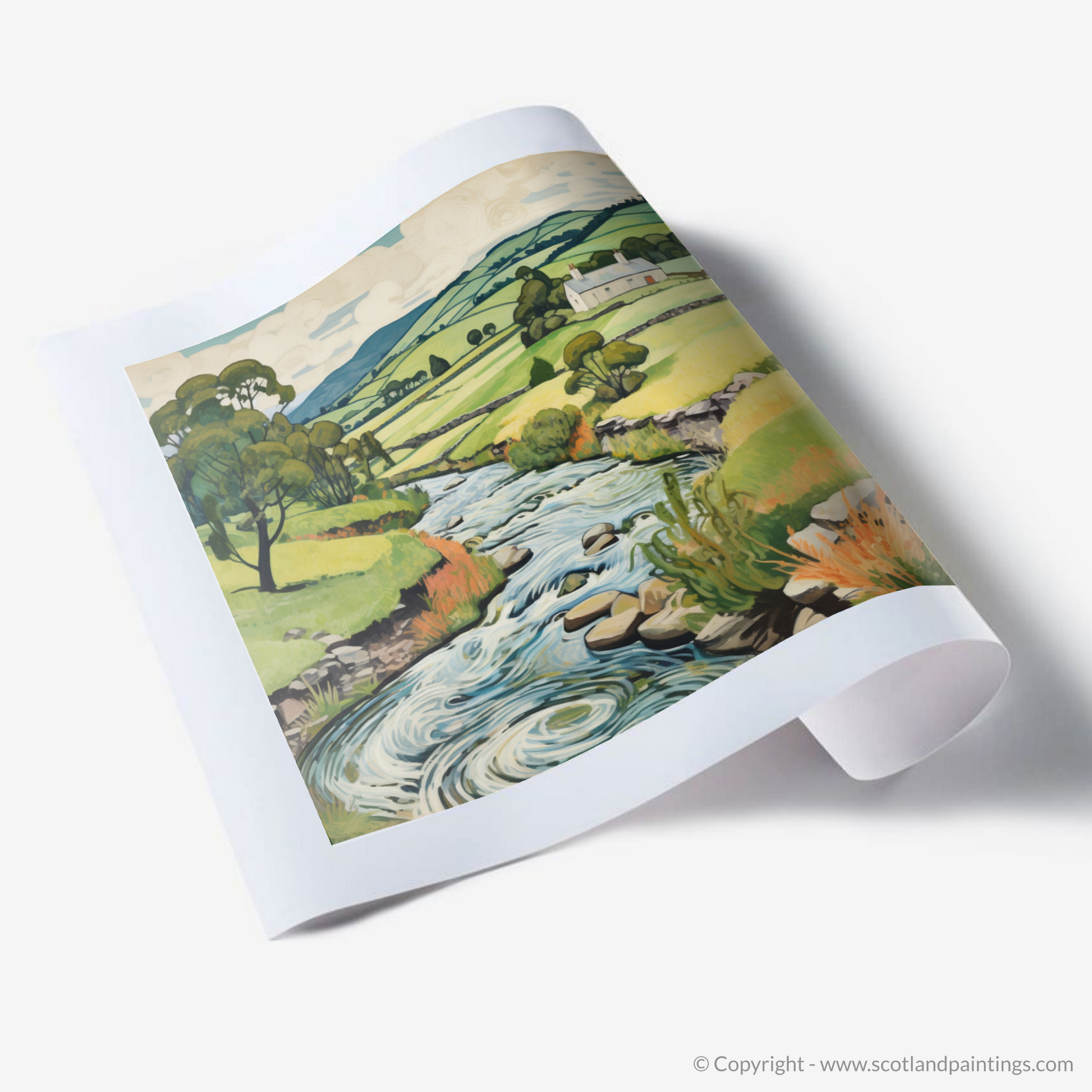 Every brushstroke articulates the ebullient spirit of nature, while the exaggerated contours of the landscape invite the eye on an illustrative journey that echoes the tranquil pace of Scottish life. Notice the multitude of textures in the print – from the smooth stones peppering the riverbed to the tactile grasses edging the waterway, and the soft undulations of the distant hills.