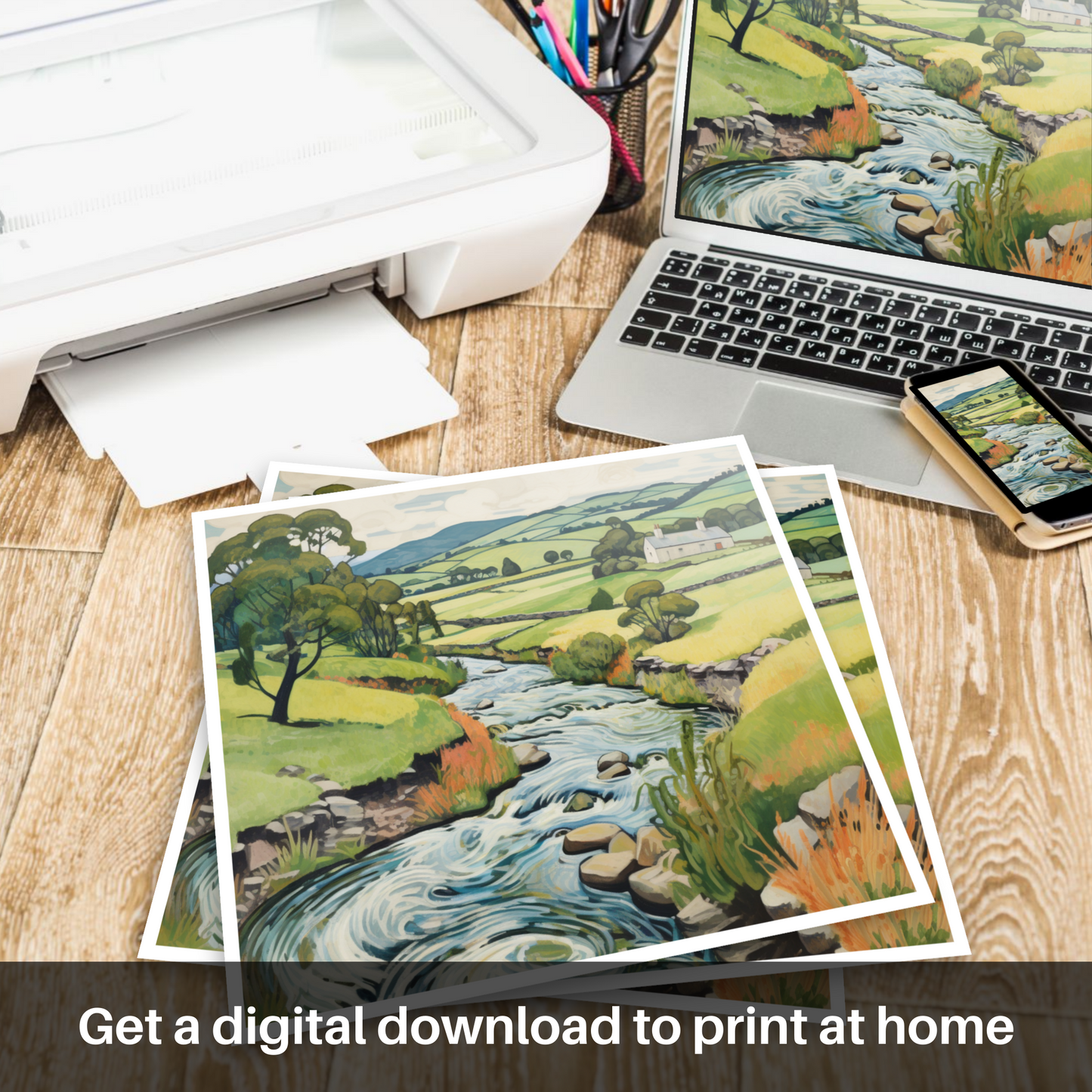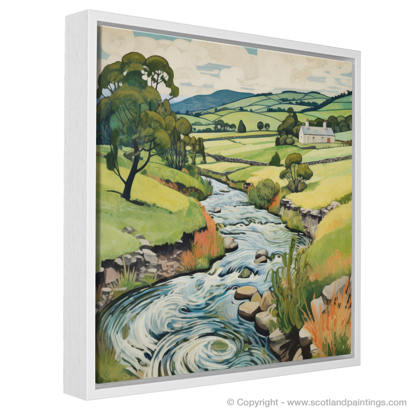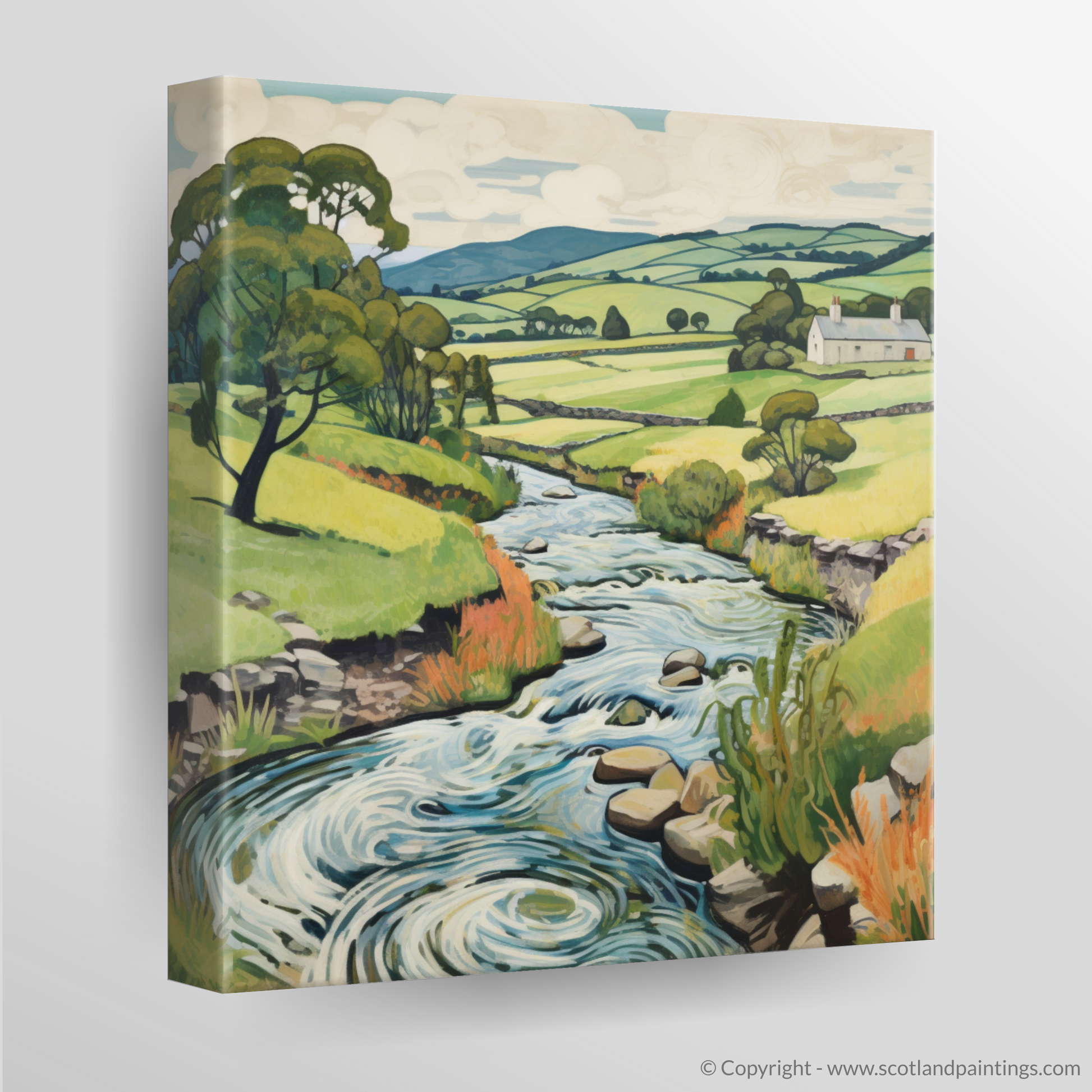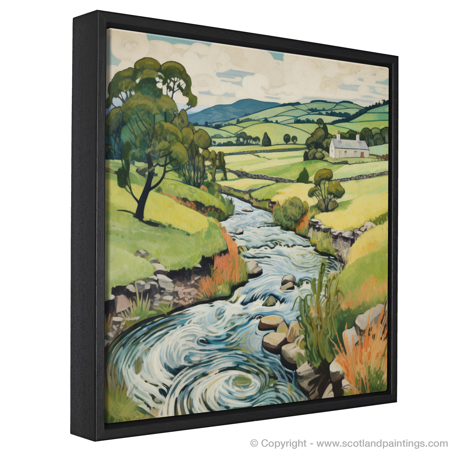 Every brushstroke articulates the ebullient spirit of nature, while the exaggerated contours of the landscape invite the eye on an illustrative journey that echoes the tranquil pace of Scottish life. Notice the multitude of textures in the print – from the smooth stones peppering the riverbed to the tactile grasses edging the waterway, and the soft undulations of the distant hills.
