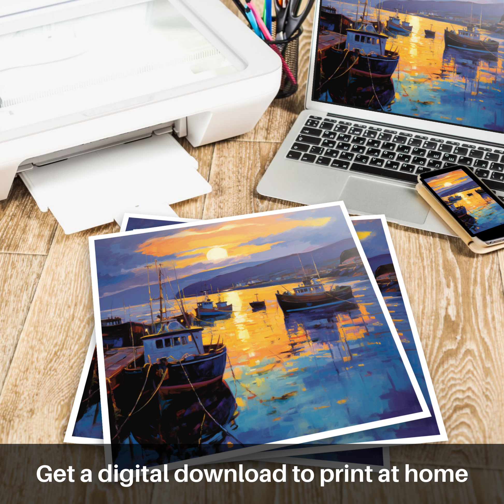 The silhouettes of distant hills frame the scene, shadowy and enigmatic, further drawing the eye to the brilliance of the sky above and its reflection below. This print, part of the 'Scottish Harbours' collection, is an ode to the quiet magnificence of the Scottish coastline at the most magical time of day - a testament to the ephemeral beauty of nature, eternally preserved in this still moment. Add this piece to your collection and let the serene beauty of Millport Harbour at dusk wash over your space with its harmonious palette and soothing ambiance.