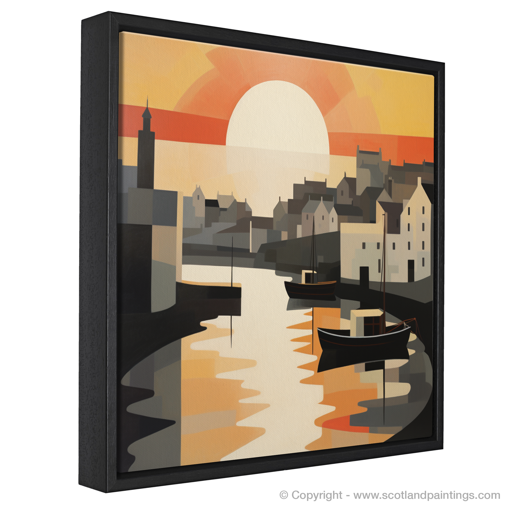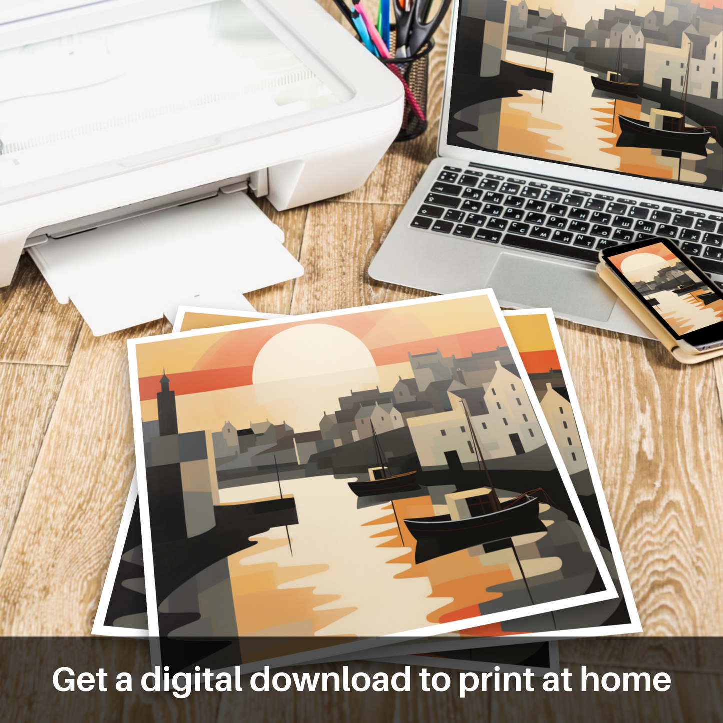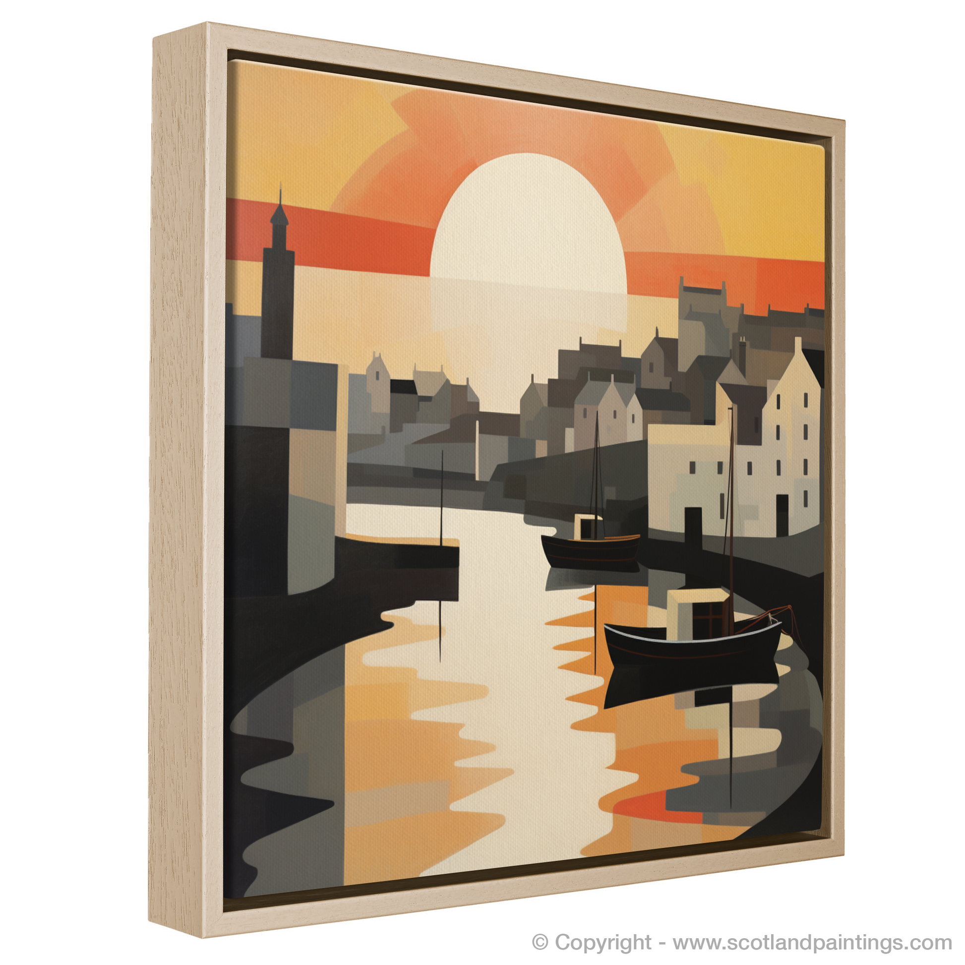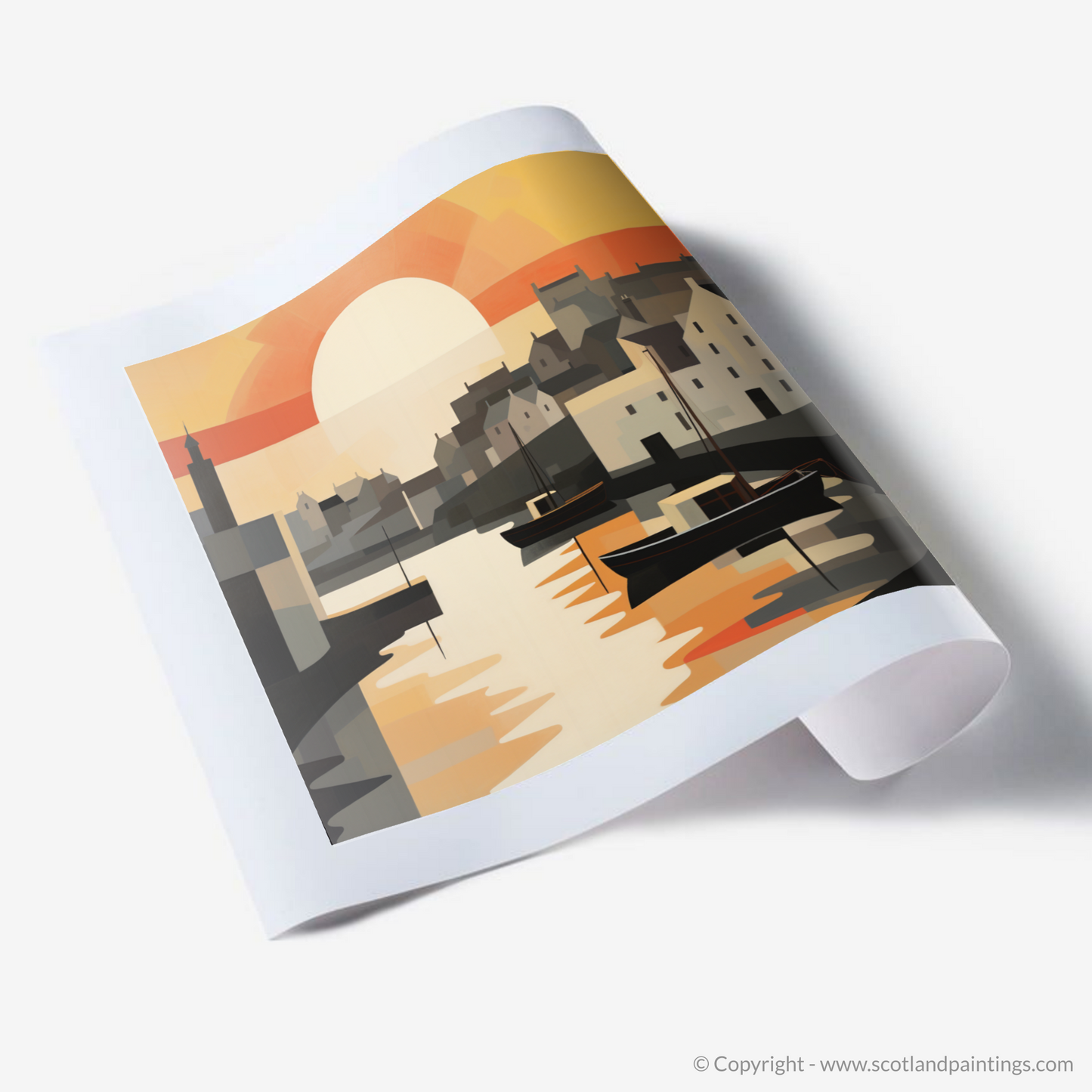 As the sun makes its majestic descent, the print brings to life the warm glow that illuminates the quaint harbour. The large, unembellished shapes and a restrained colour palette depict the charming silhouetted buildings against a softly glowing sky, echoing the quietude of the scene.