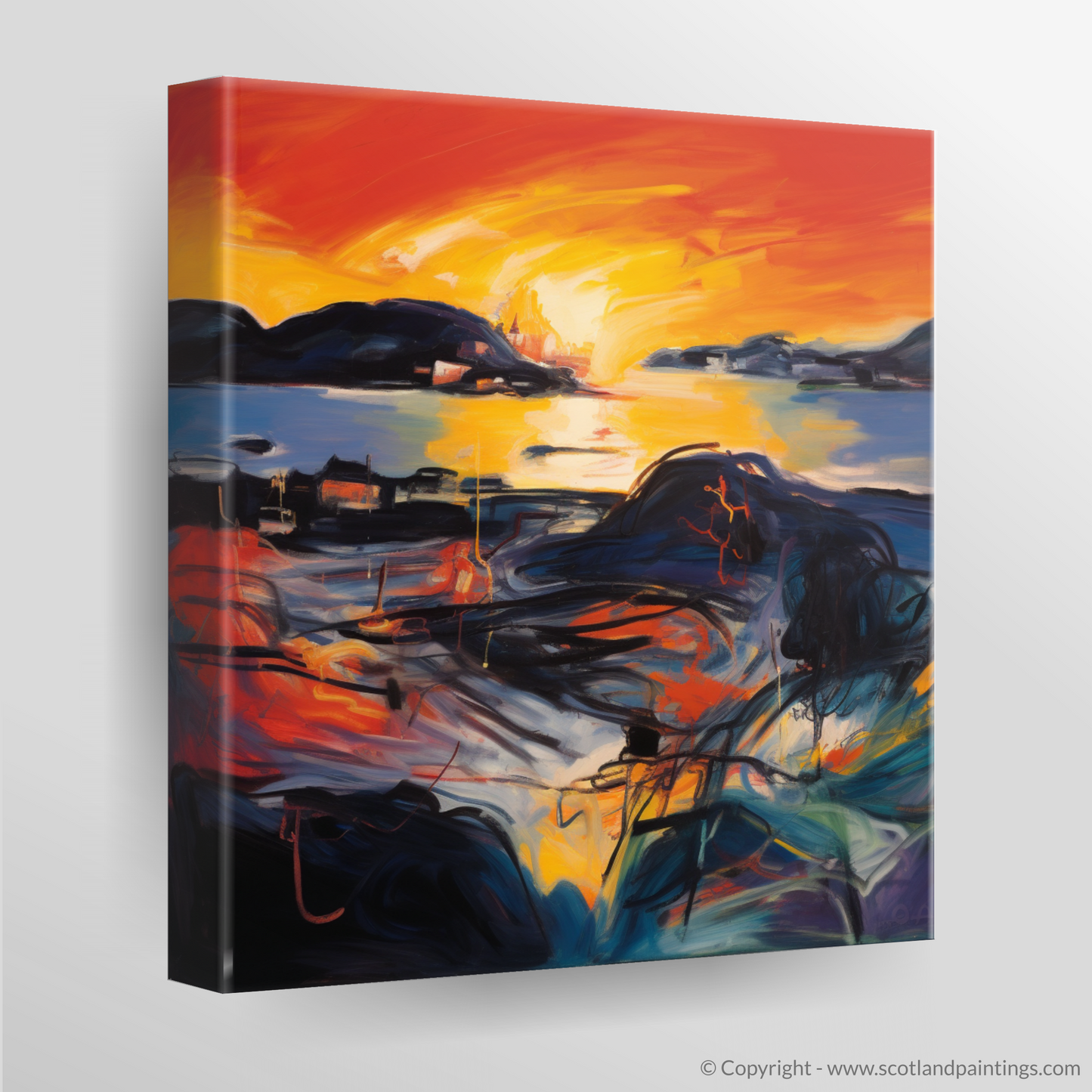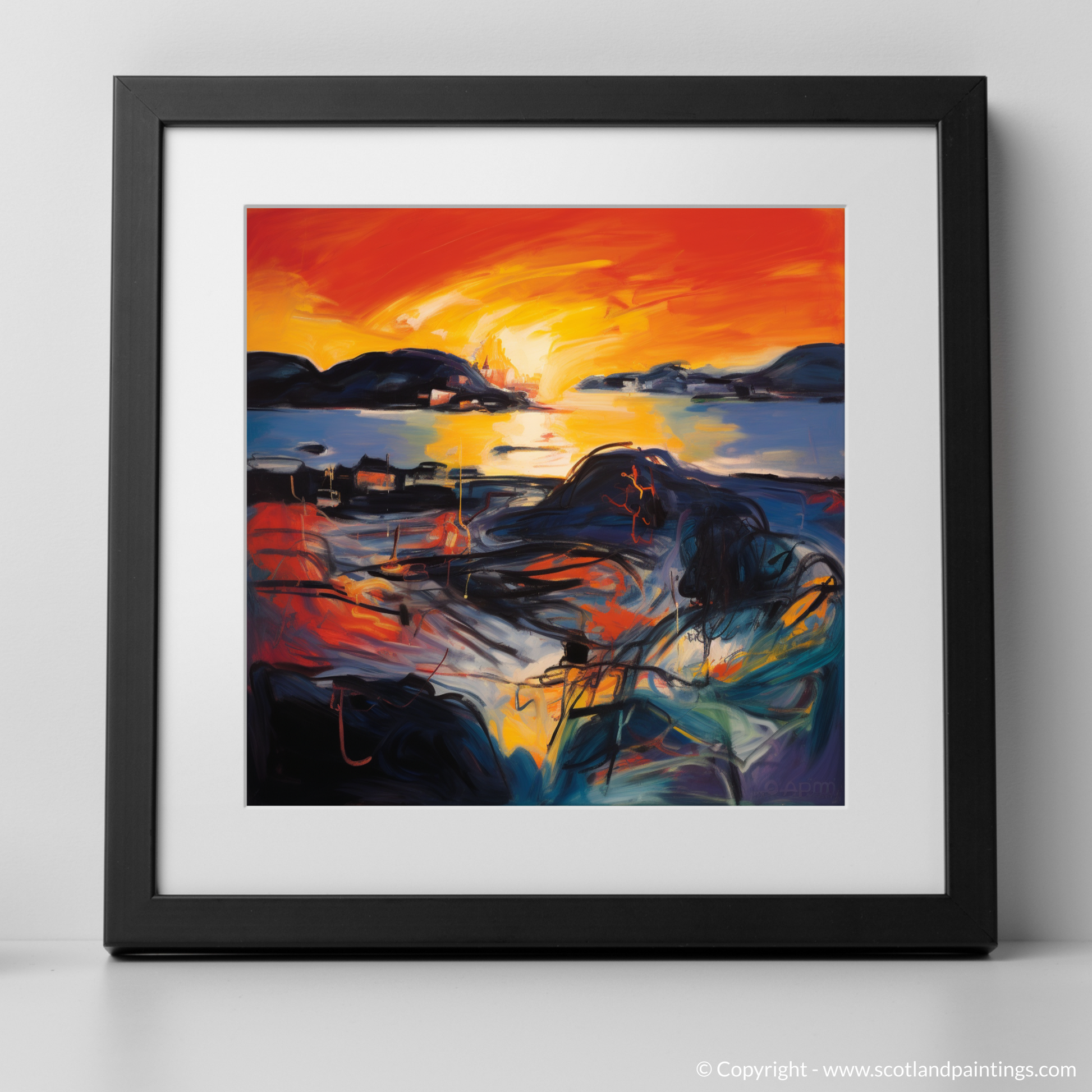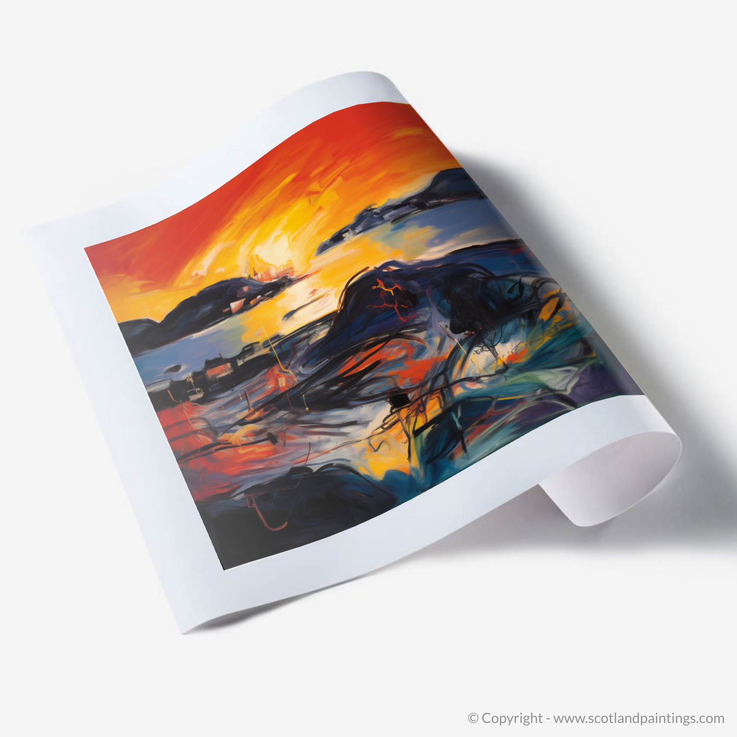 As the day's final embers of light blaze along the horizon, this captivating print evokes the essence of Gairloch Harbour as it basks in the ethereal glow of sunset. A symphony of vibrant oranges and yellows dances across the canvas, intertwining with bold reds and deep blues to create a scene that pulsates with life and movement. The abstract expressionist style injects a visceral energy into the tranquil Scottish coastal setting, inviting onlookers to experience the melodious harmony of colour and form.