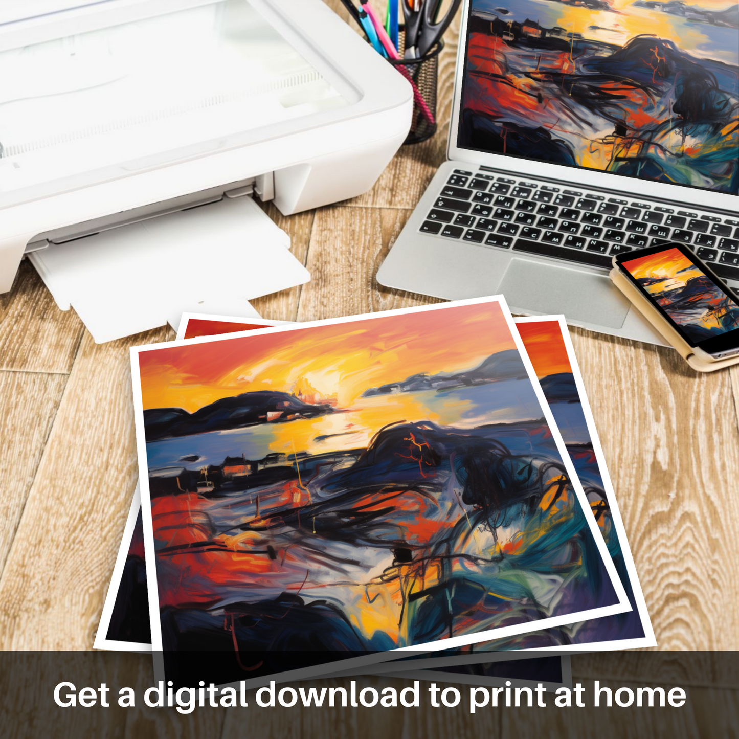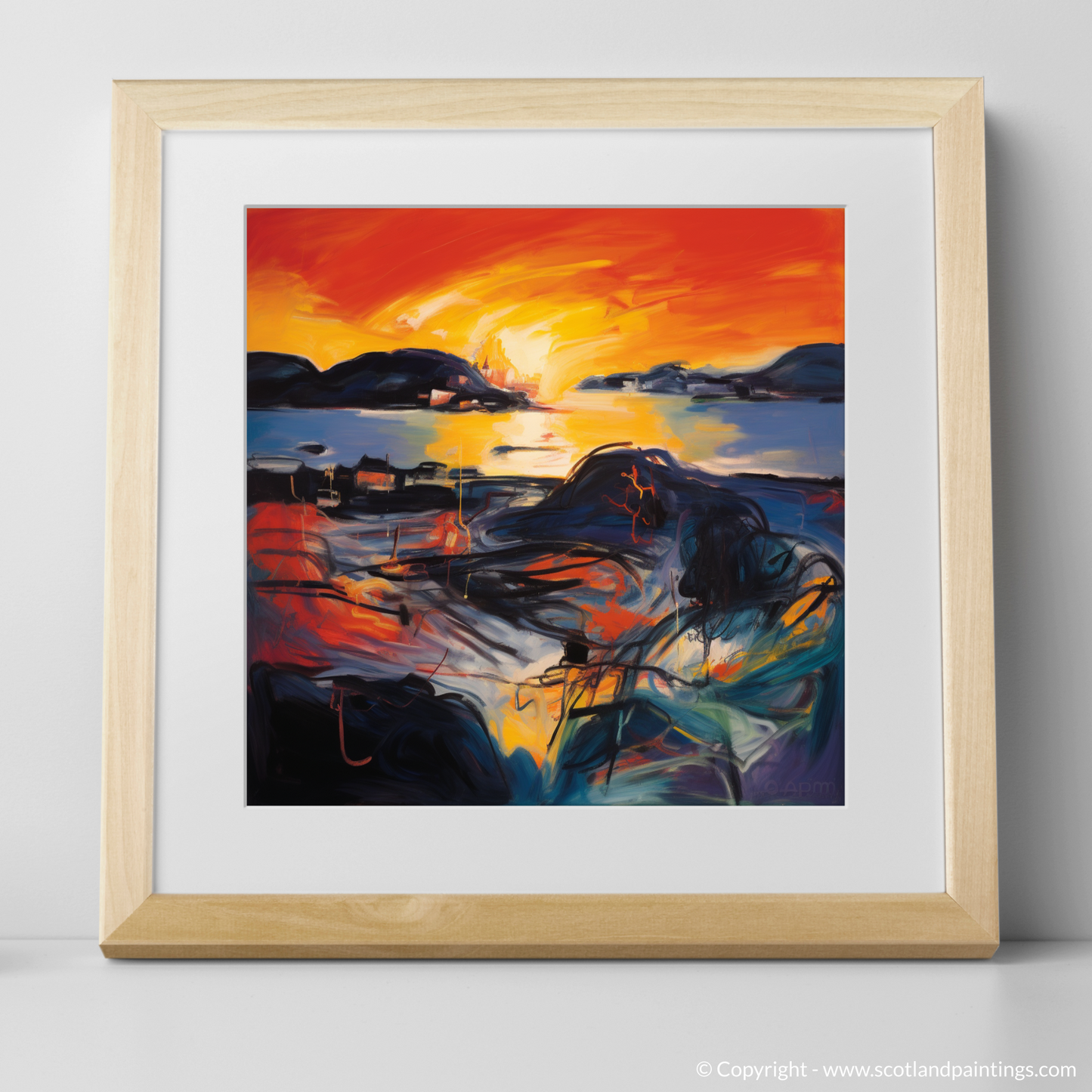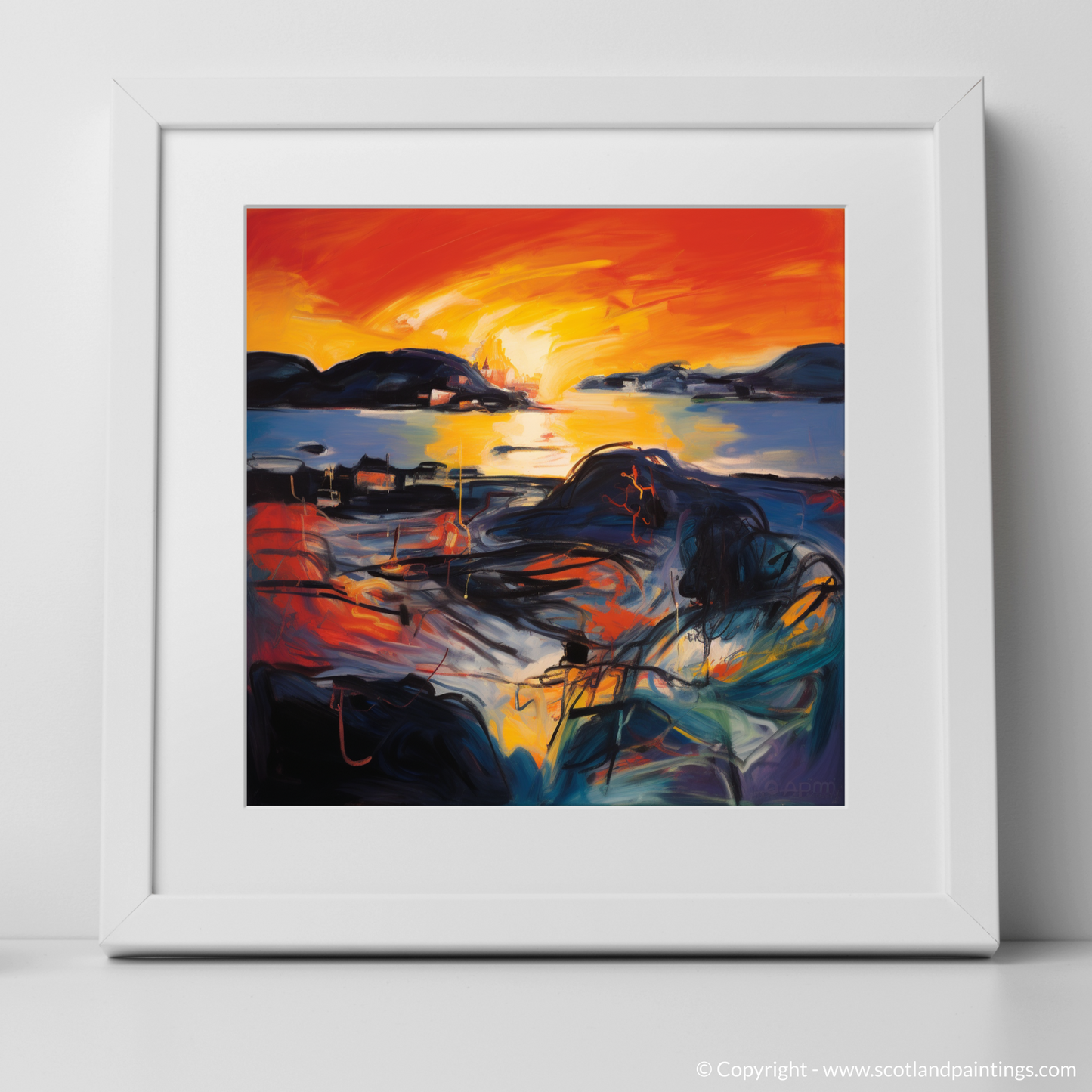 As the day's final embers of light blaze along the horizon, this captivating print evokes the essence of Gairloch Harbour as it basks in the ethereal glow of sunset. A symphony of vibrant oranges and yellows dances across the canvas, intertwining with bold reds and deep blues to create a scene that pulsates with life and movement. The abstract expressionist style injects a visceral energy into the tranquil Scottish coastal setting, inviting onlookers to experience the melodious harmony of colour and form.
